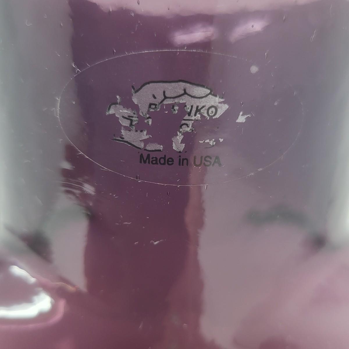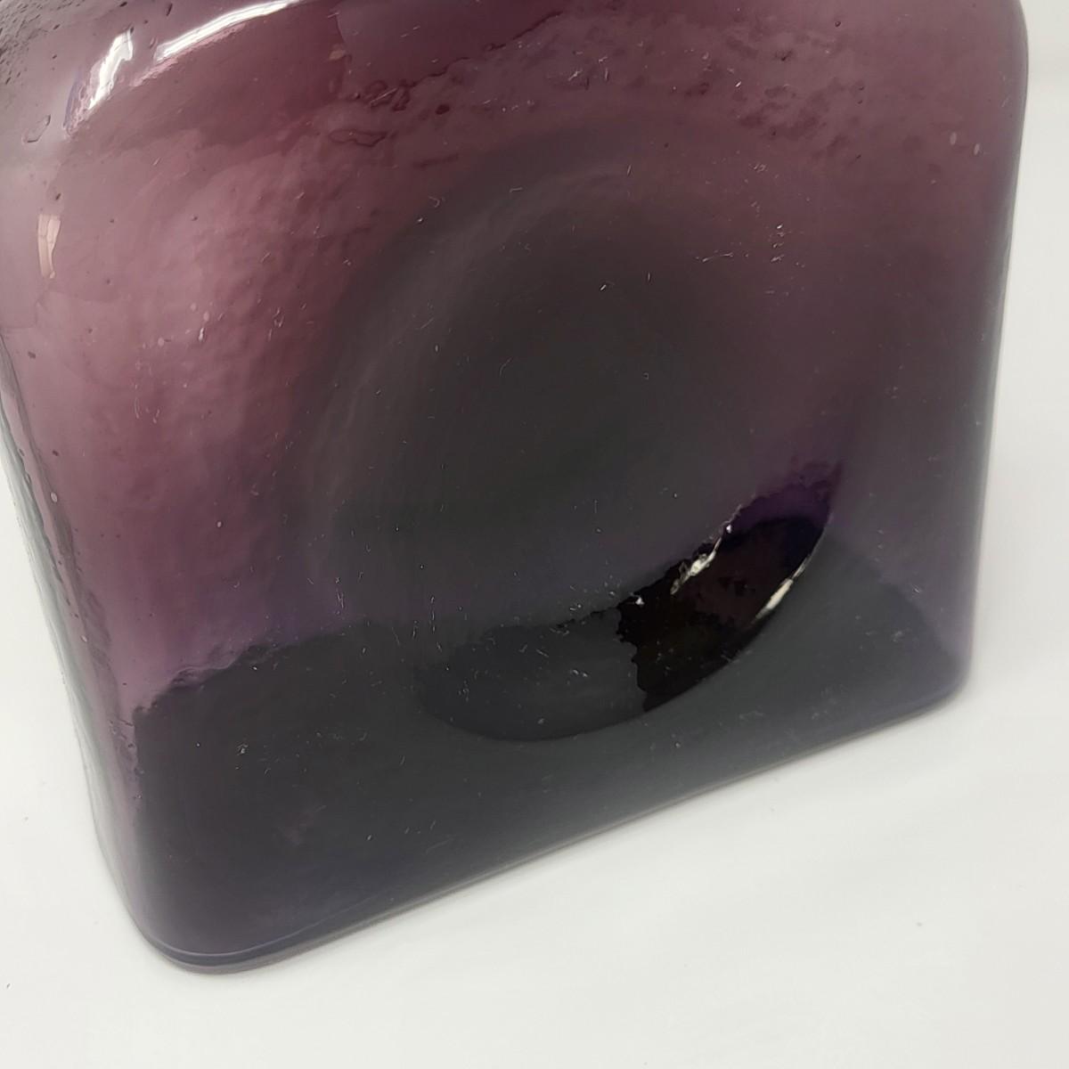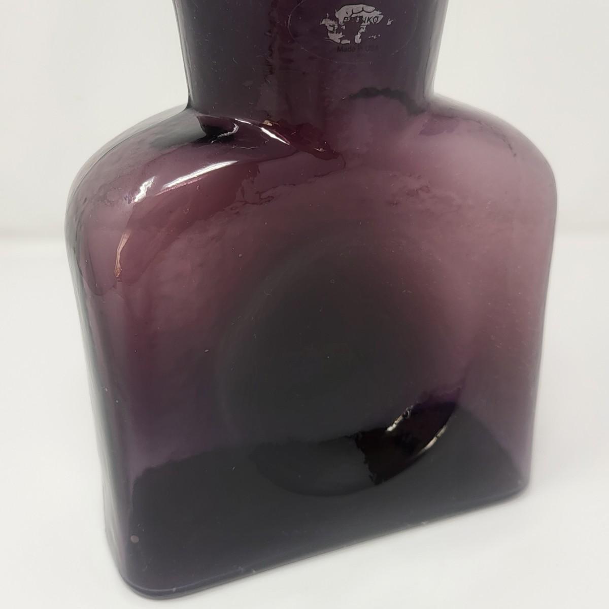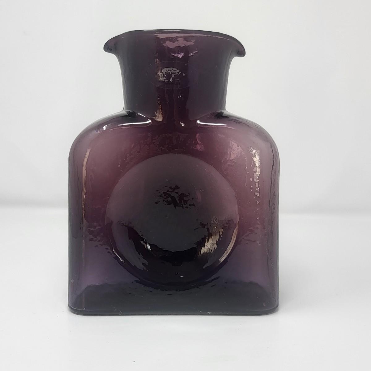 Eggplant/Purple Blenko glass double spout water pitcher. Blenko sticker faded but still partially readable. Center indentations on both sides make it easier to hold and pour. It measures 8 " tall x 6.25" wide x 3" deep. Made in USA.