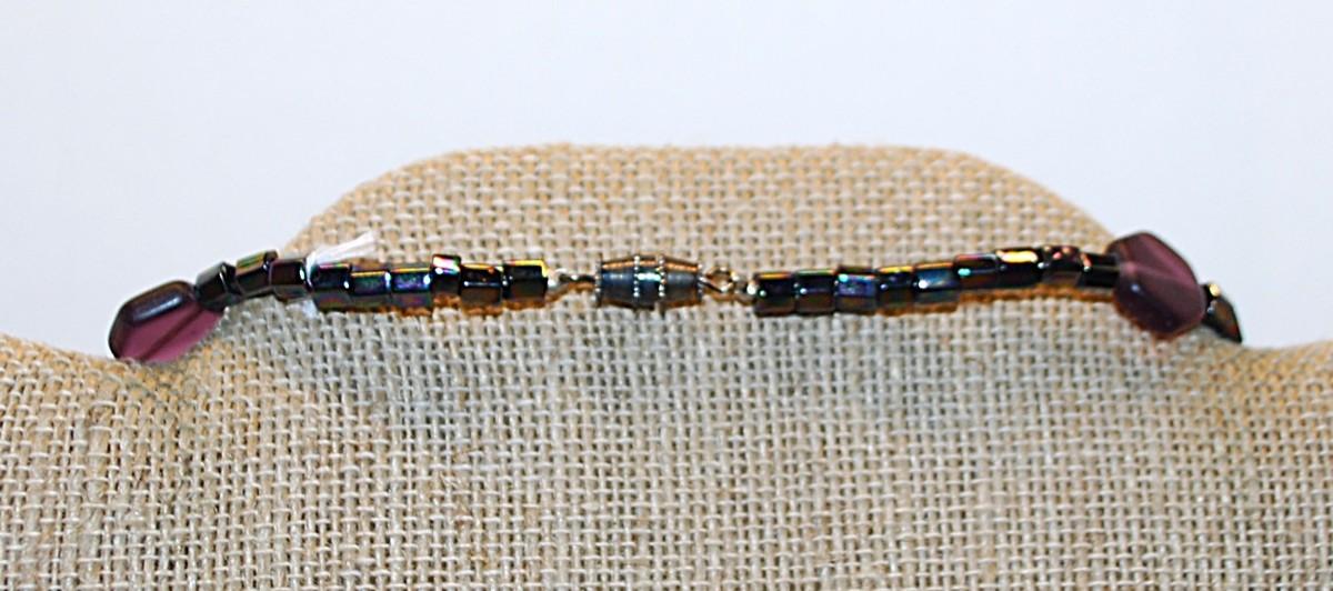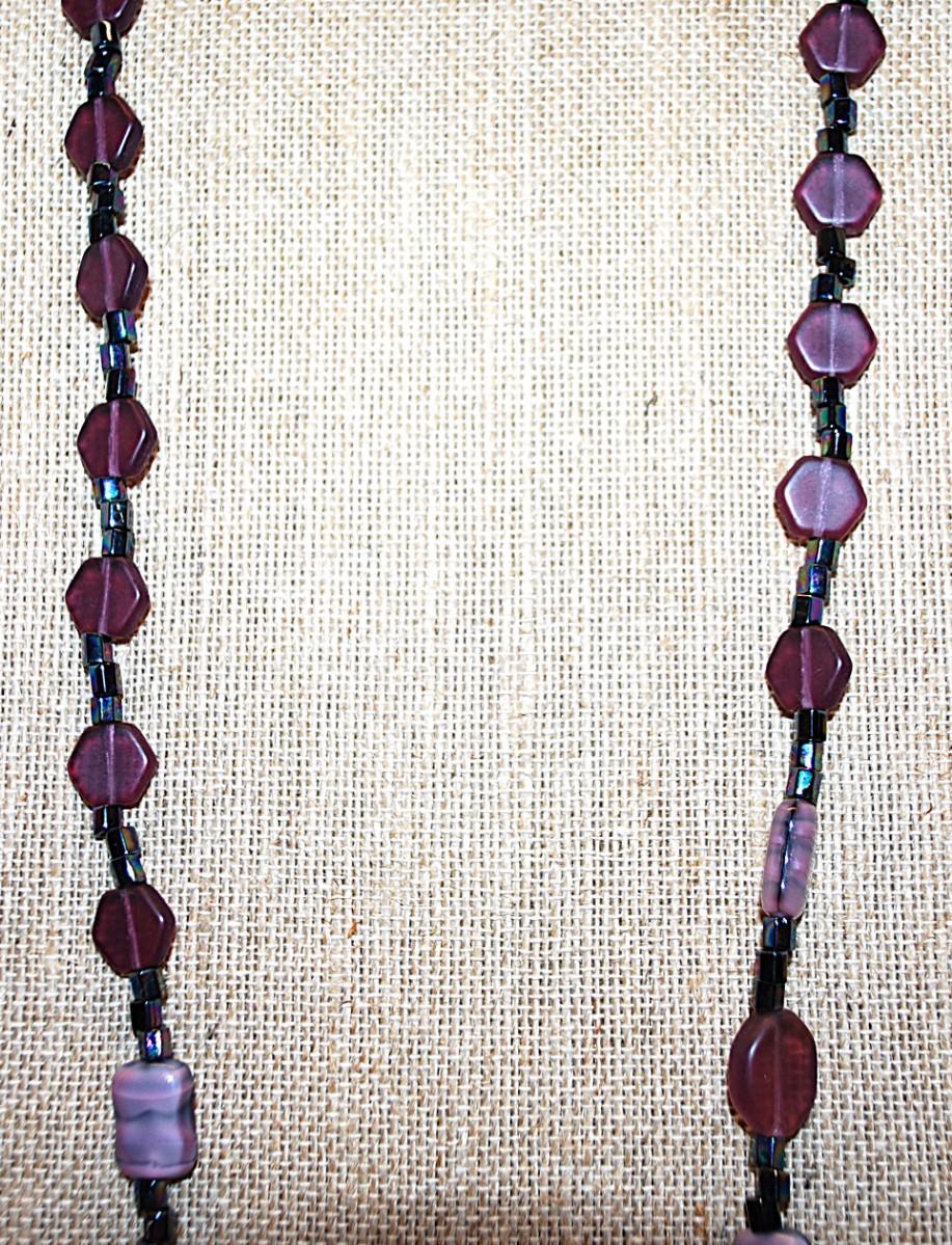 Deep Purple Hex, Oval & Rectangle Shaped ACRYLIC BEAD NECKLACE with Black Spacers and Barrel Screw Clasp 26" L