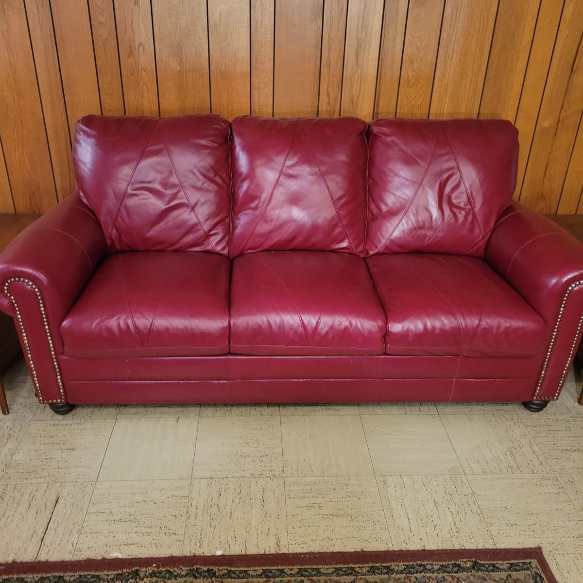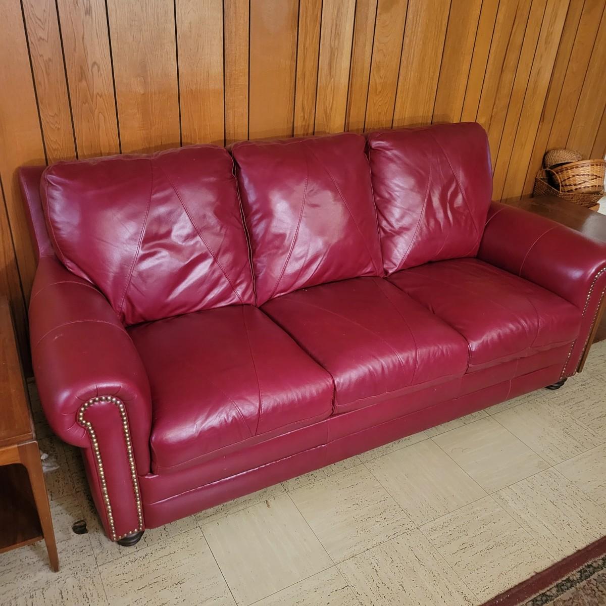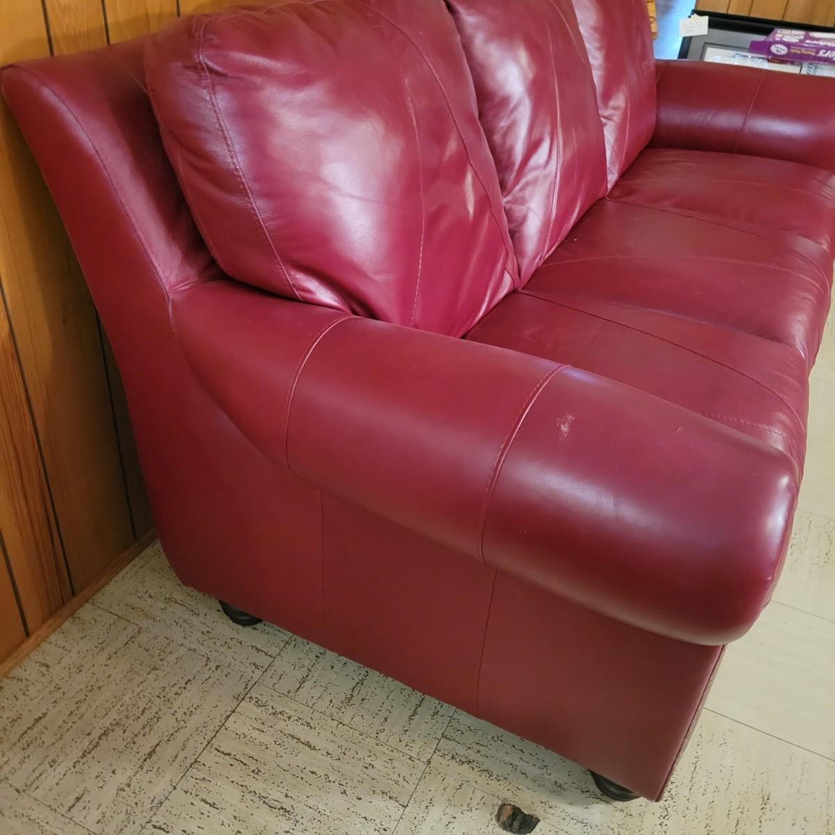 A deep red leather couch that measures approximately 82" x 40" x 38"H. There are a few minor blemishes, please see attached pictures for more detail. Cushions on the couch are attached Local pickup only
