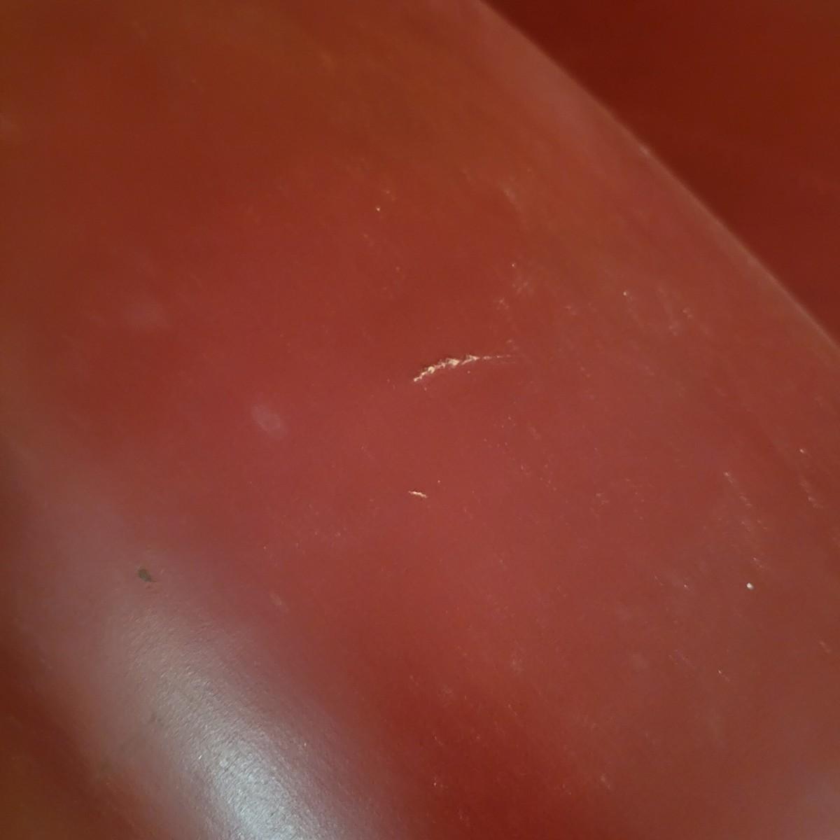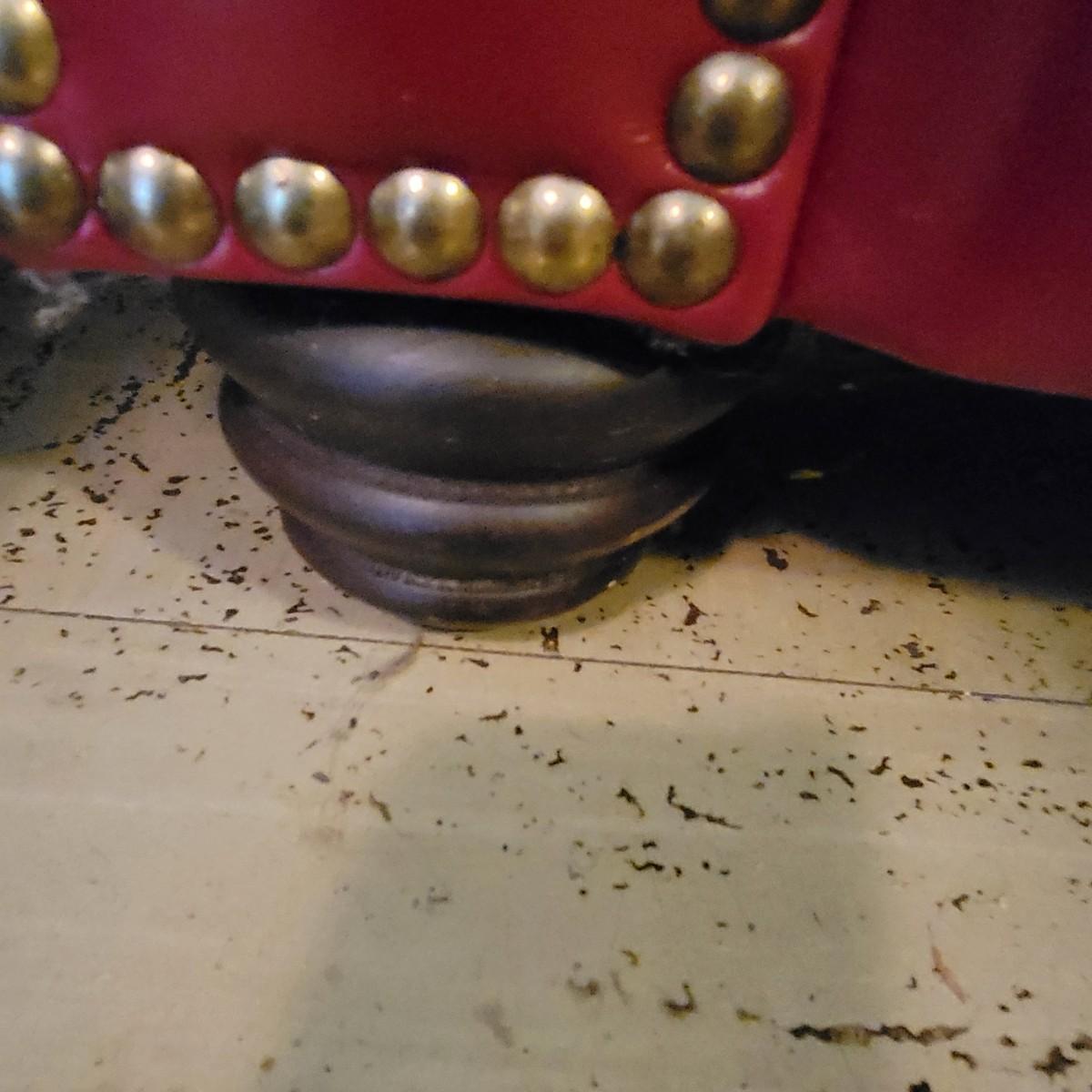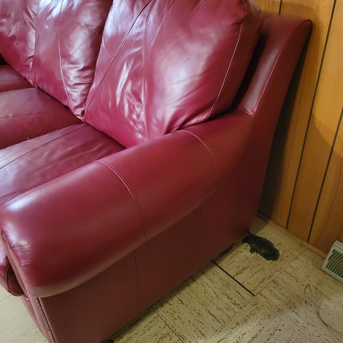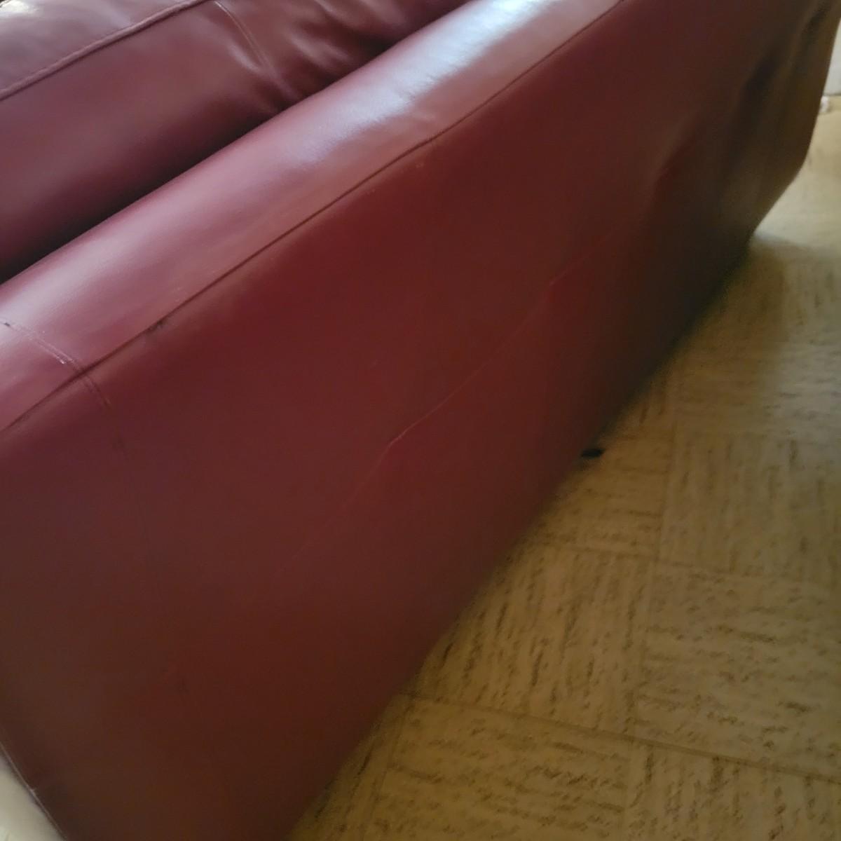 A deep red leather couch that measures approximately 82" x 40" x 38"H. There are a few minor blemishes, please see attached pictures for more detail. Cushions on the couch are attached Local pickup only