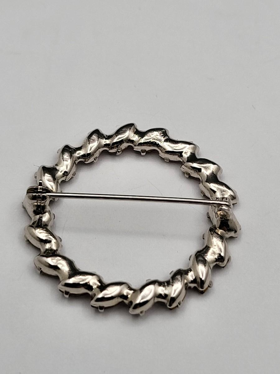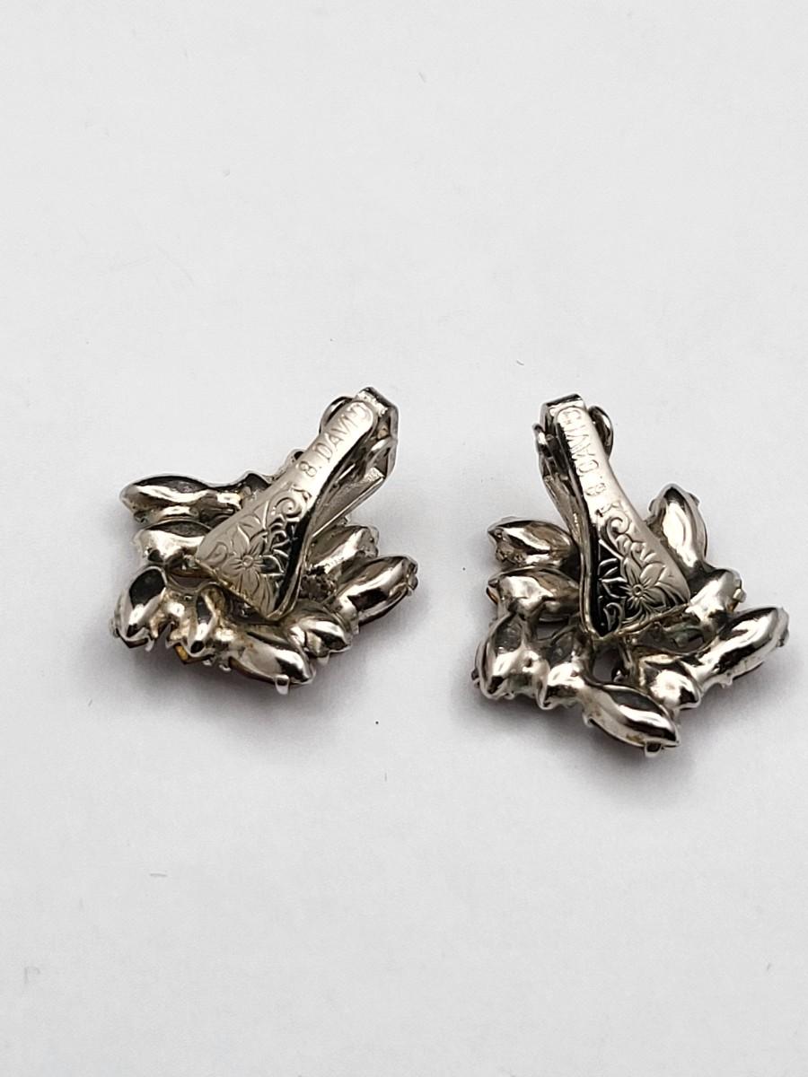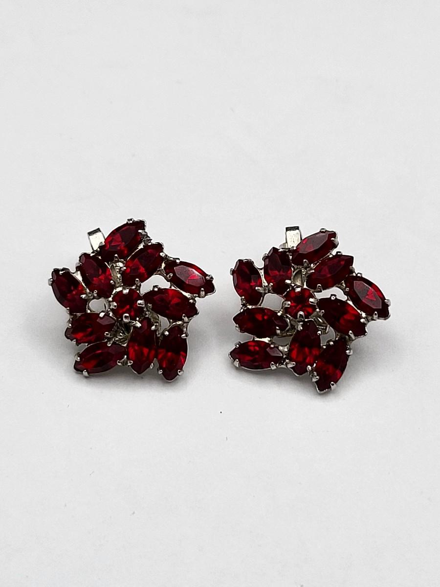 Vintage but in like-new condition. These have not been worn. Dainty set with deep red rhinestones. Pin is 1.25" diameter and clip earrings are a little over .5". Prong set in silver tone metal. Earrings are signed B. David.