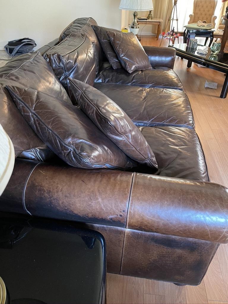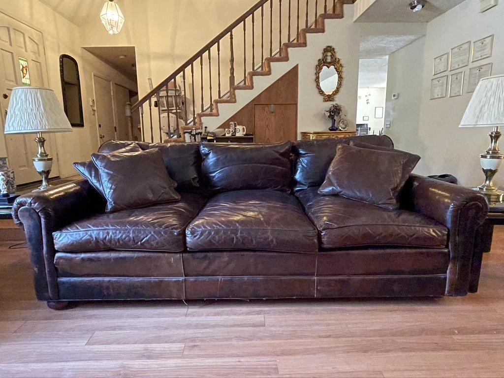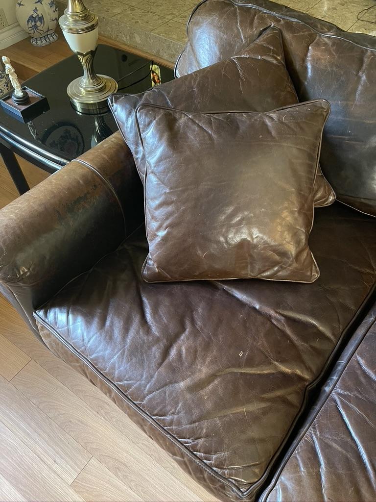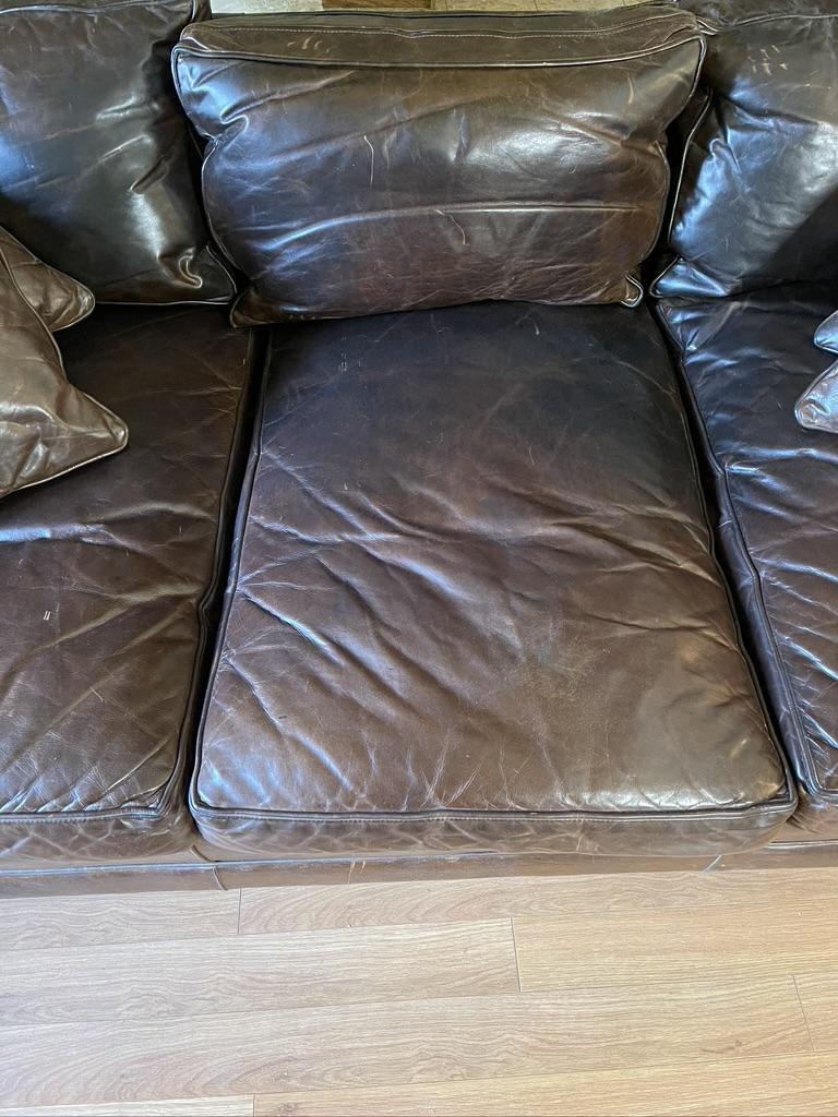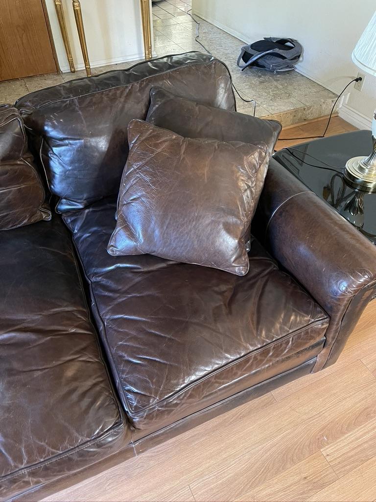 Large cozy brown leather couch with deep seating. Great condition and comes with 4 leather pillows.