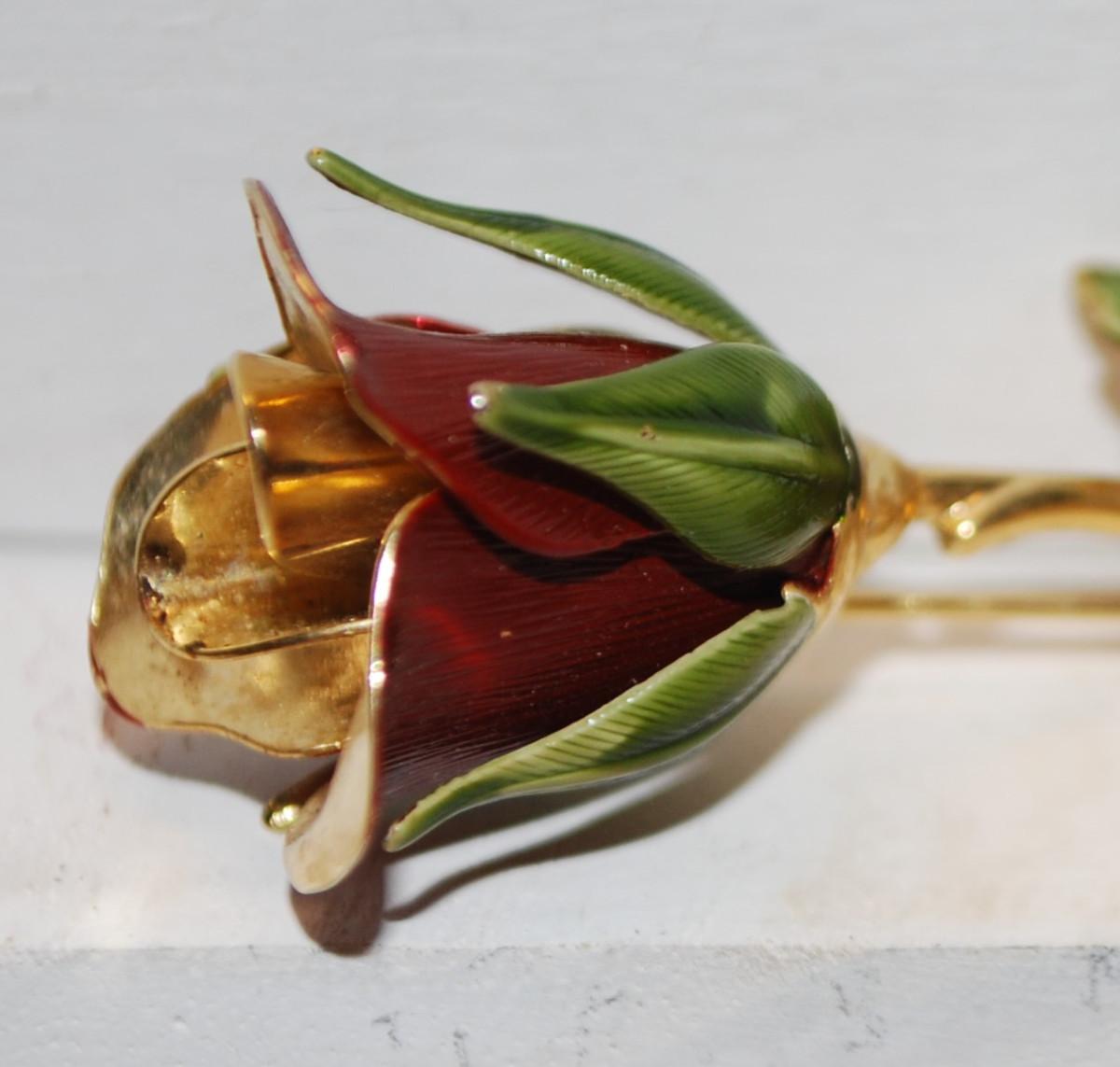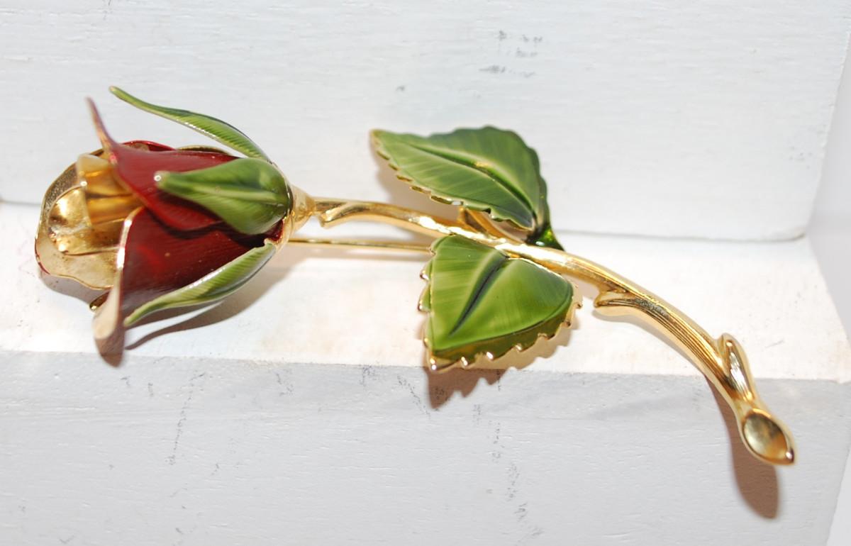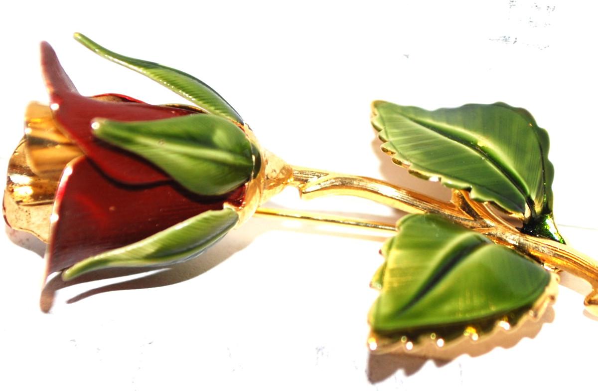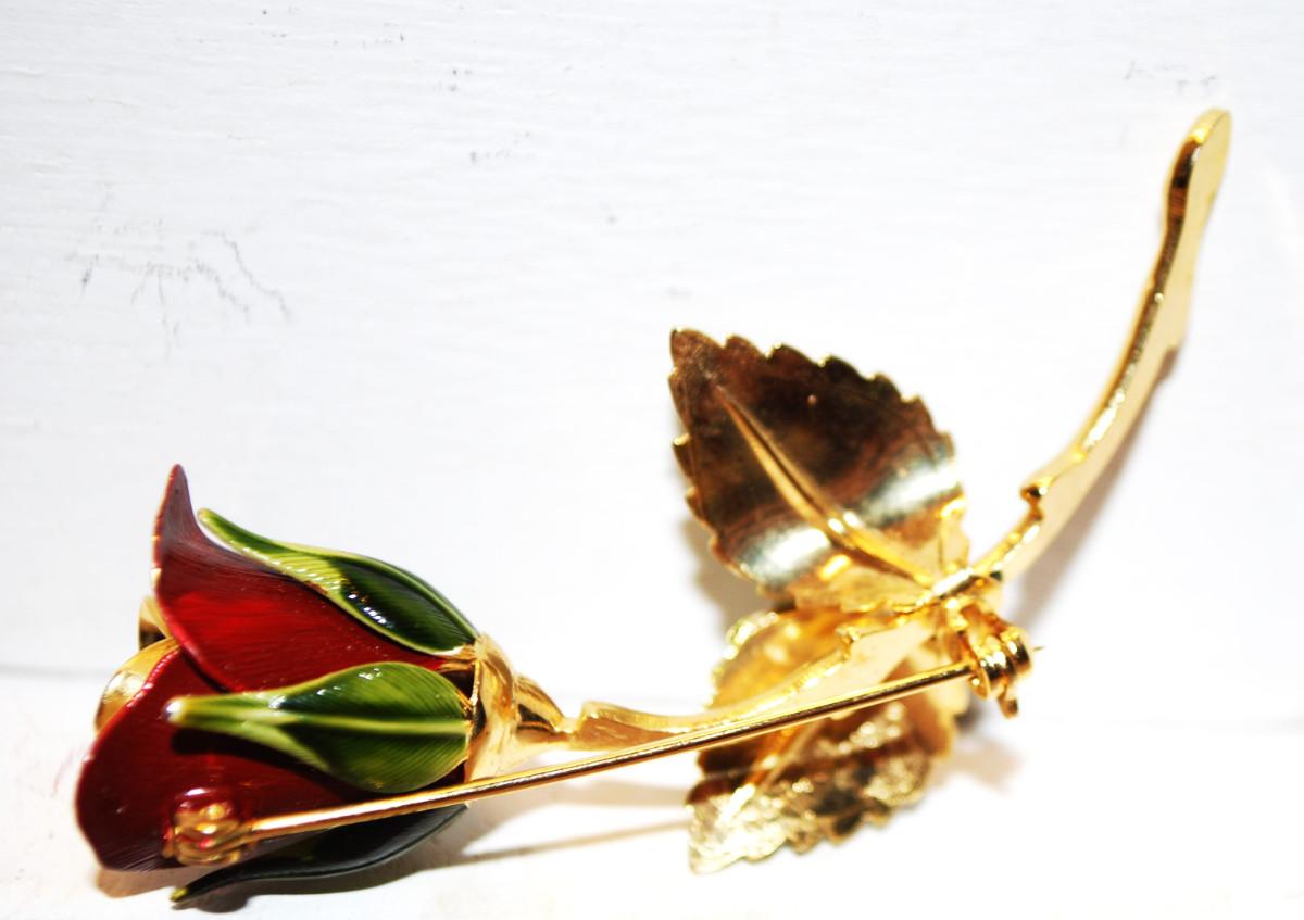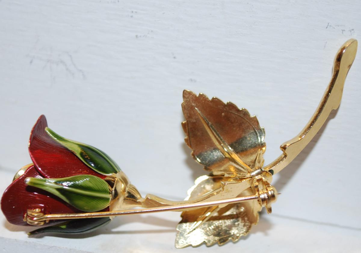 Deep Single Red Rose and Green Leaves Pin 2 1/2" L