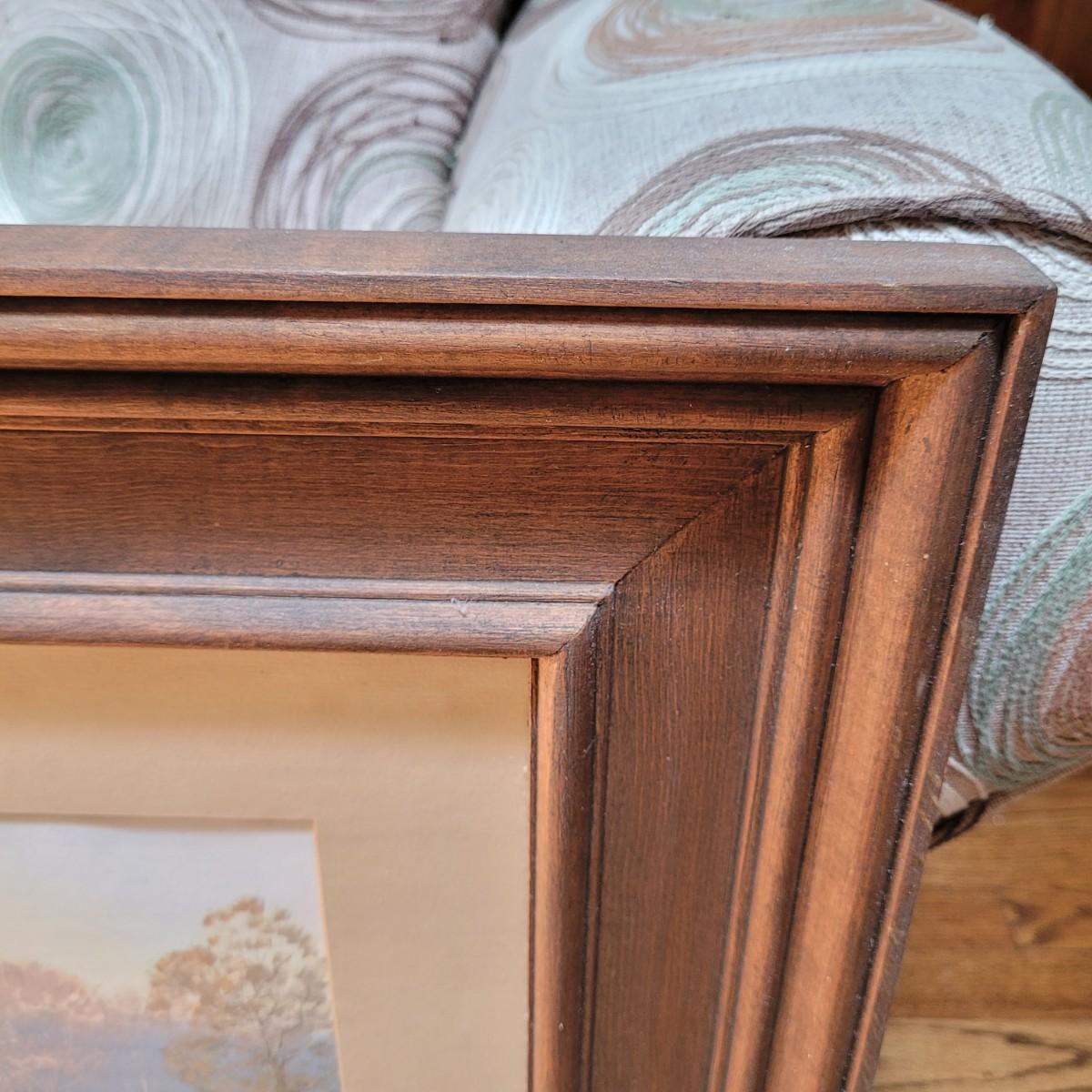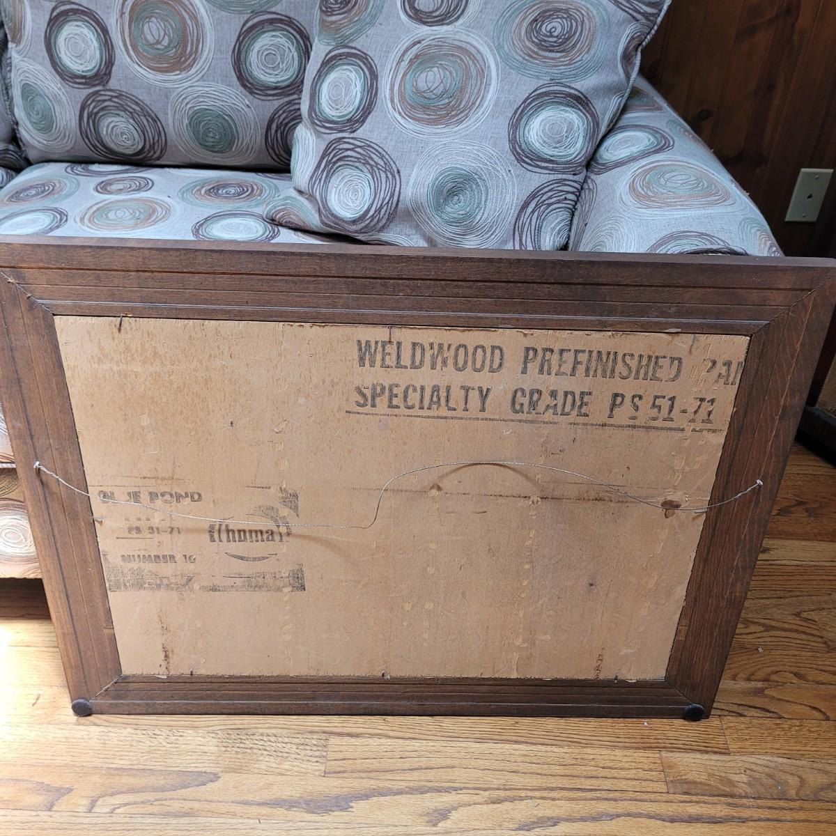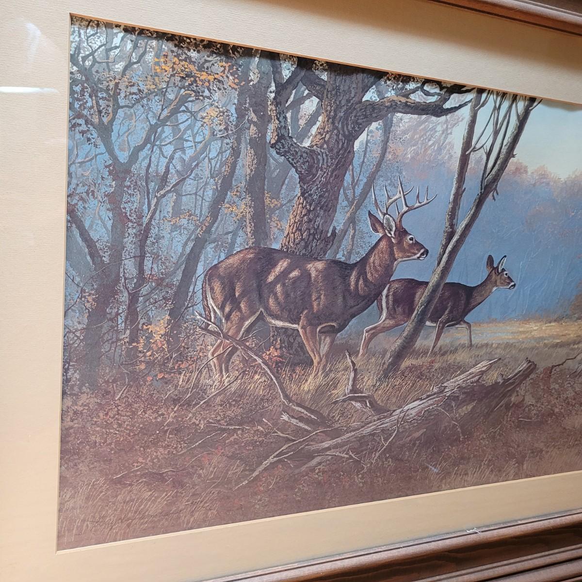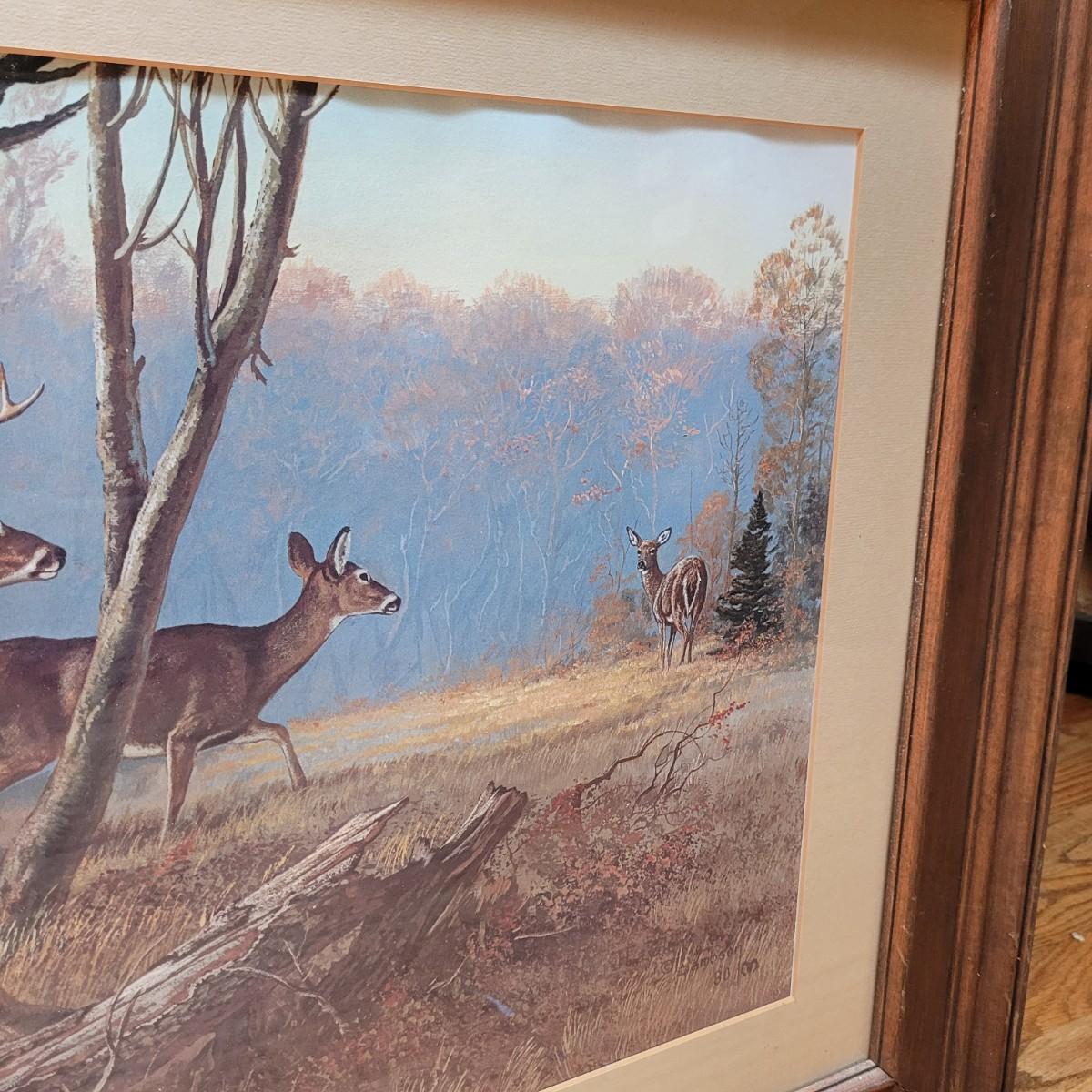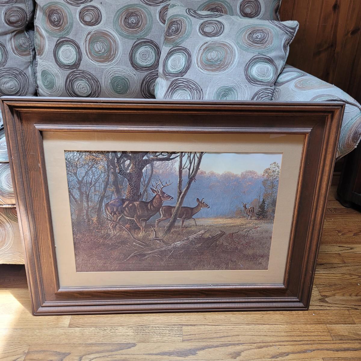 A serene scene of three deer in the woods in a wooden frame. Measures approximately 34" x 26". Shipping available. Shipping can be costly. We suggest contacting our preferred local shipping provider, Postage Express, with dimensions and getting an estimate before bidding: (828) 670-5501 or postageexpress@yahoo.com.