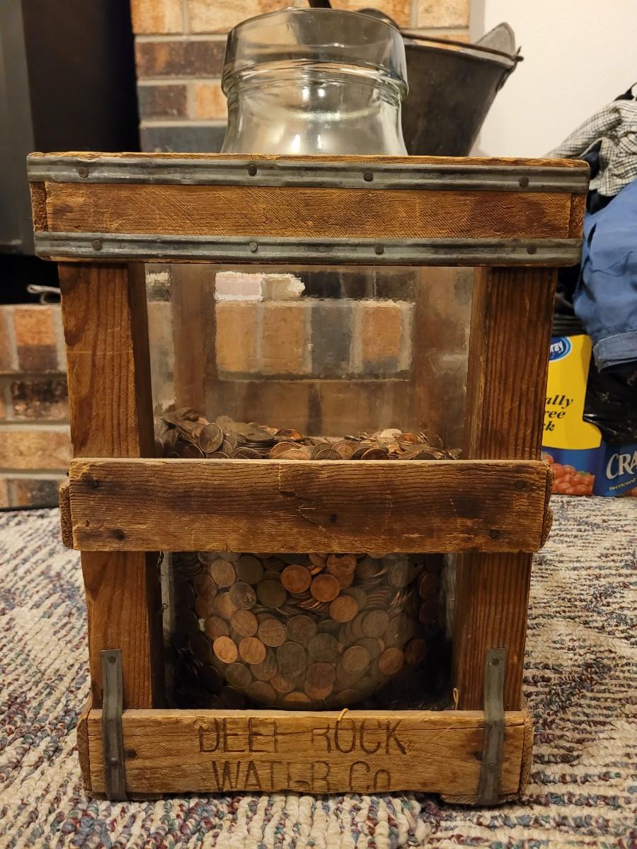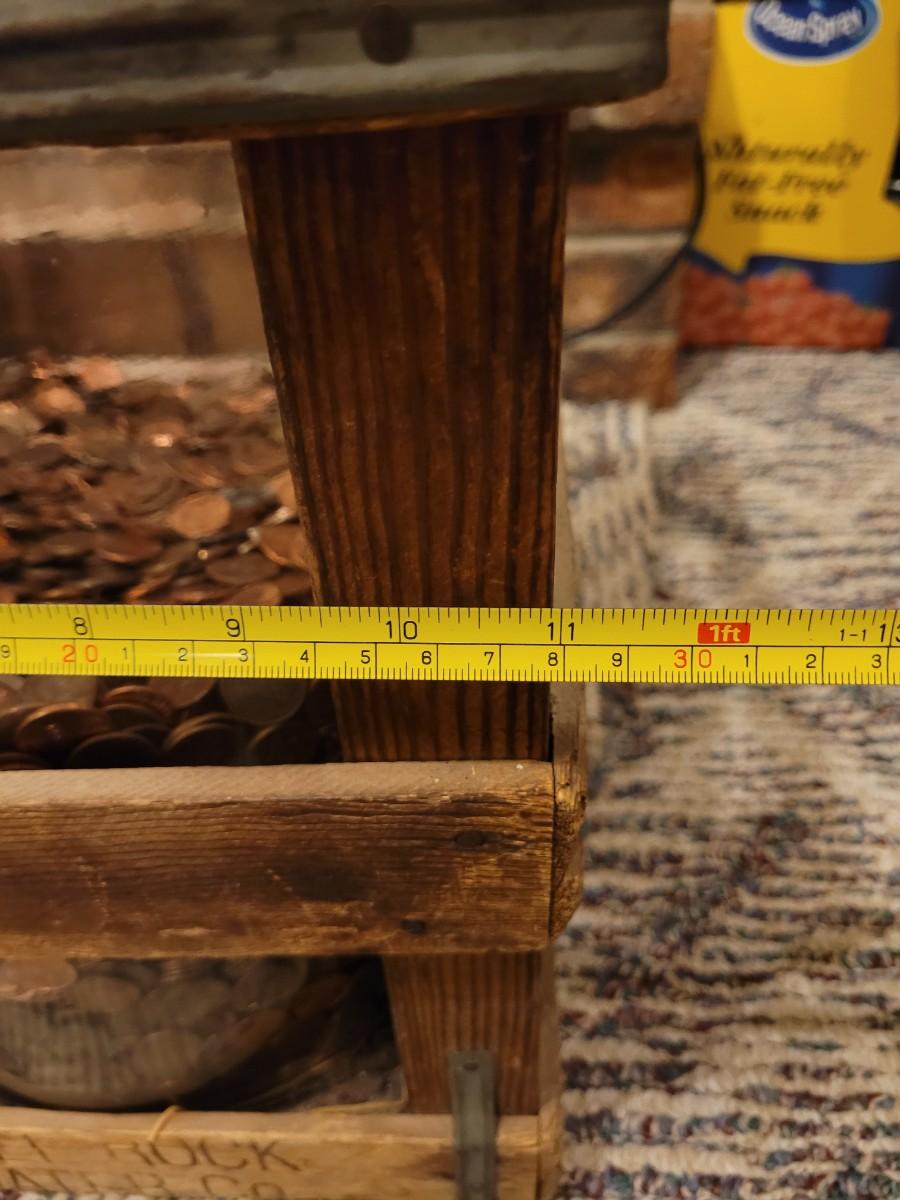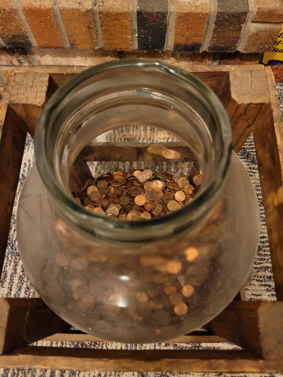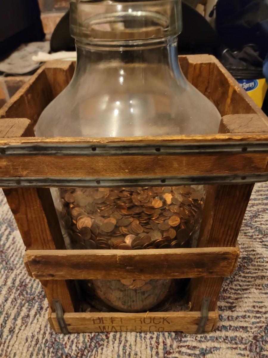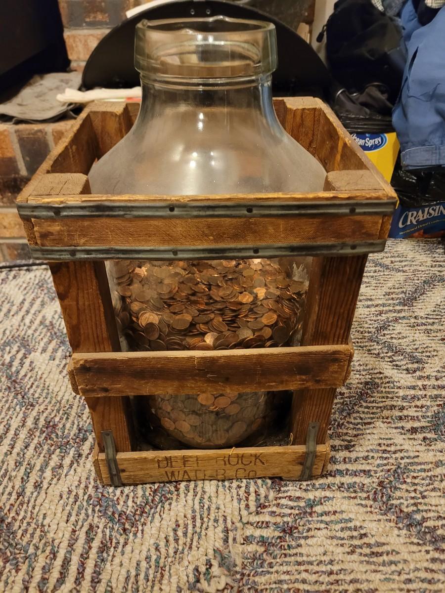 Hard to say how long this collection has been going on, Jar is about 10" in diameter and 19" tall, there are about 8 inches of pennies in the jar