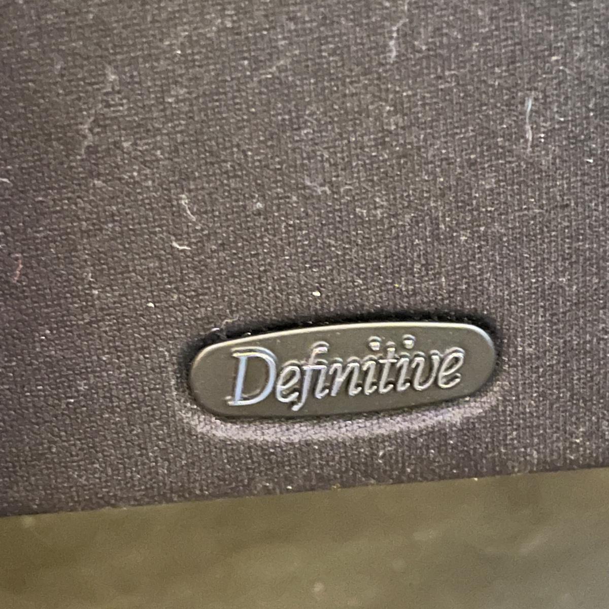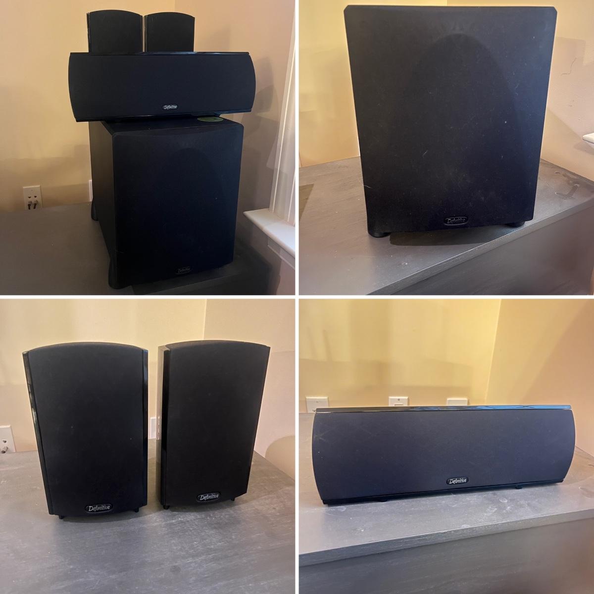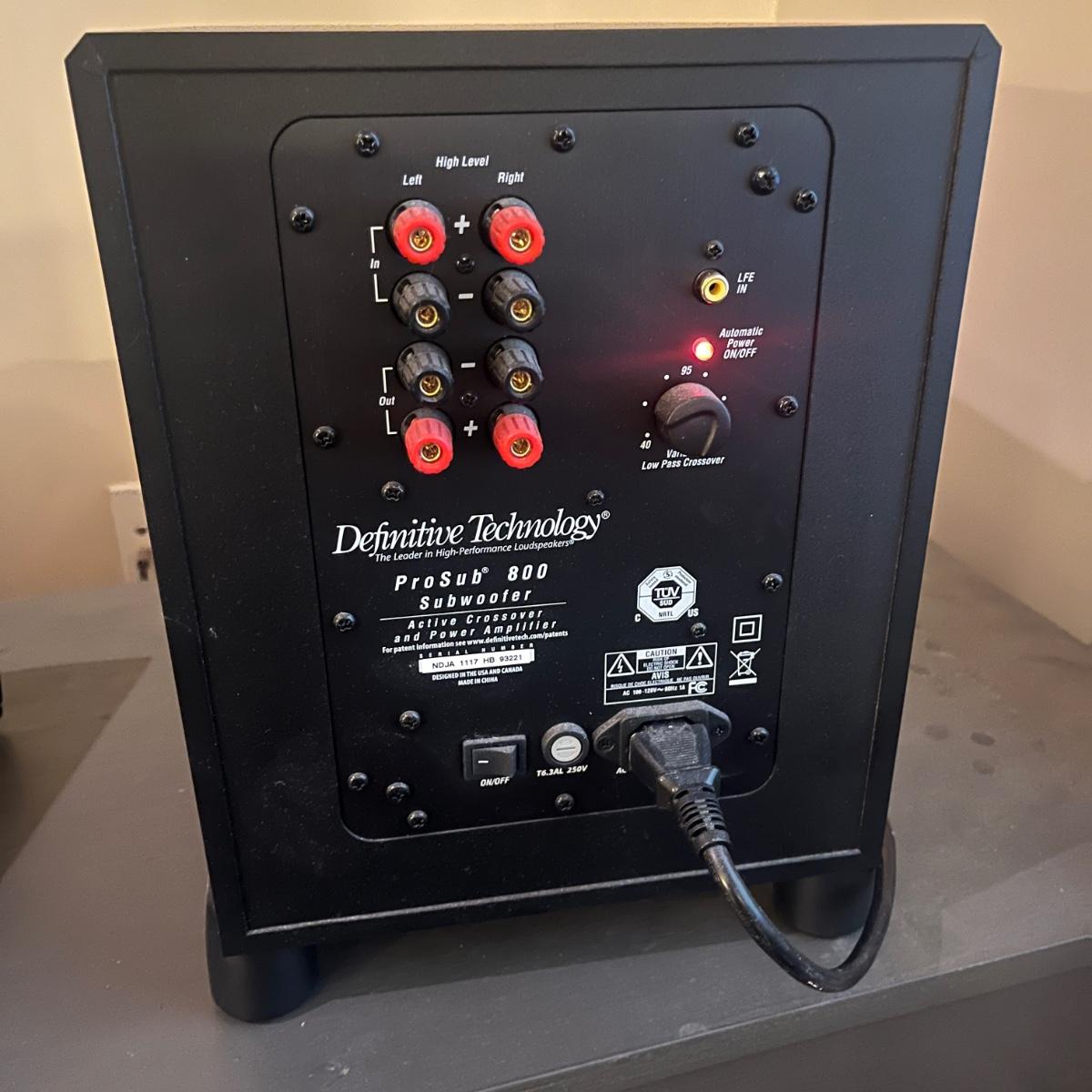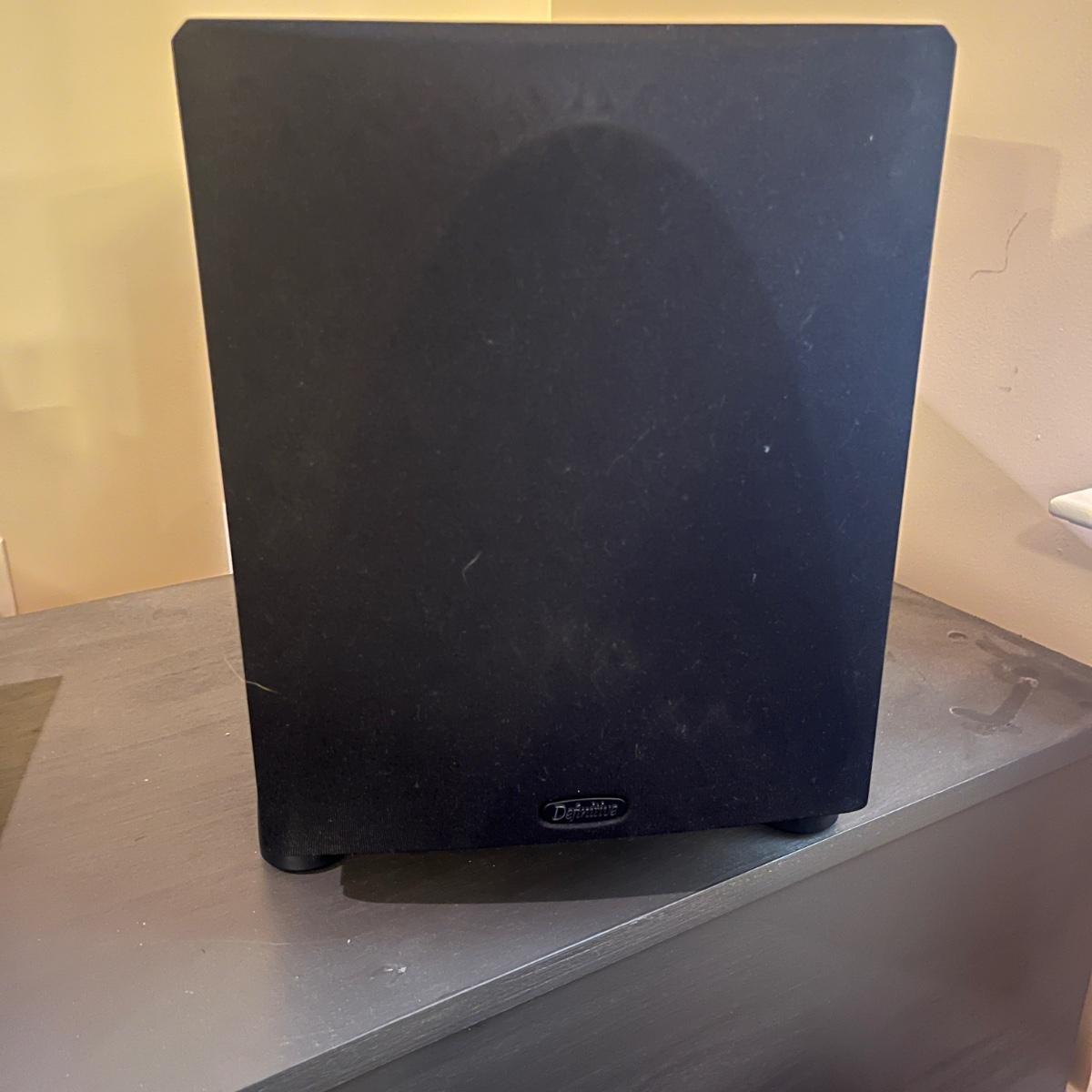 Lot includes a Definitive Pro Sub 800, Definitive Pro Center 1000 speaker and two Definitive Monitor 800 speakers. Sub powered on when plugged in. Sub measures 9.5” x 15” x 13”H.