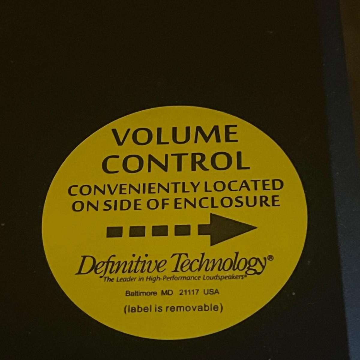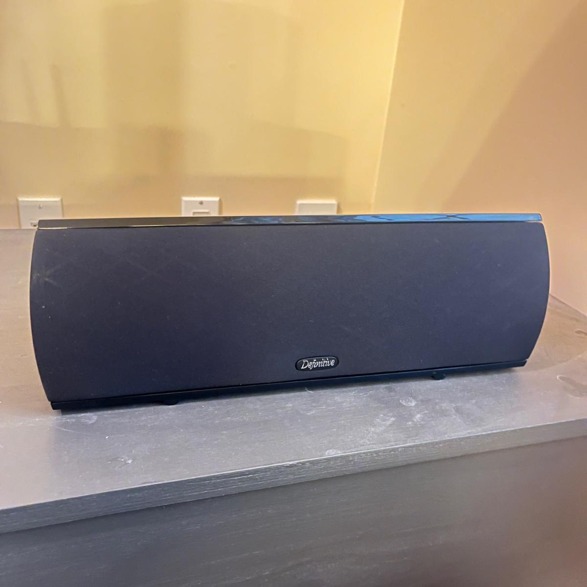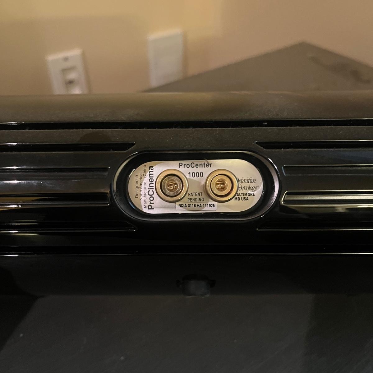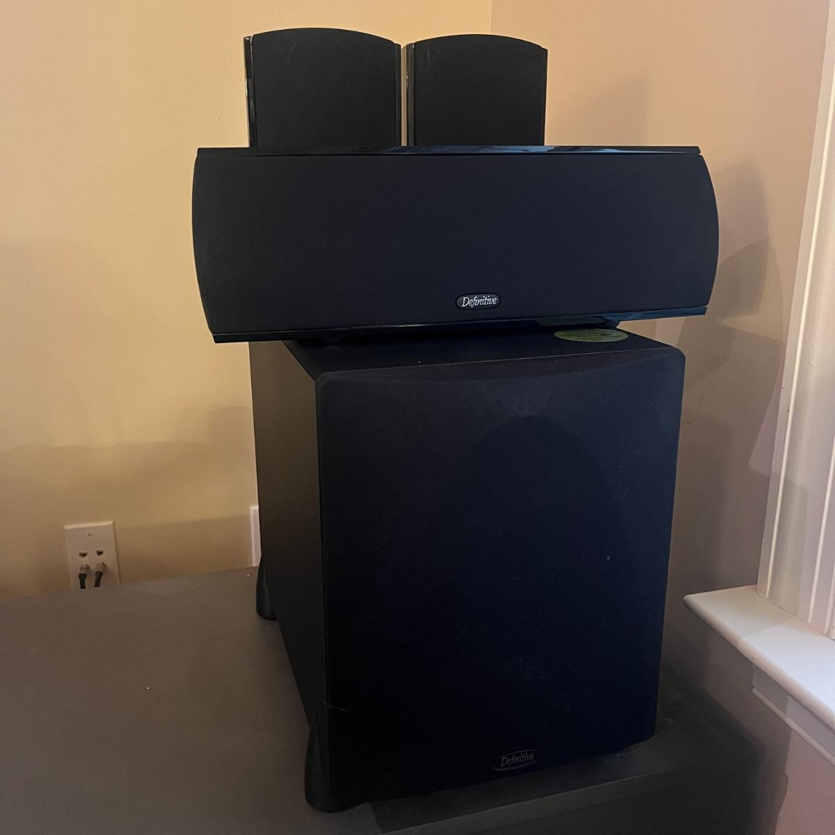 Lot includes a Definitive Pro Sub 800, Definitive Pro Center 1000 speaker and two Definitive Monitor 800 speakers. Sub powered on when plugged in. Sub measures 9.5” x 15” x 13”H.