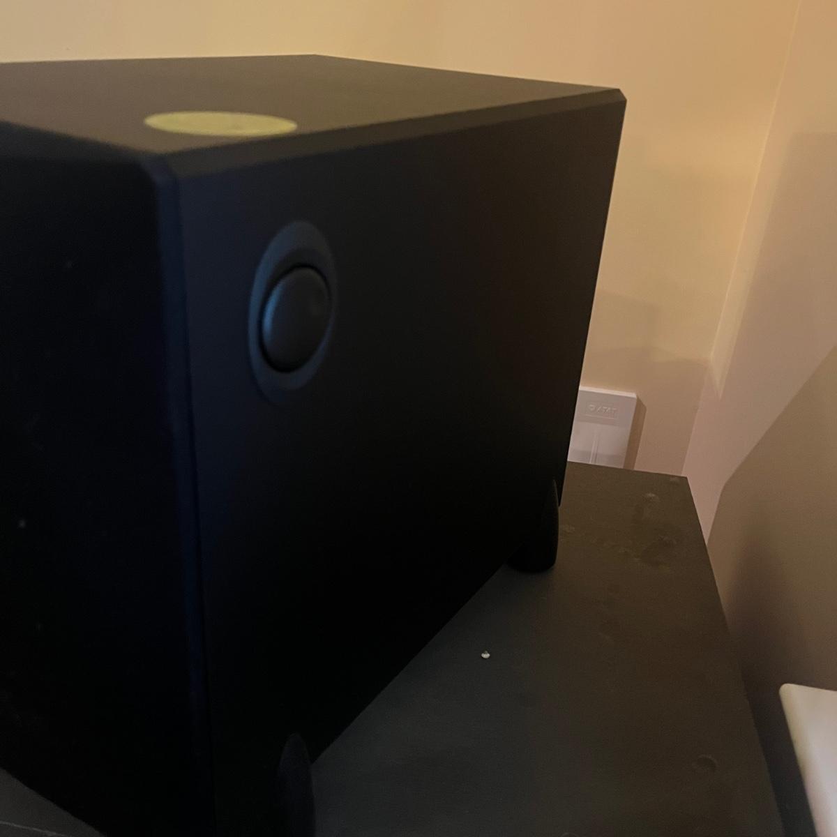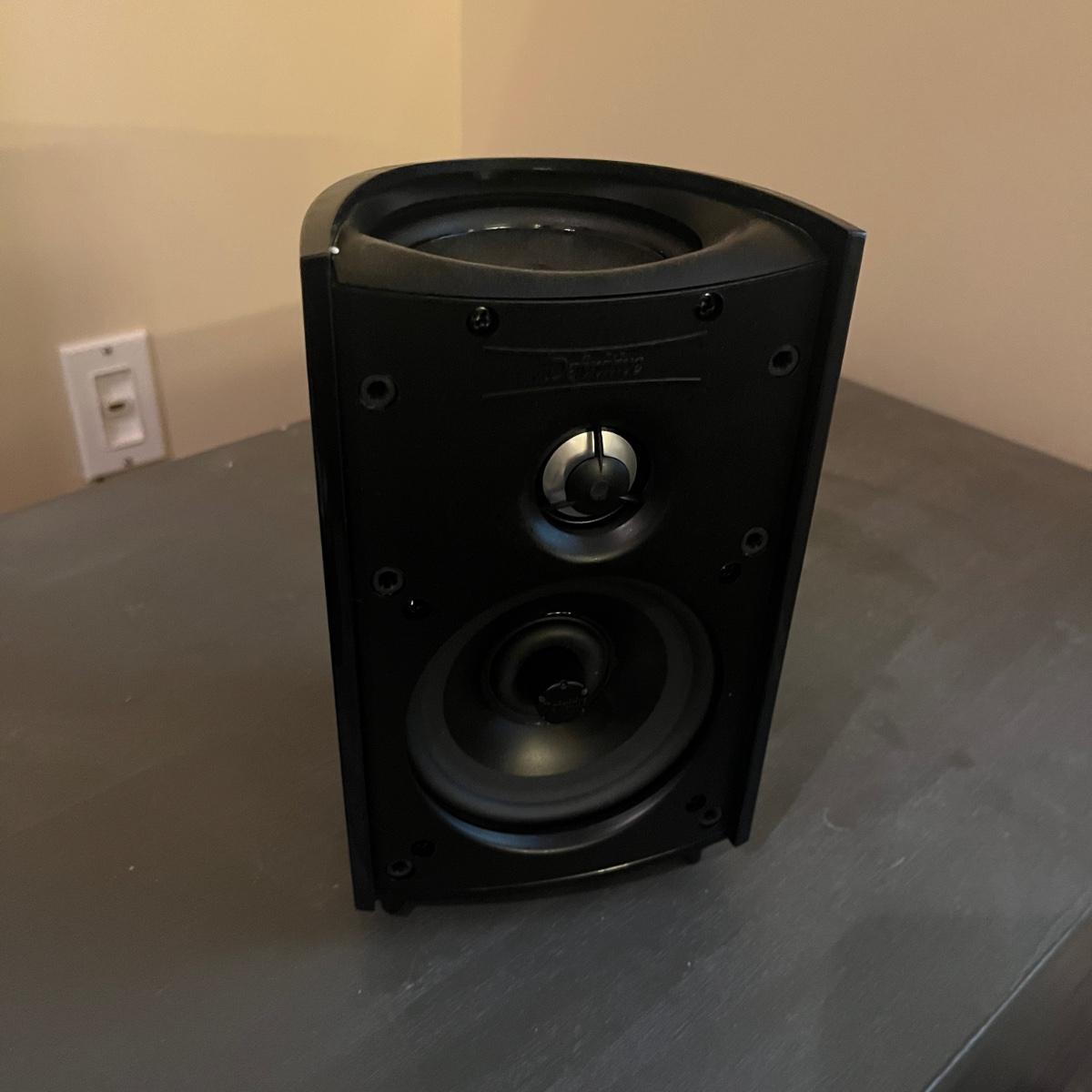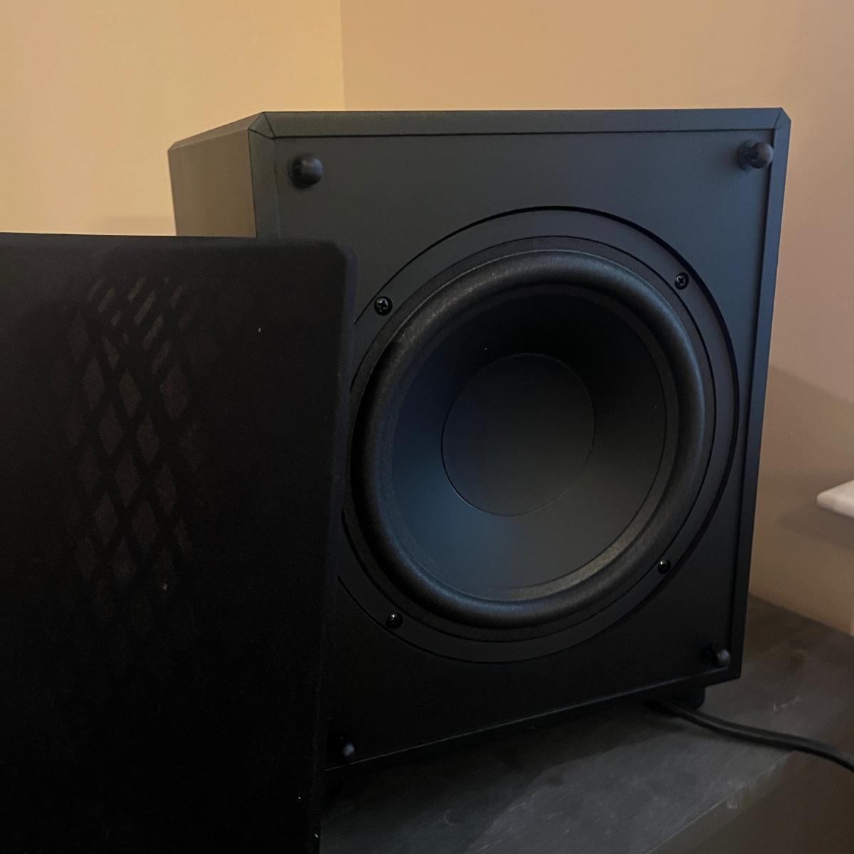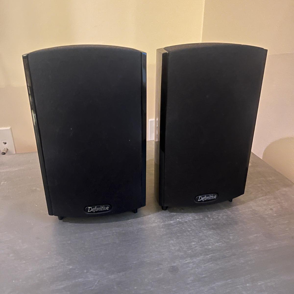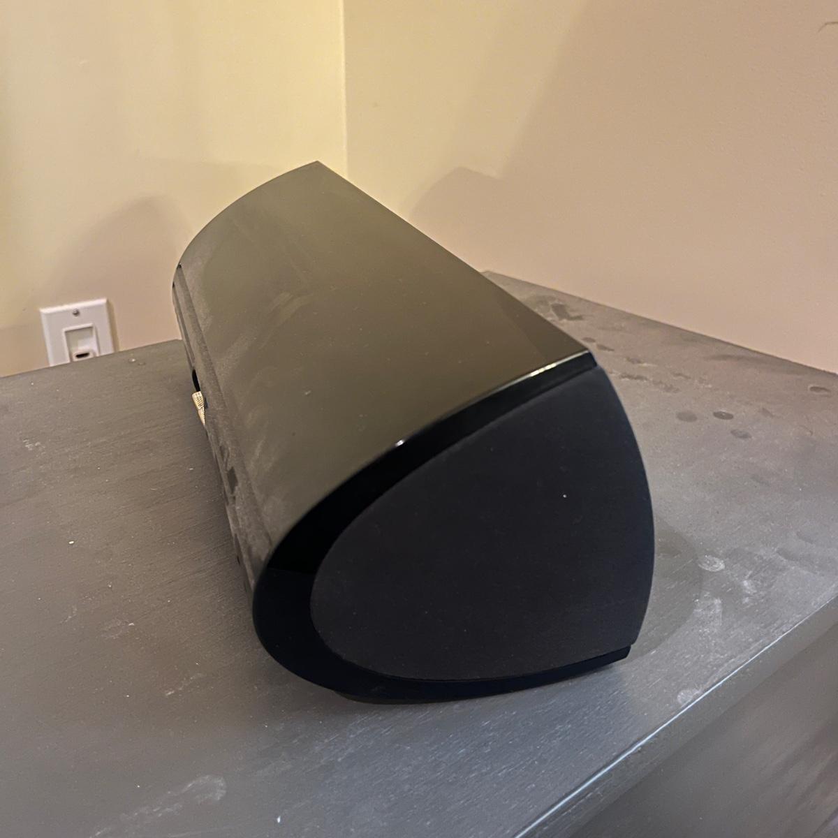 Lot includes a Definitive Pro Sub 800, Definitive Pro Center 1000 speaker and two Definitive Monitor 800 speakers. Sub powered on when plugged in. Sub measures 9.5” x 15” x 13”H.
