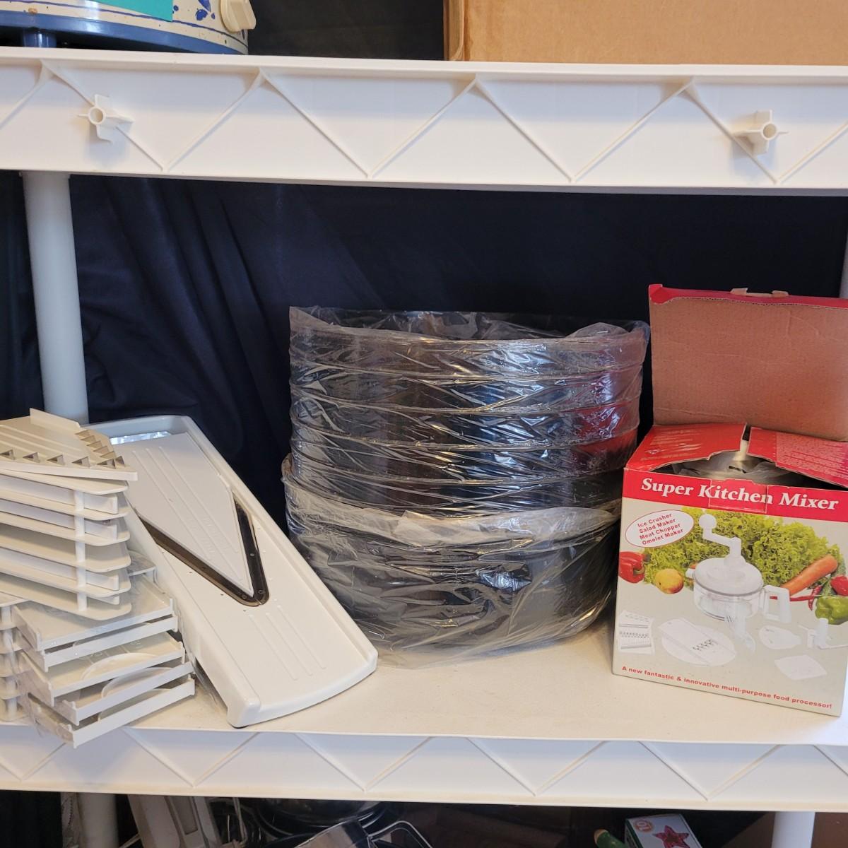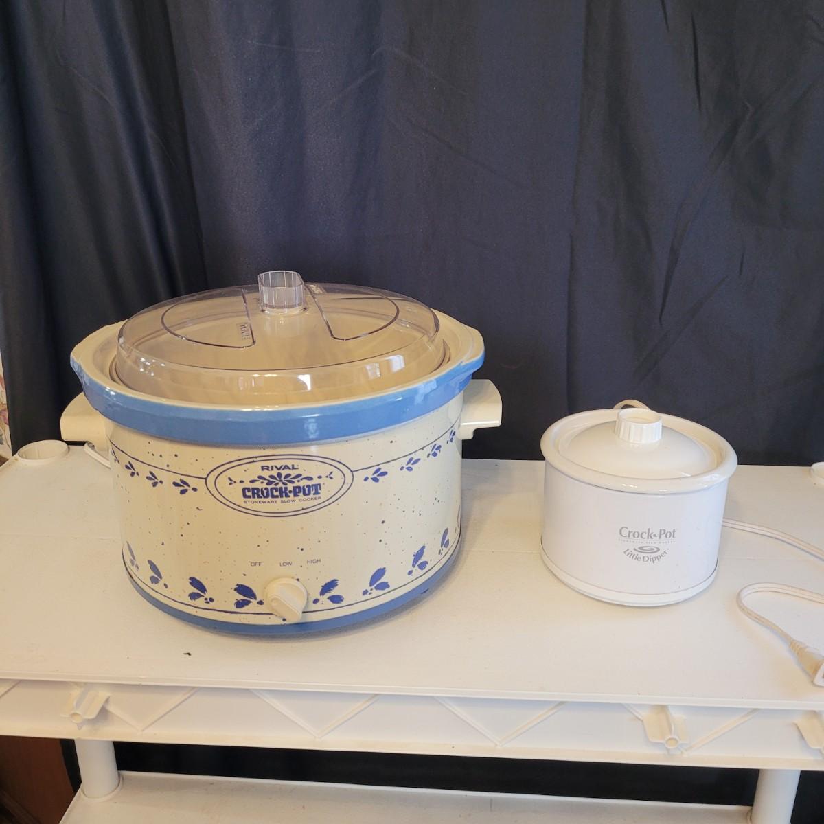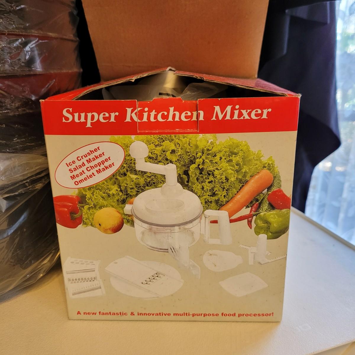 Included in this lot are two Rival crockpots, a food dehydrator with recipe book (appears to be new), mandolin with four blade attachments and a Super Kitchen Mixer which appears to be unused. Crockpots powered on when plugged in. Dehydrator measures approximately 13"DIA x 11"H.