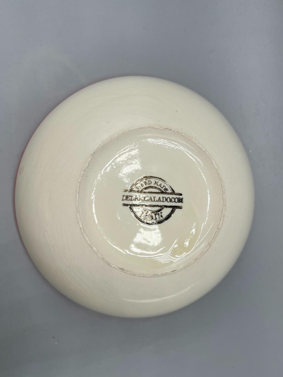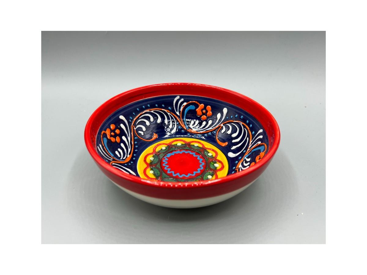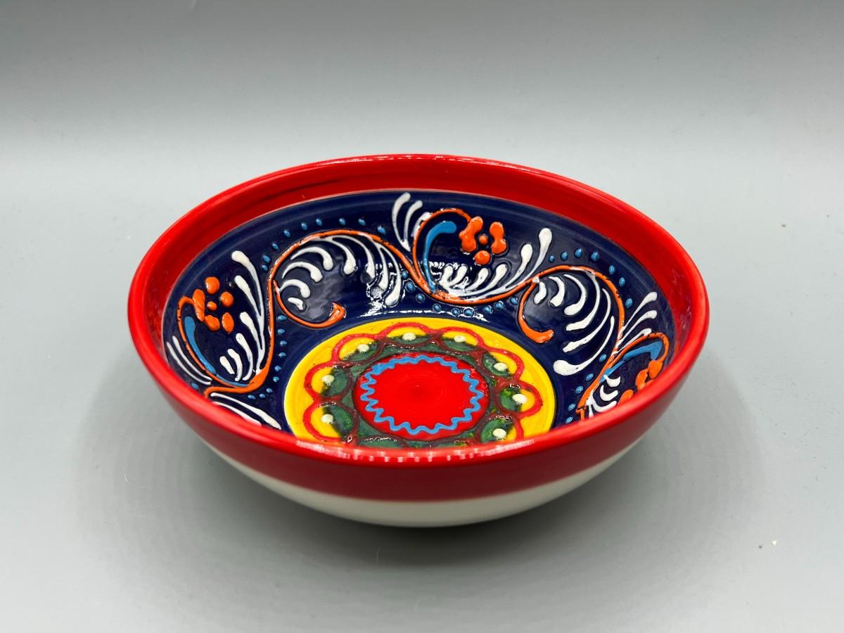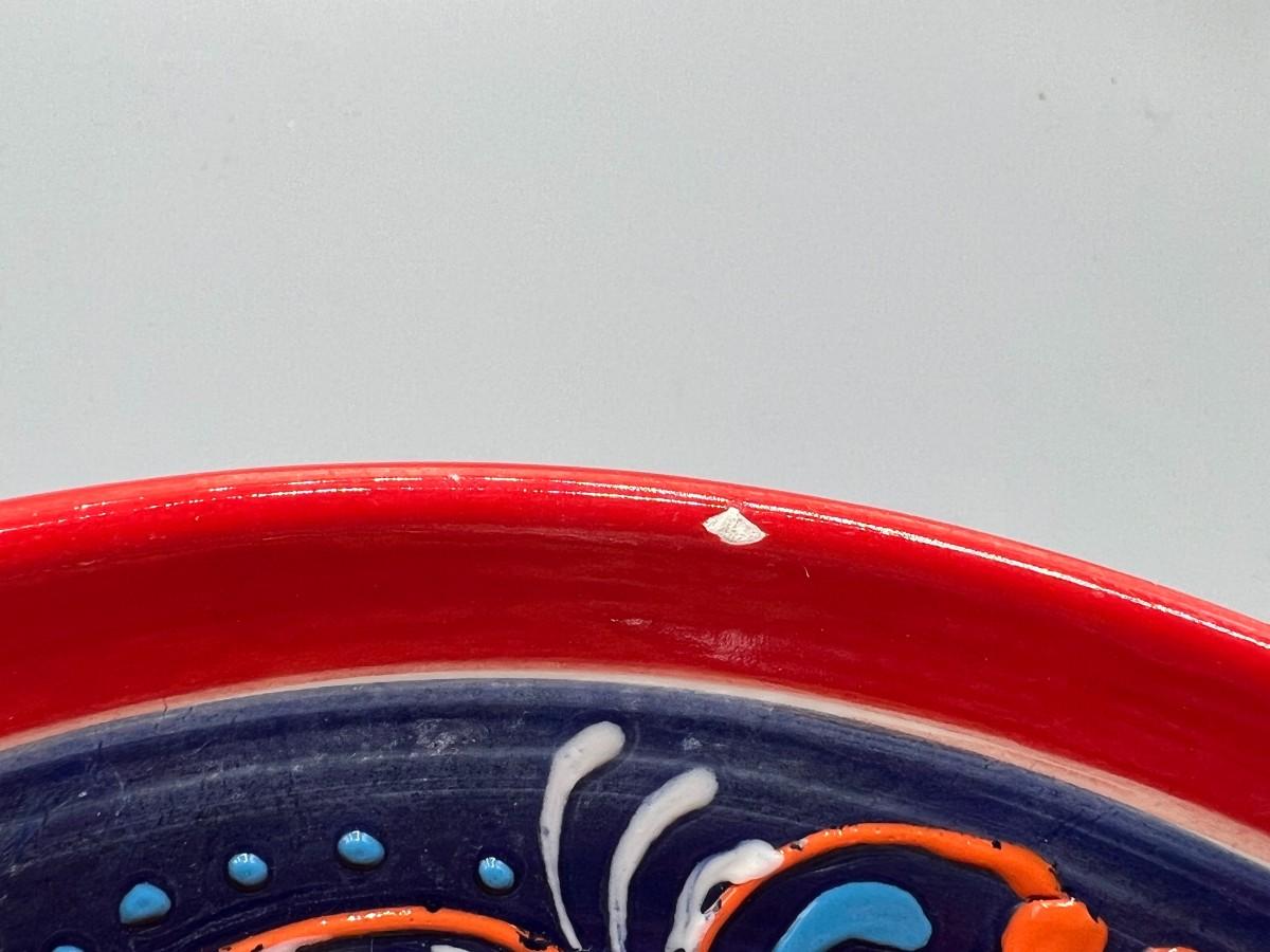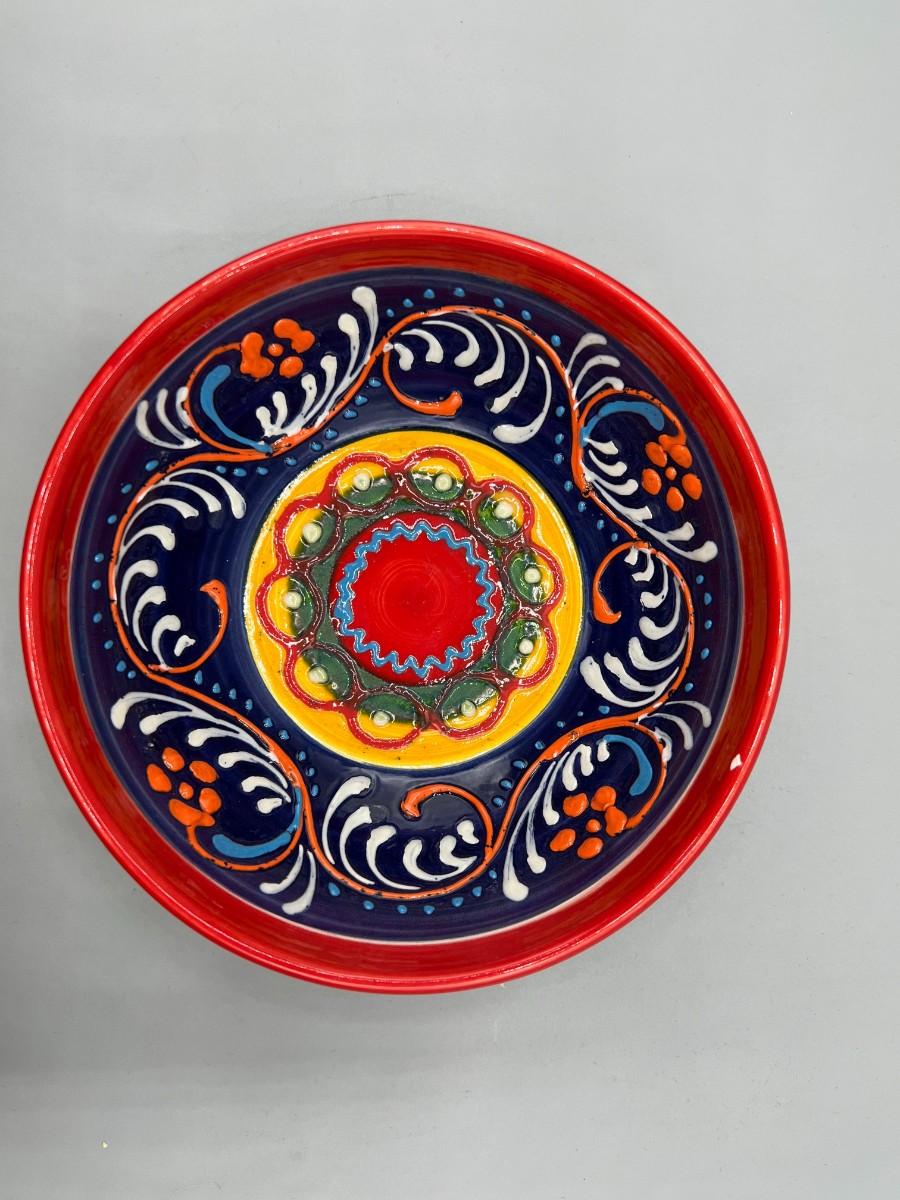 Colorful hand painted bowl from Del Rio Salado. Floral mandala pattern inside. Made in Spain. There is a small chip in the paint along the edge.