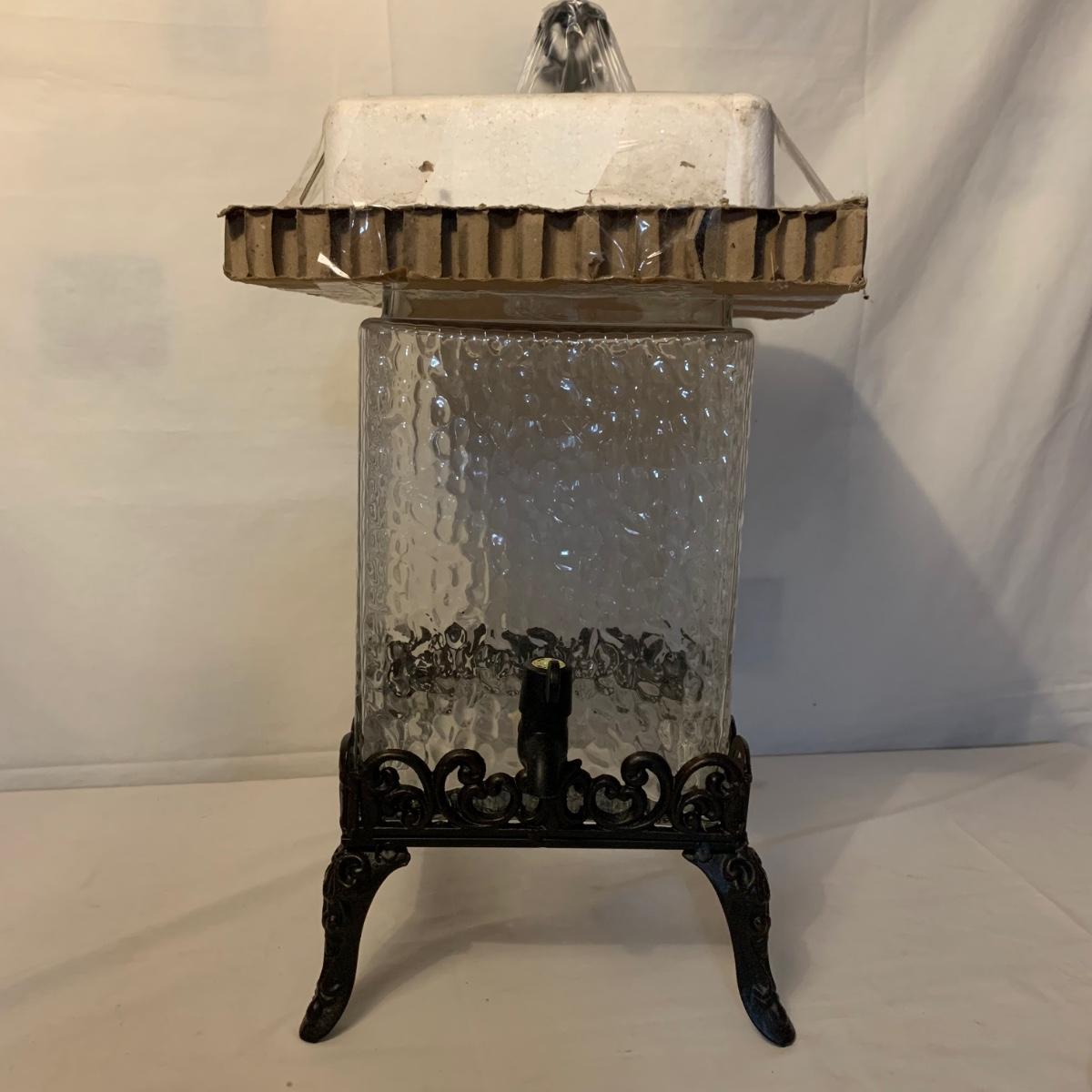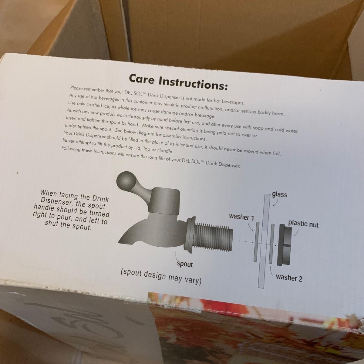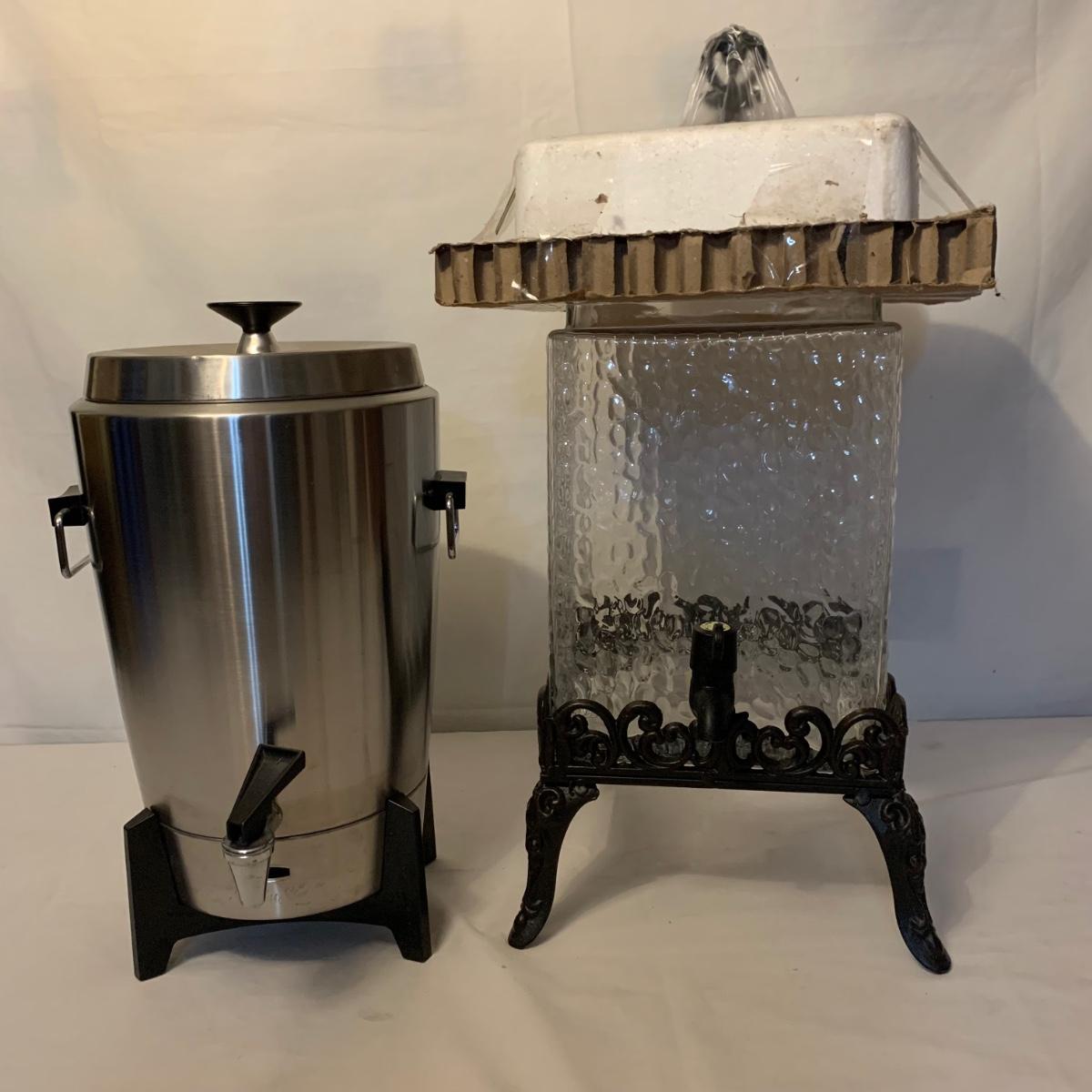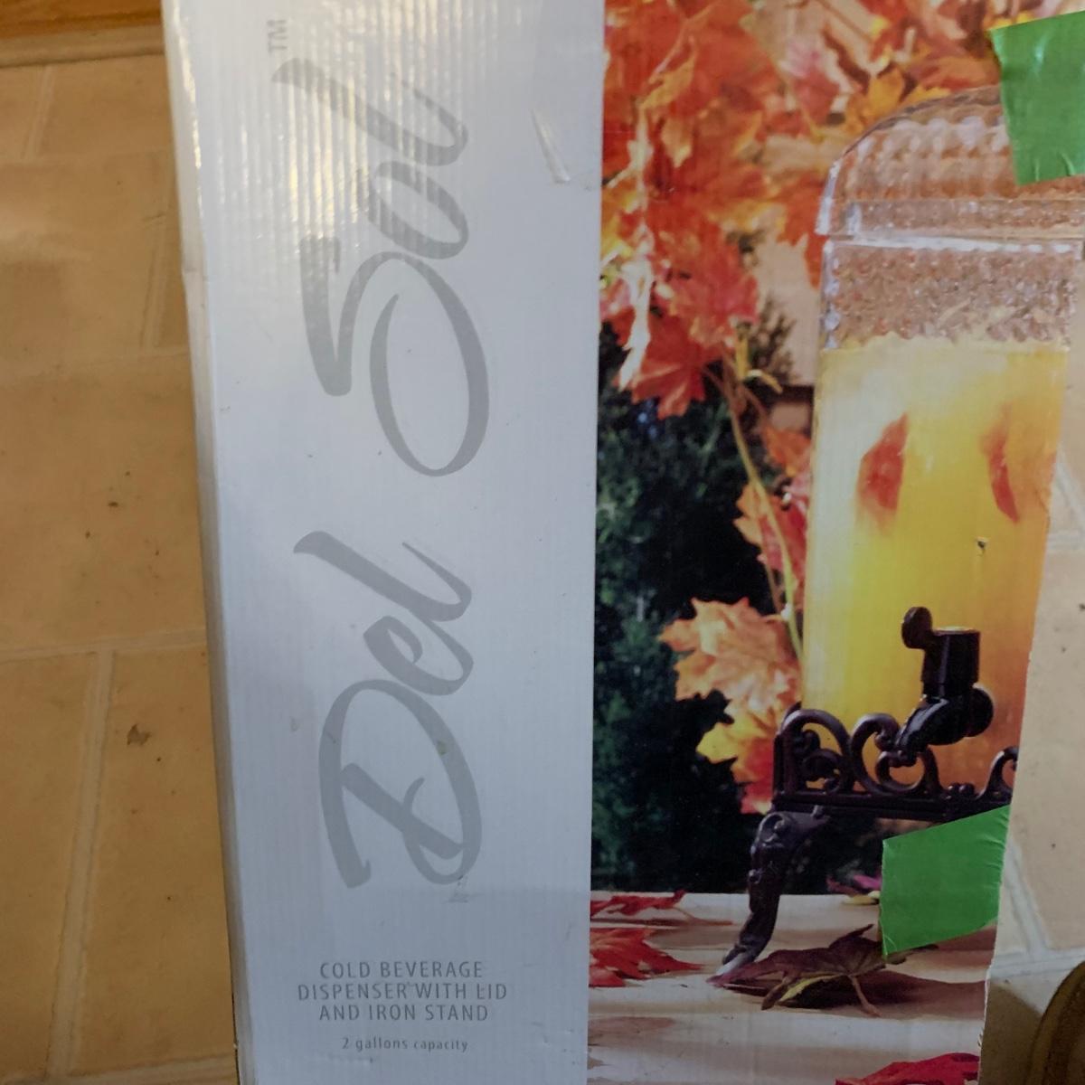 Del Sol cold beverage dispenser with lid and iron stand comes new in its box. Box has some damage but item is still protected in packaging. It has a two gallon capacity glass container. Box measures 13” x 12” x 19”H. Stainless steel coffee brewer emitted heat when plugged in. Including the lid, it is about 10”D x 16”H.