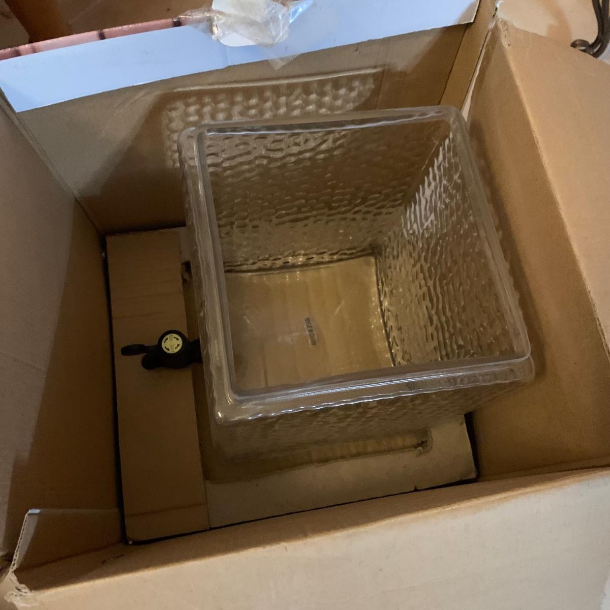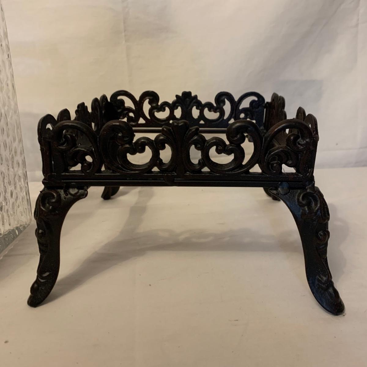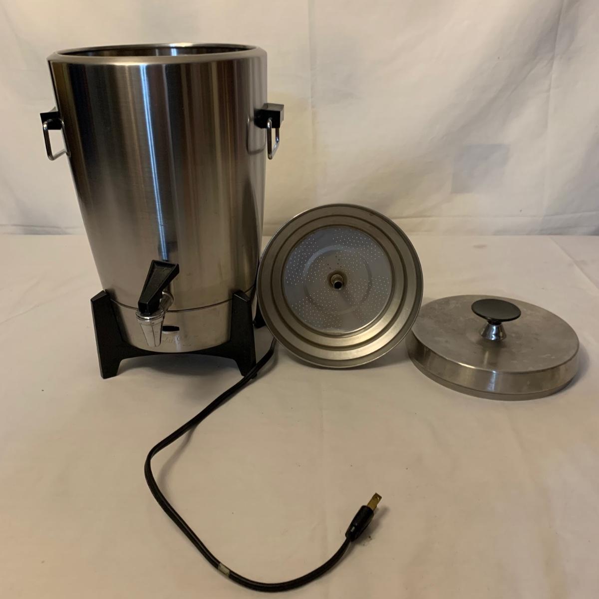 Del Sol cold beverage dispenser with lid and iron stand comes new in its box. Box has some damage but item is still protected in packaging. It has a two gallon capacity glass container. Box measures 13” x 12” x 19”H. Stainless steel coffee brewer emitted heat when plugged in. Including the lid, it is about 10”D x 16”H.