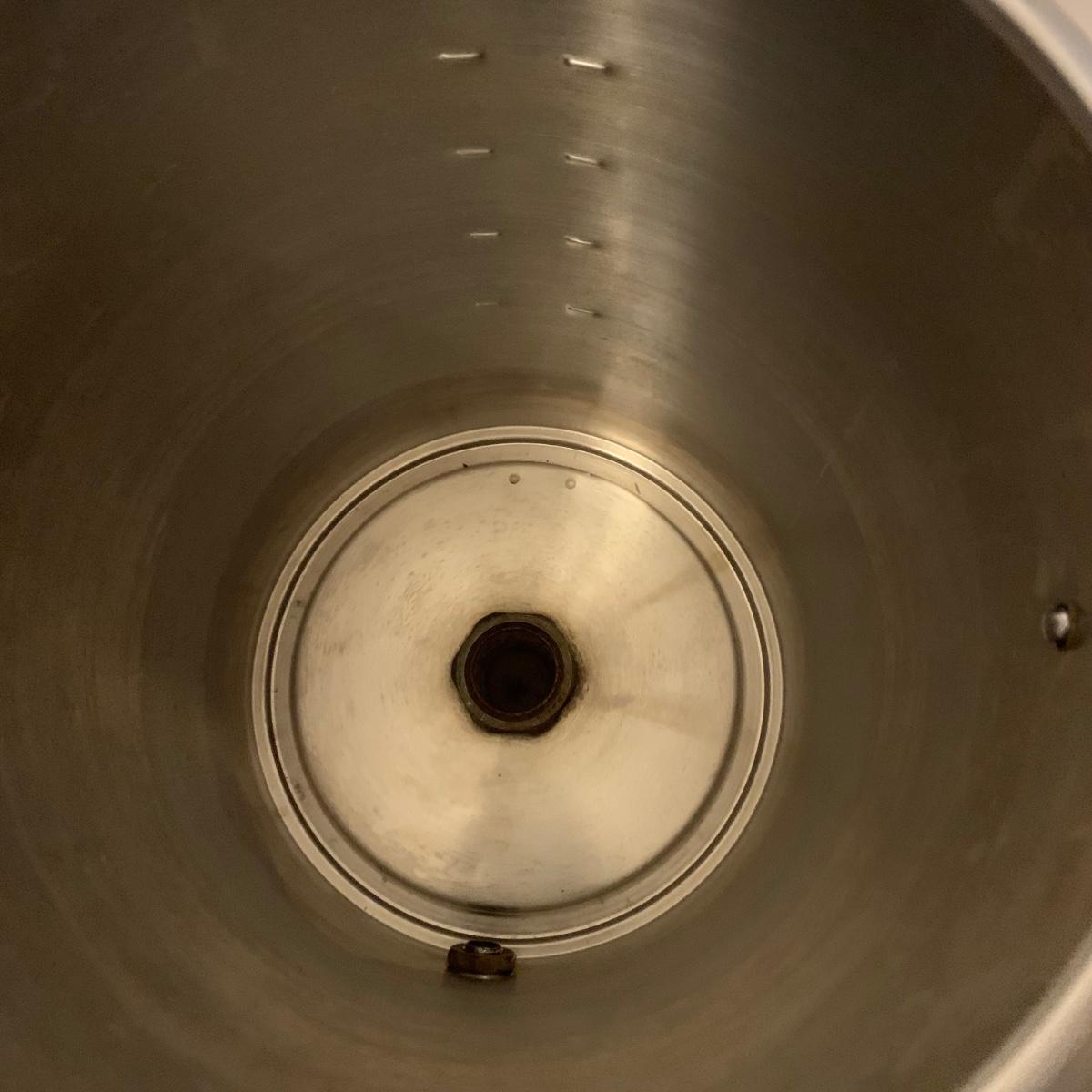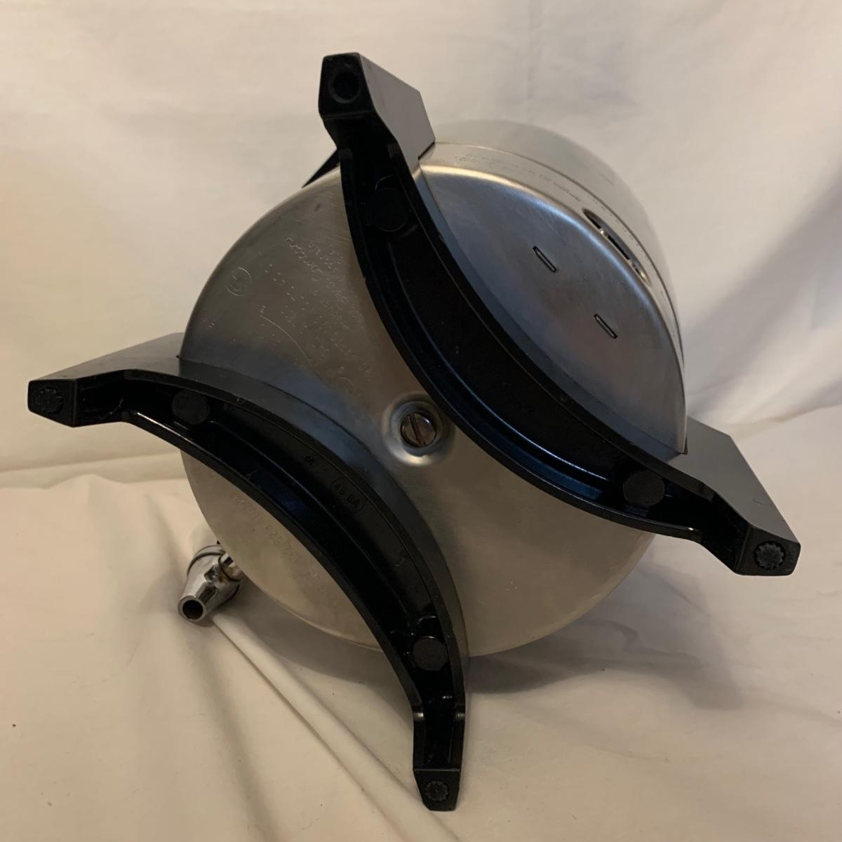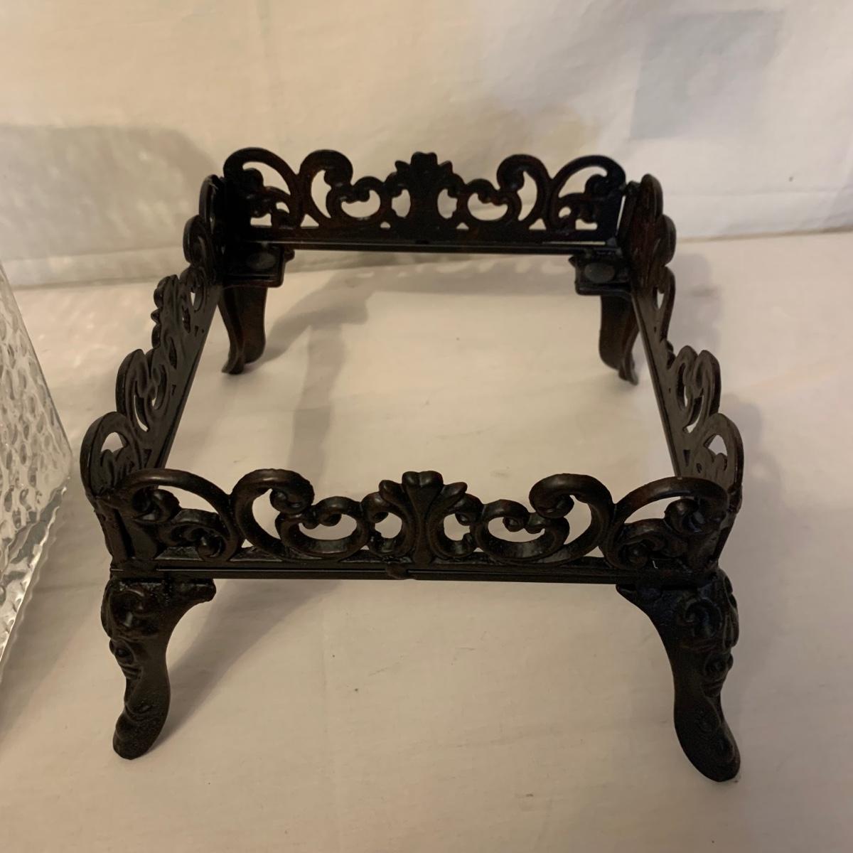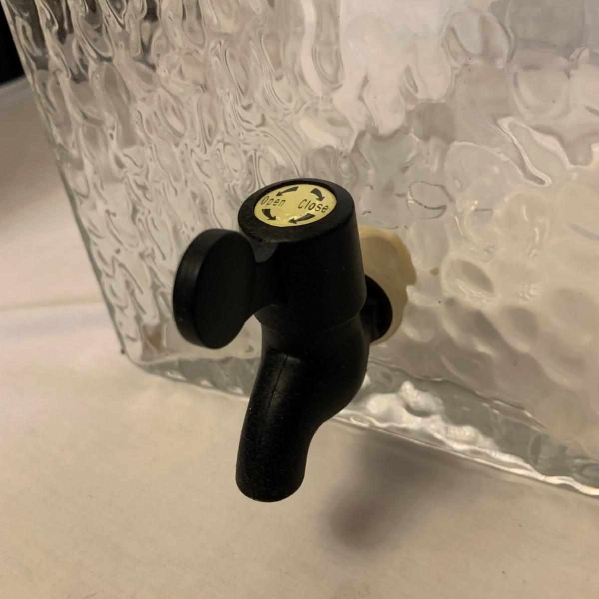Del Sol cold beverage dispenser with lid and iron stand comes new in its box. Box has some damage but item is still protected in packaging. It has a two gallon capacity glass container. Box measures 13” x 12” x 19”H. Stainless steel coffee brewer emitted heat when plugged in. Including the lid, it is about 10”D x 16”H.