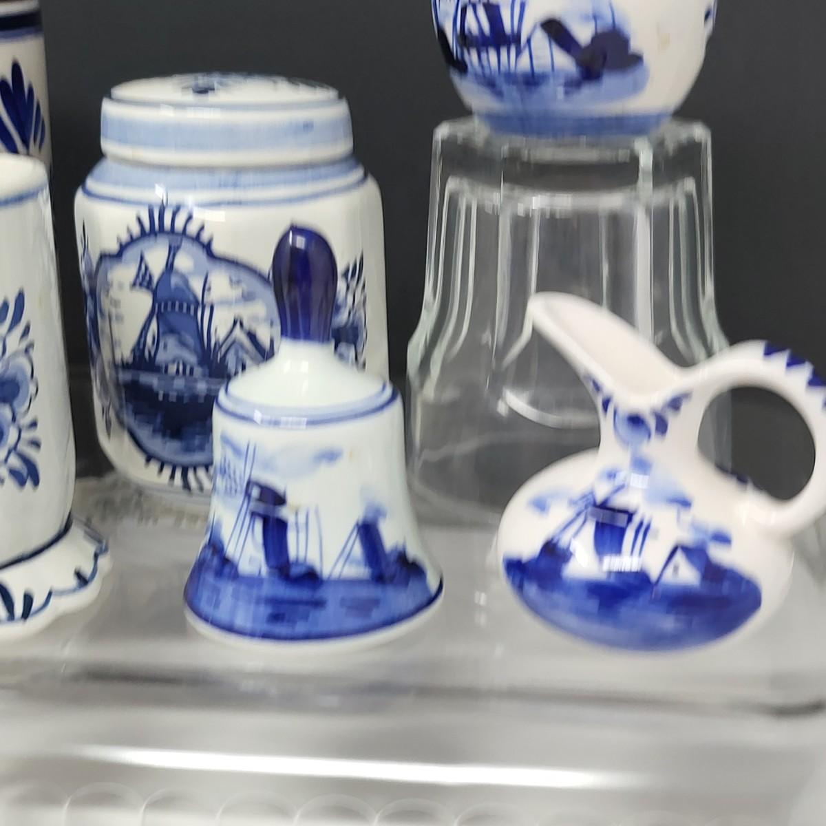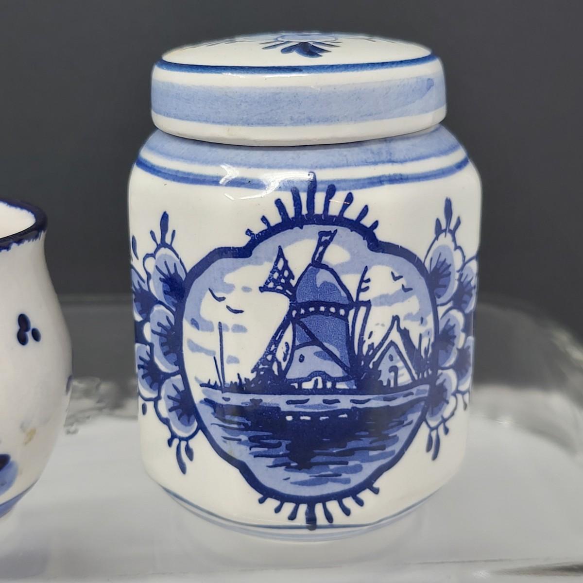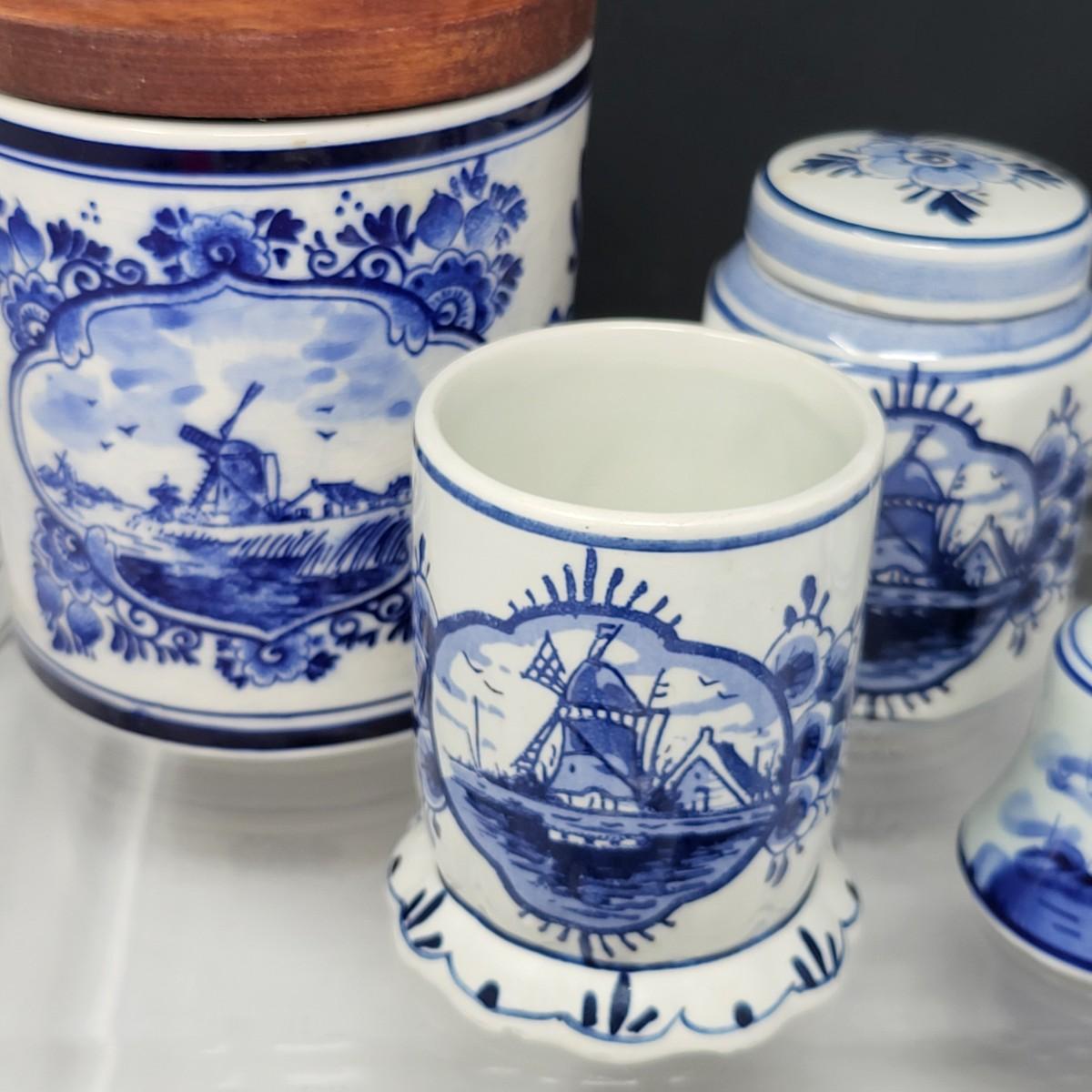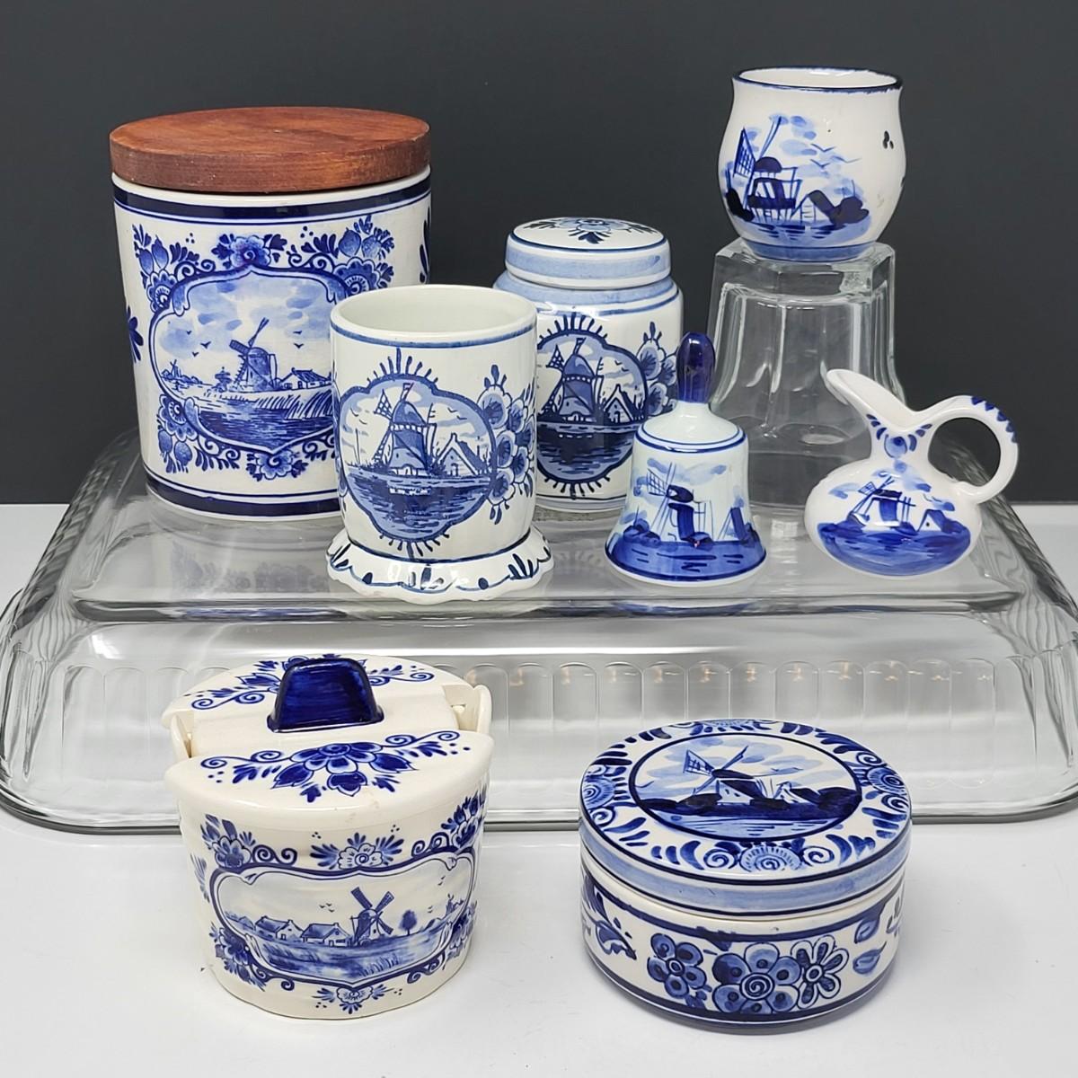 Collection of 8 Delf Holland various decor pieces. Trinket boxes, lidded canister, mini pitcher, small ginger jar, a bell and more.