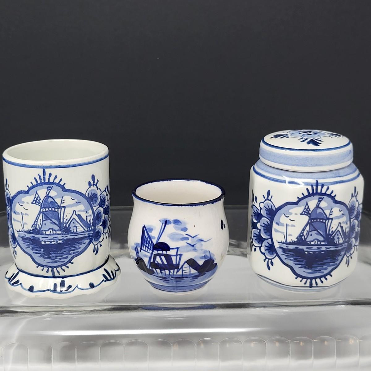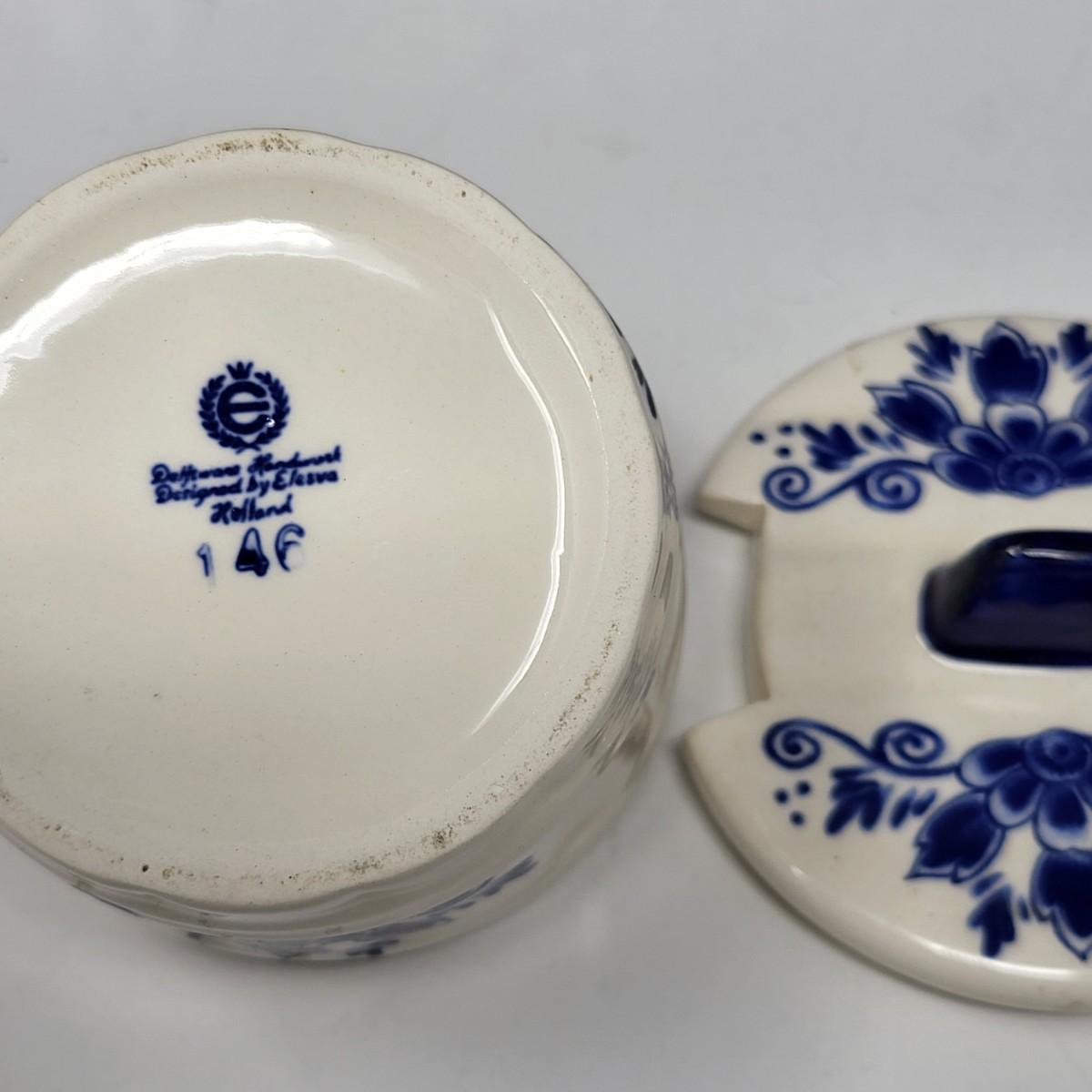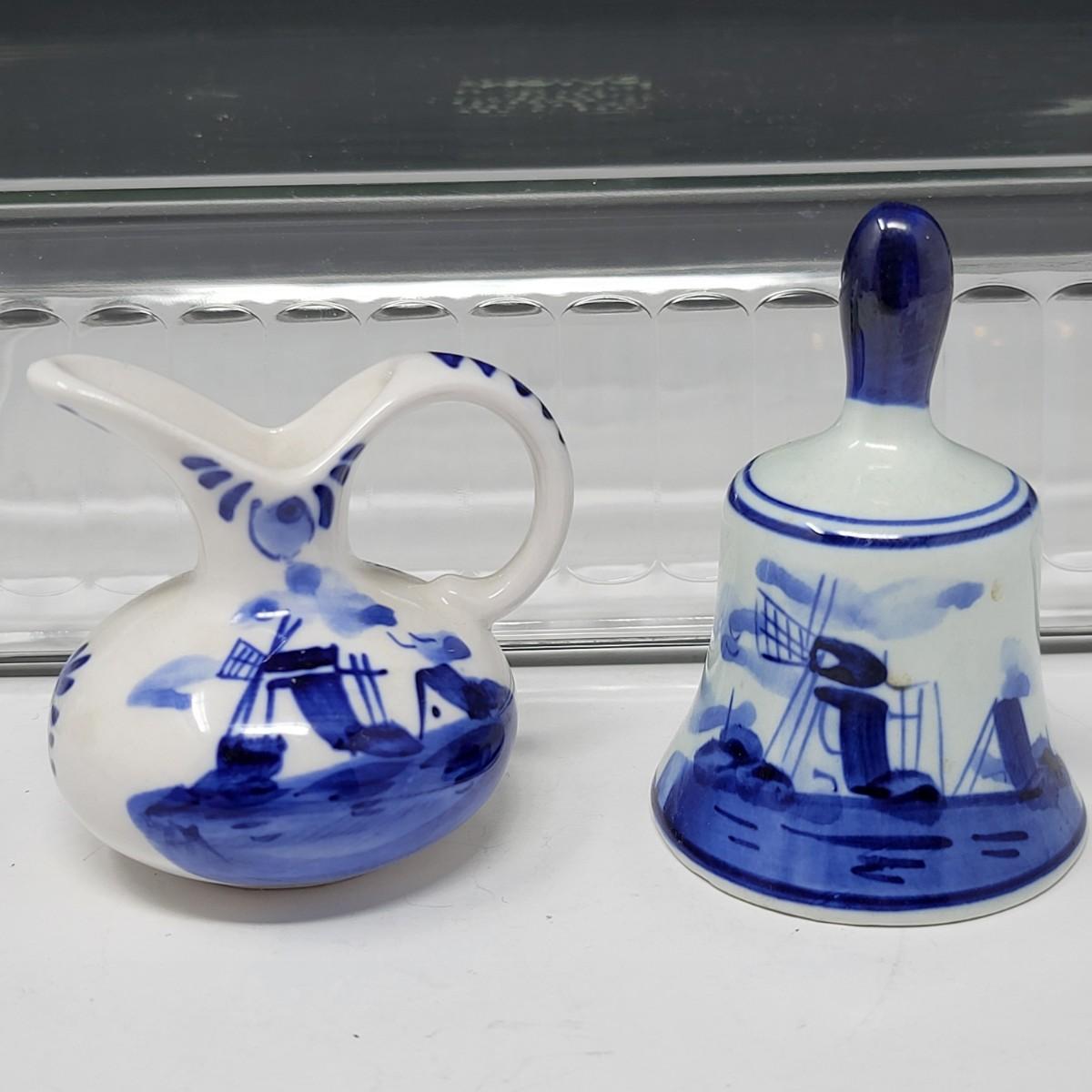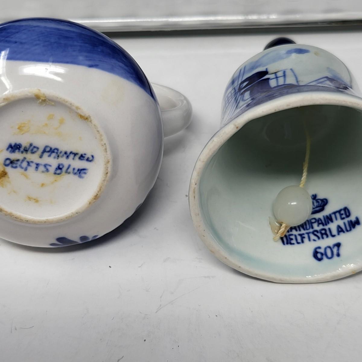 Collection of 8 Delf Holland various decor pieces. Trinket boxes, lidded canister, mini pitcher, small ginger jar, a bell and more.