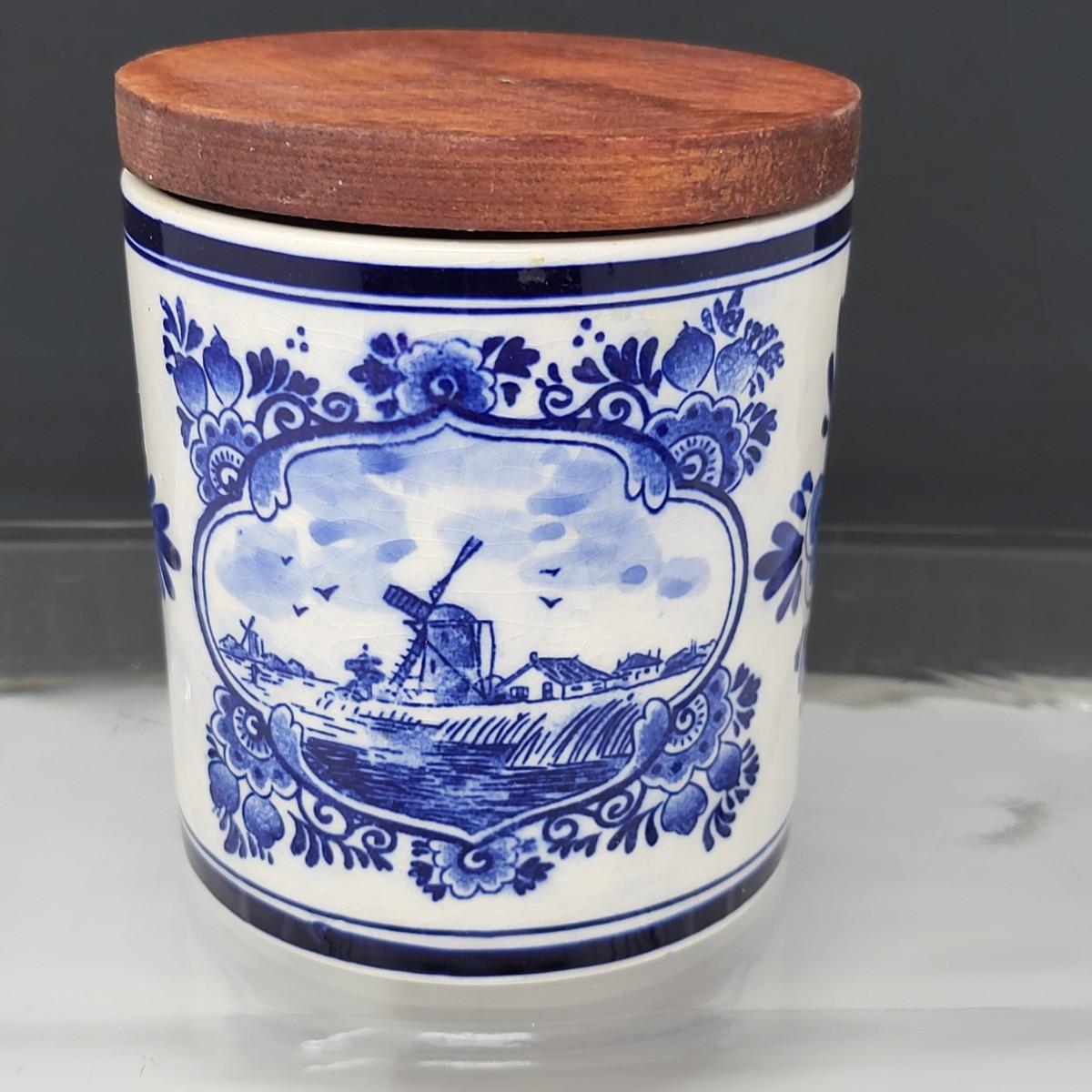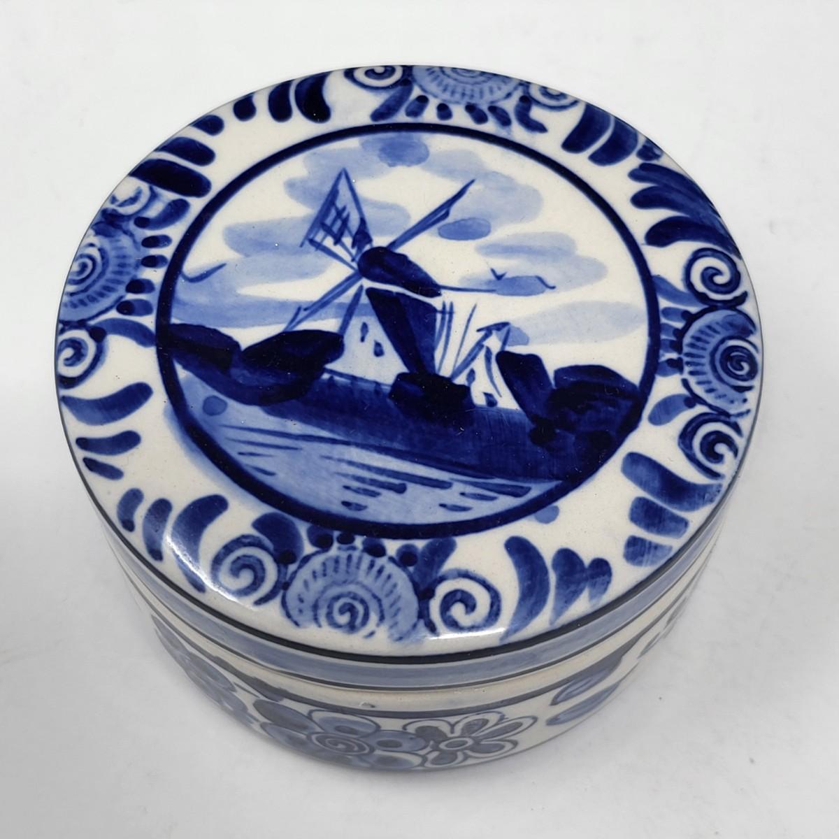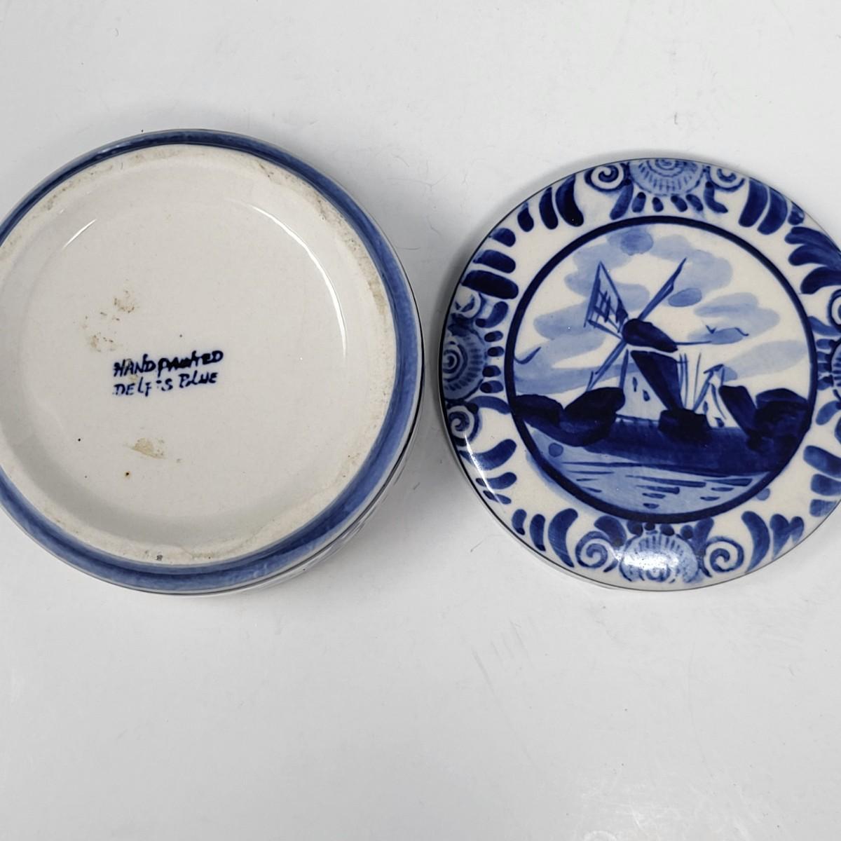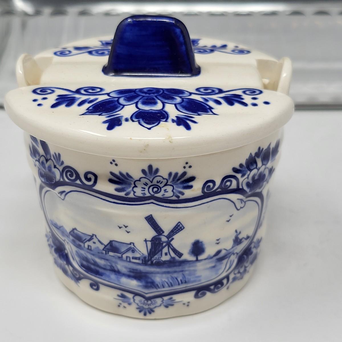 Collection of 8 Delf Holland various decor pieces. Trinket boxes, lidded canister, mini pitcher, small ginger jar, a bell and more.