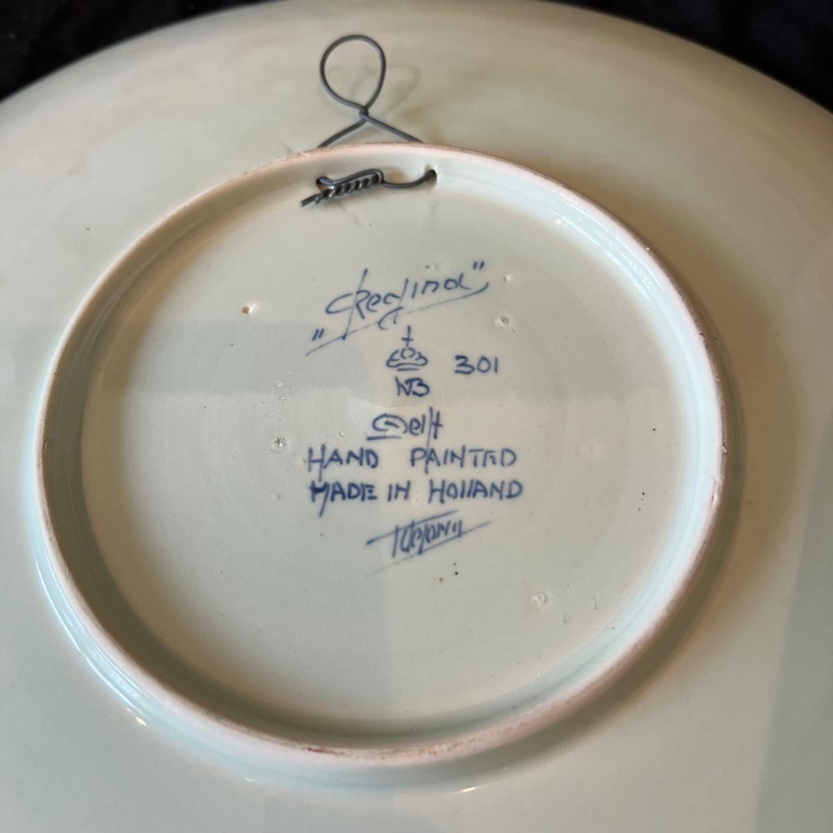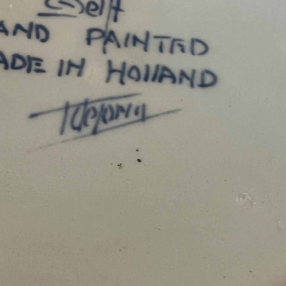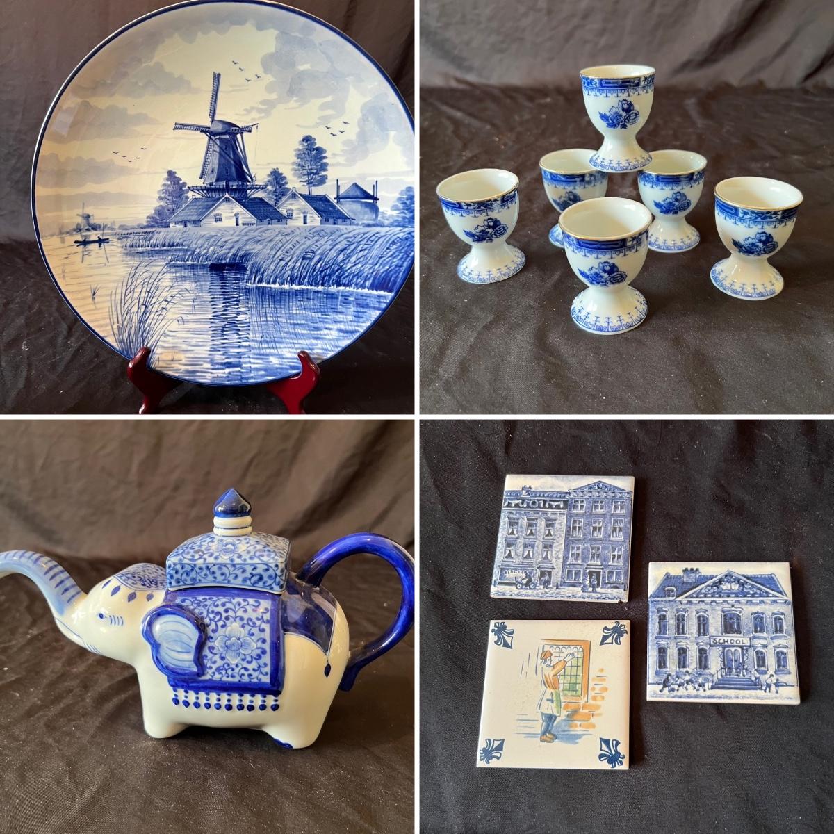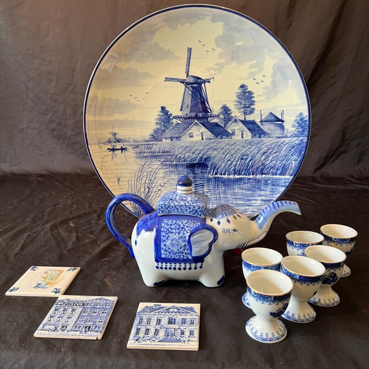 The large Delft plate measures 13”D, it is signed and hand painted. We have paired more blue and white china that includes an elephant teapot, six egg cups and three KLM coasters.