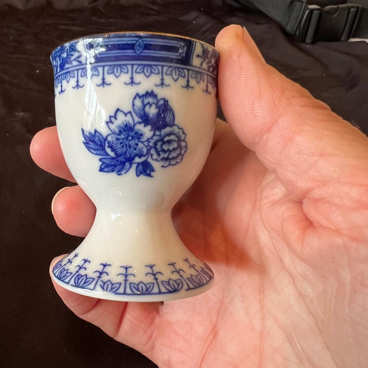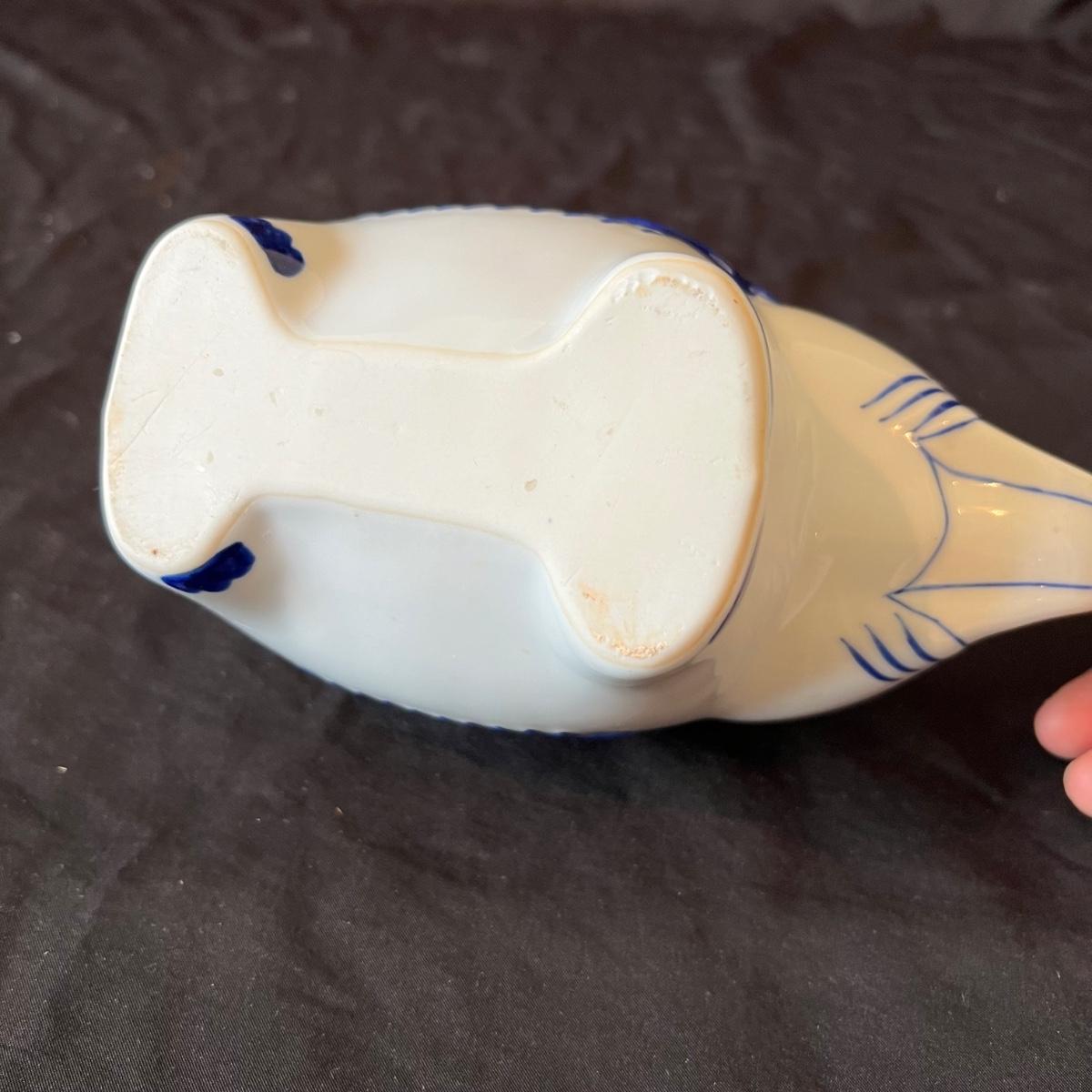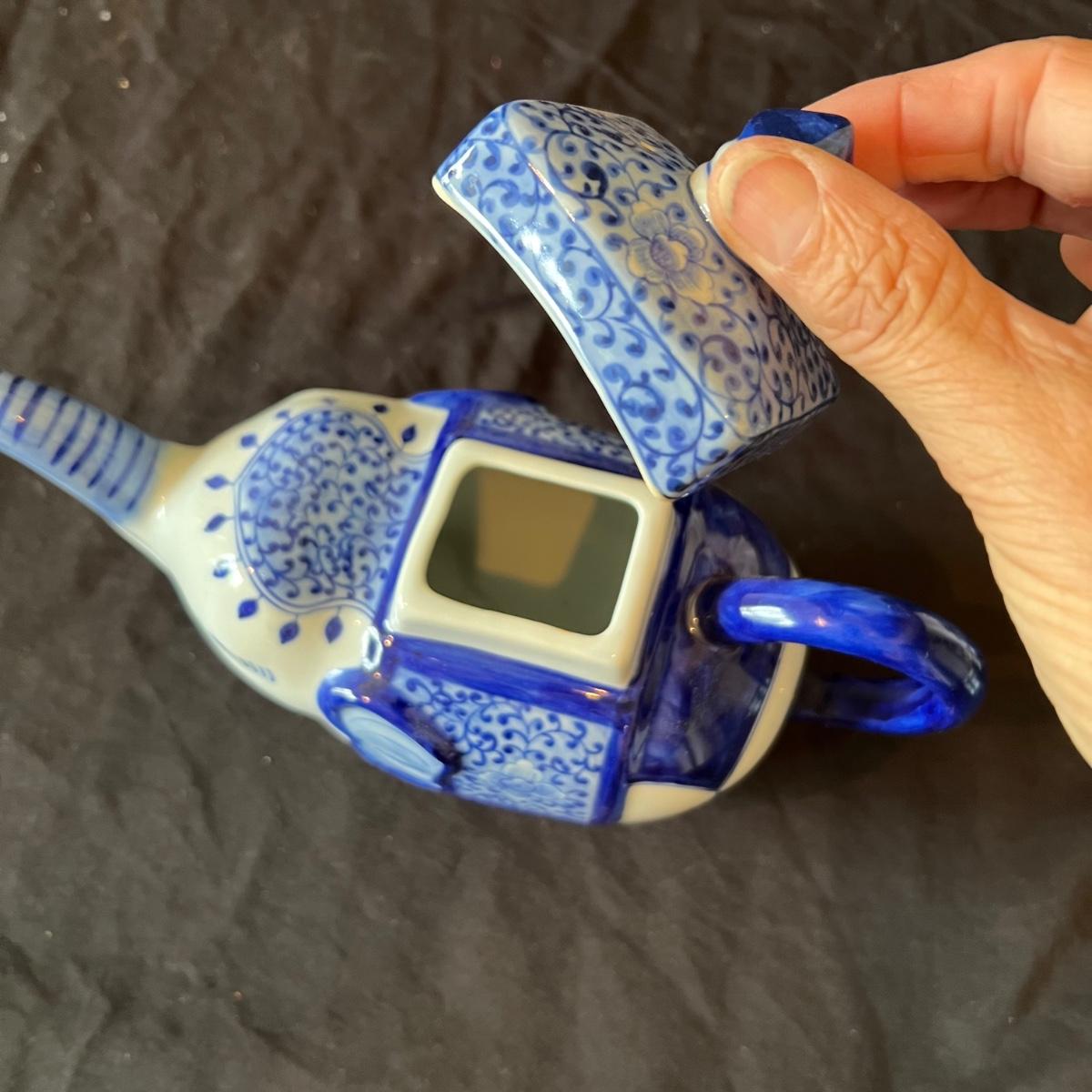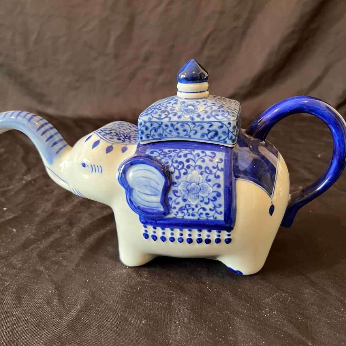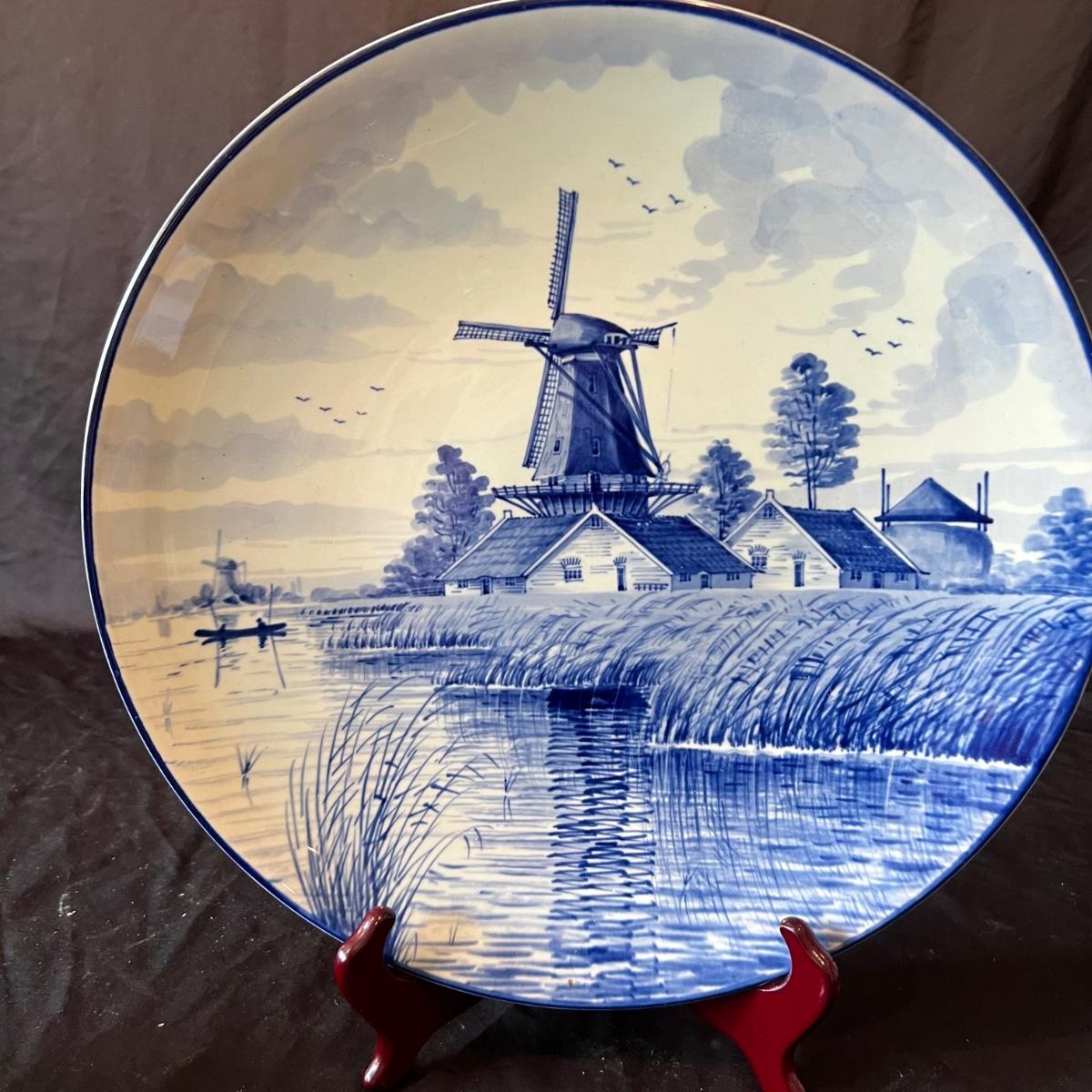 The large Delft plate measures 13”D, it is signed and hand painted. We have paired more blue and white china that includes an elephant teapot, six egg cups and three KLM coasters.