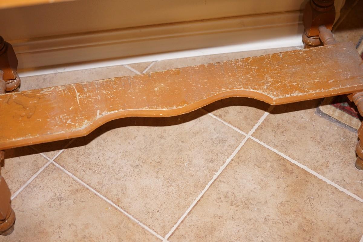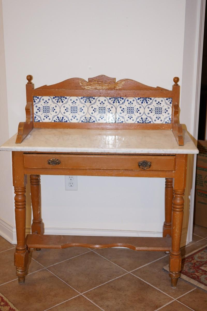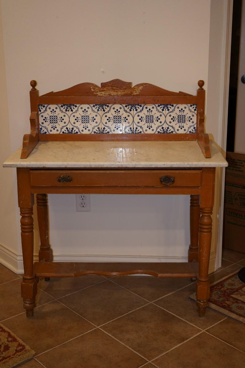 this little washstand needs some work. It needs refinishing and or some creative restoration missing finish on the back splash and lower shelf.