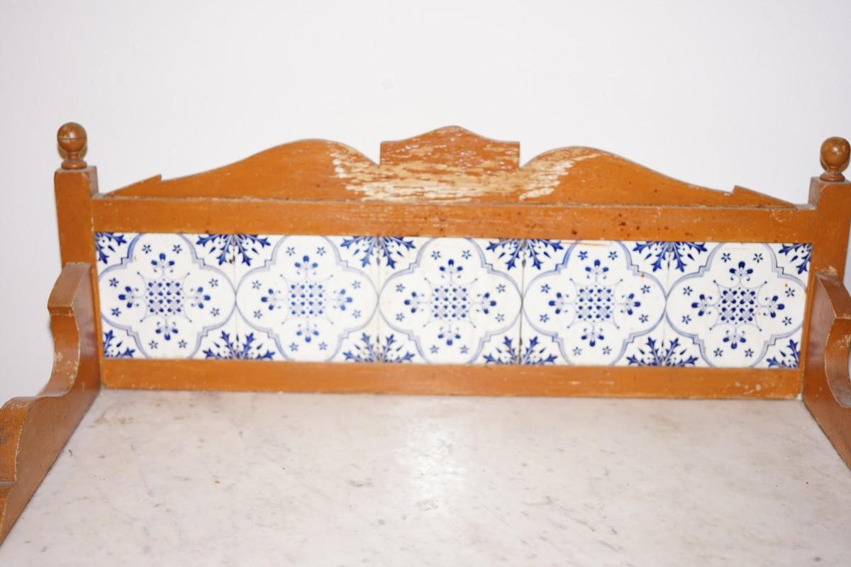 DELFT TILE BACK WASHSTAND OF THE EARLY 20TH CENTURY. MAPLE FRAME AS IS