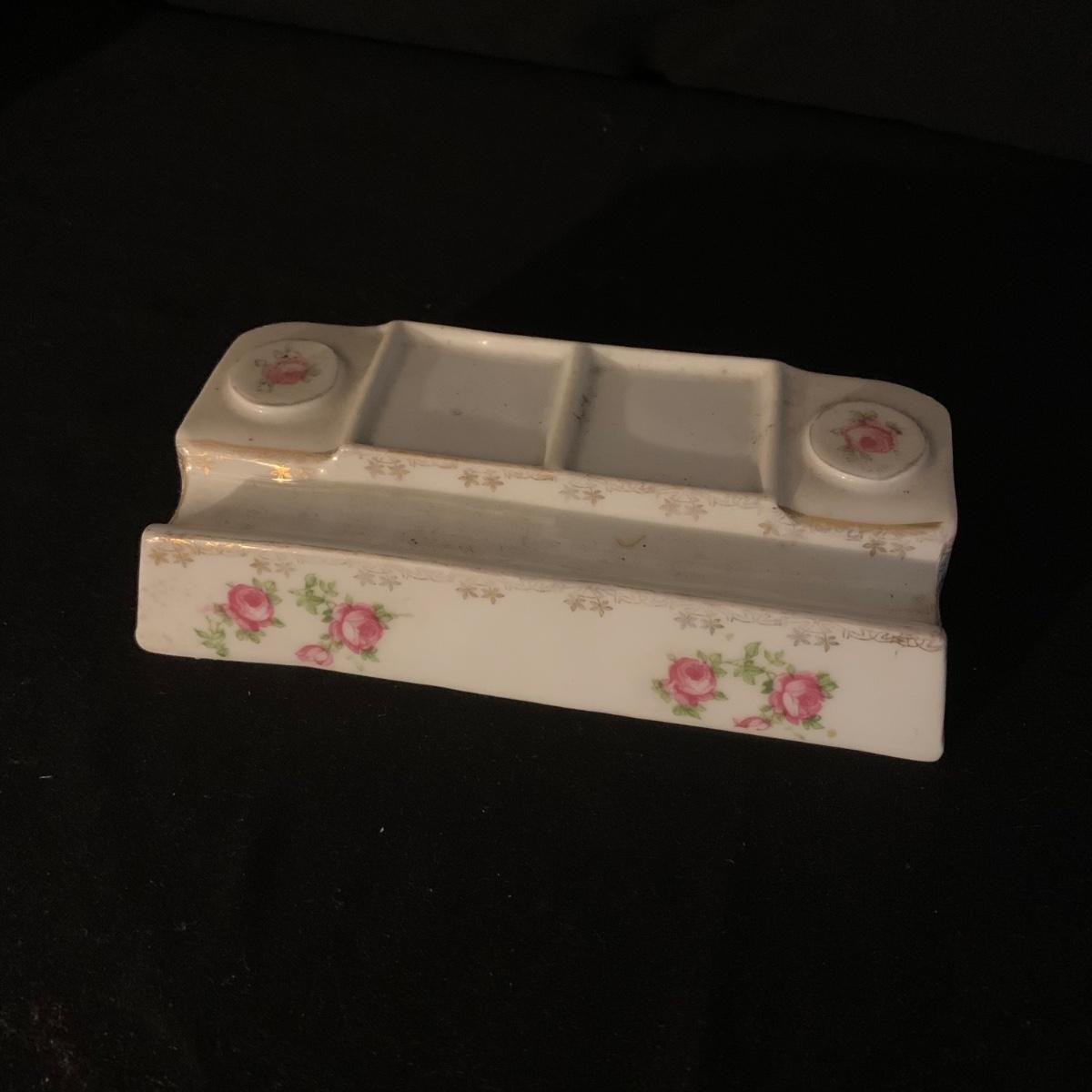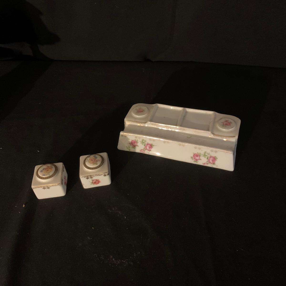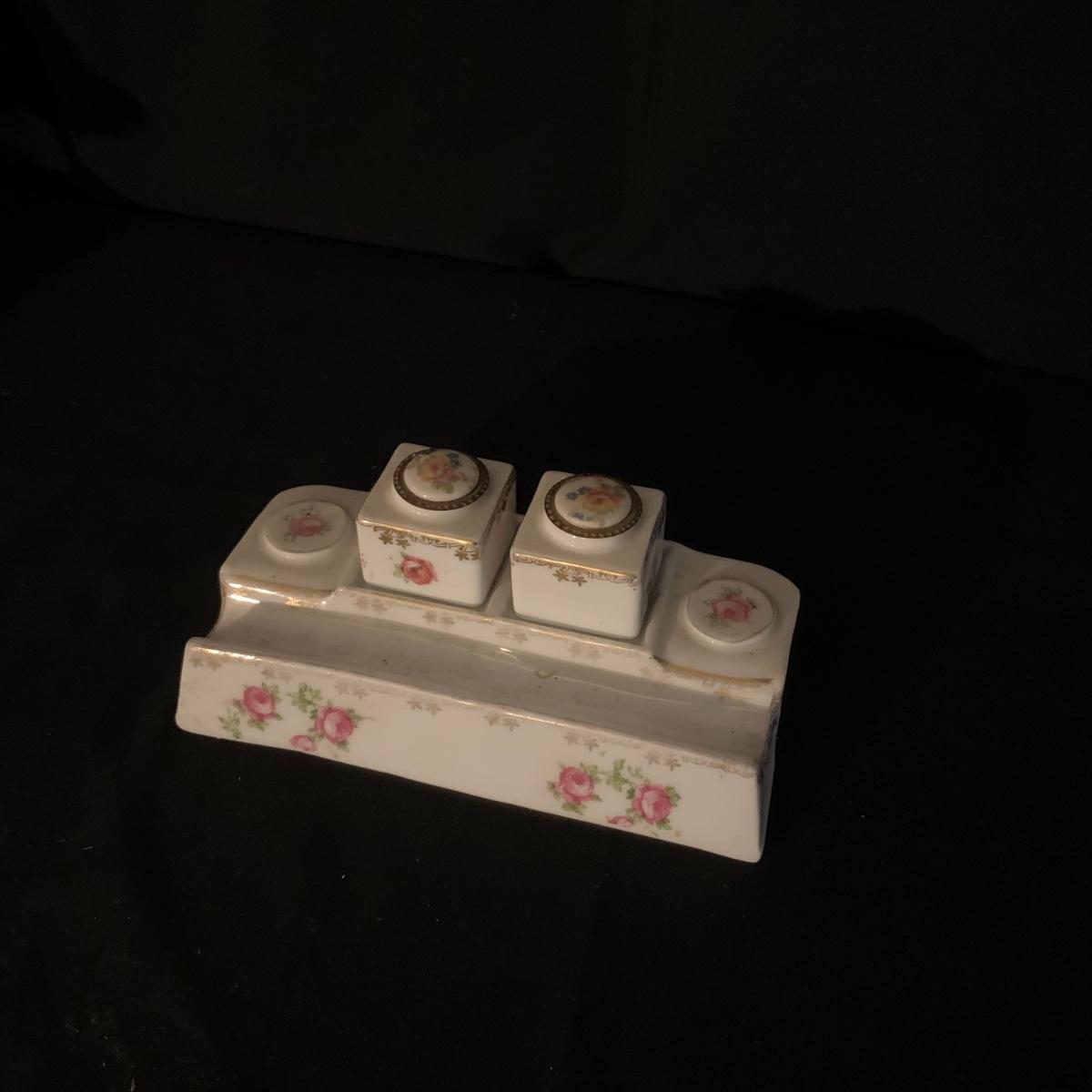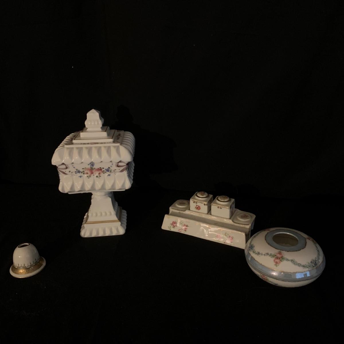 Included in this lot is a ceramic stand with matching top, one bowl with lid, and what appears to be a quill and ink holder. The pieces all appear to be ceramic. The stand with matching top measures about 10" x 6". Shipping available.