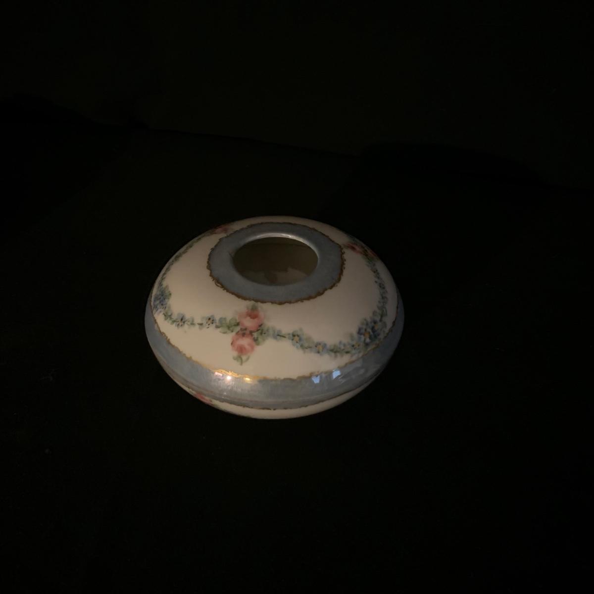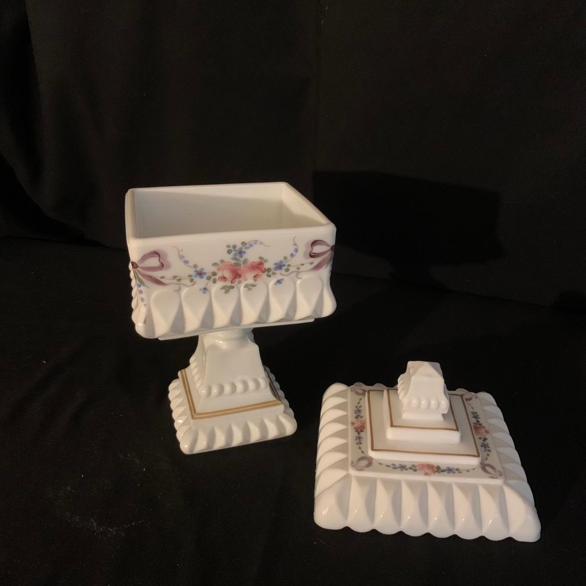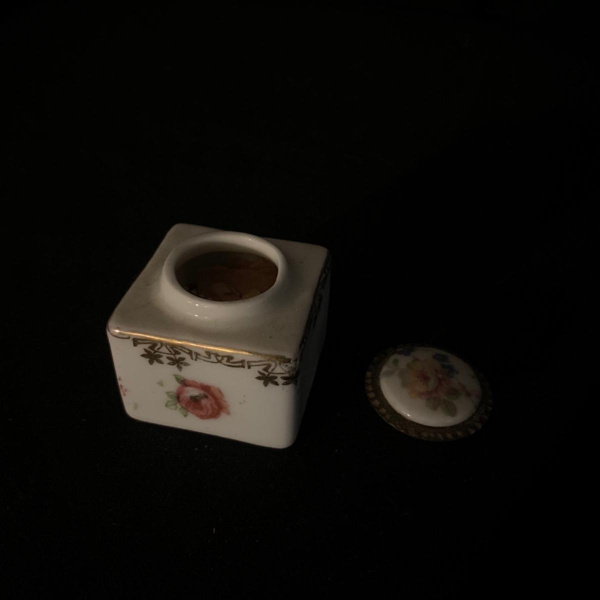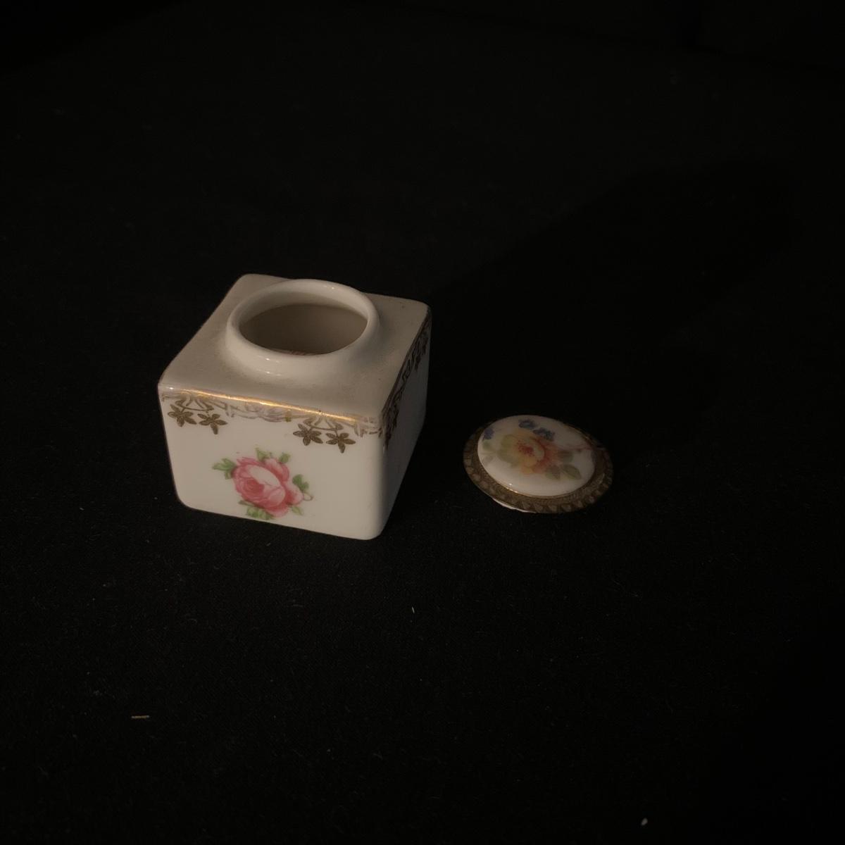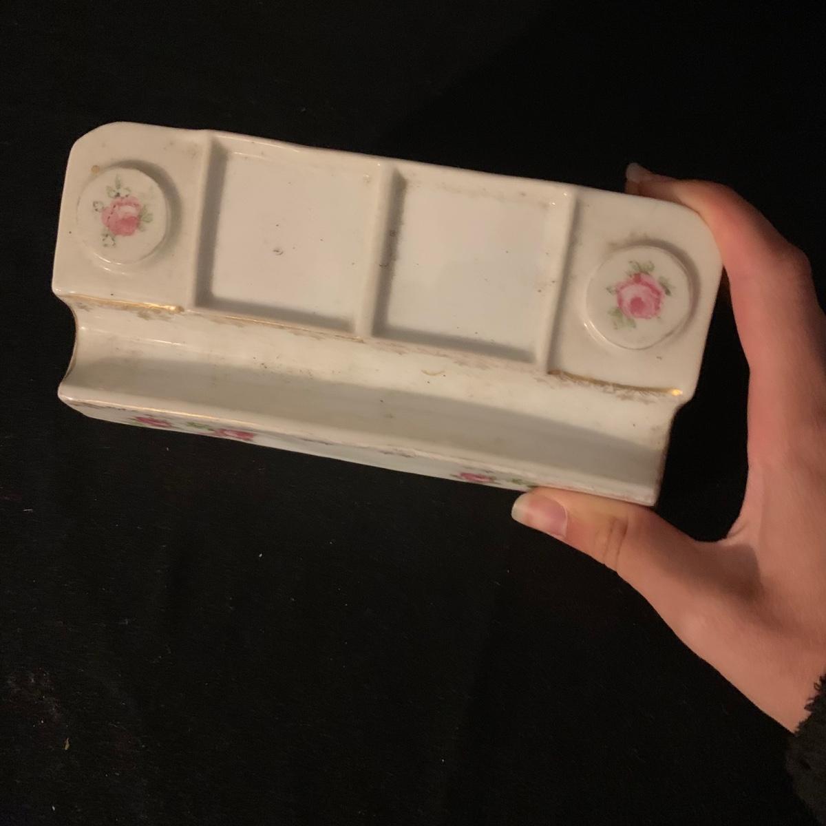 Included in this lot is a ceramic stand with matching top, one bowl with lid, and what appears to be a quill and ink holder. The pieces all appear to be ceramic. The stand with matching top measures about 10" x 6". Shipping available.