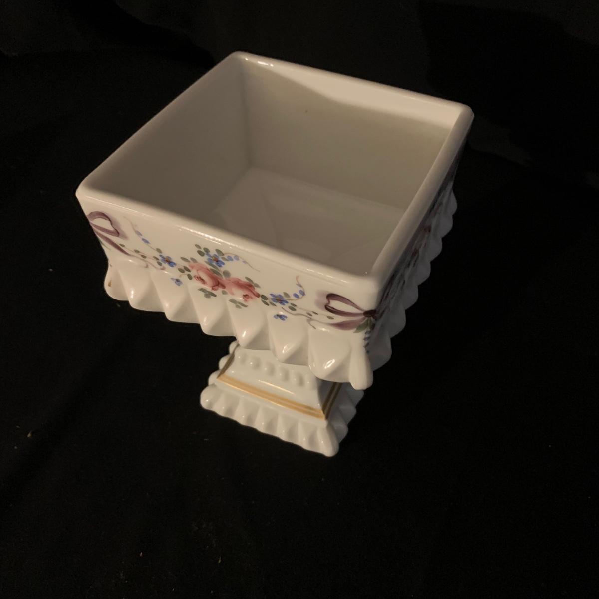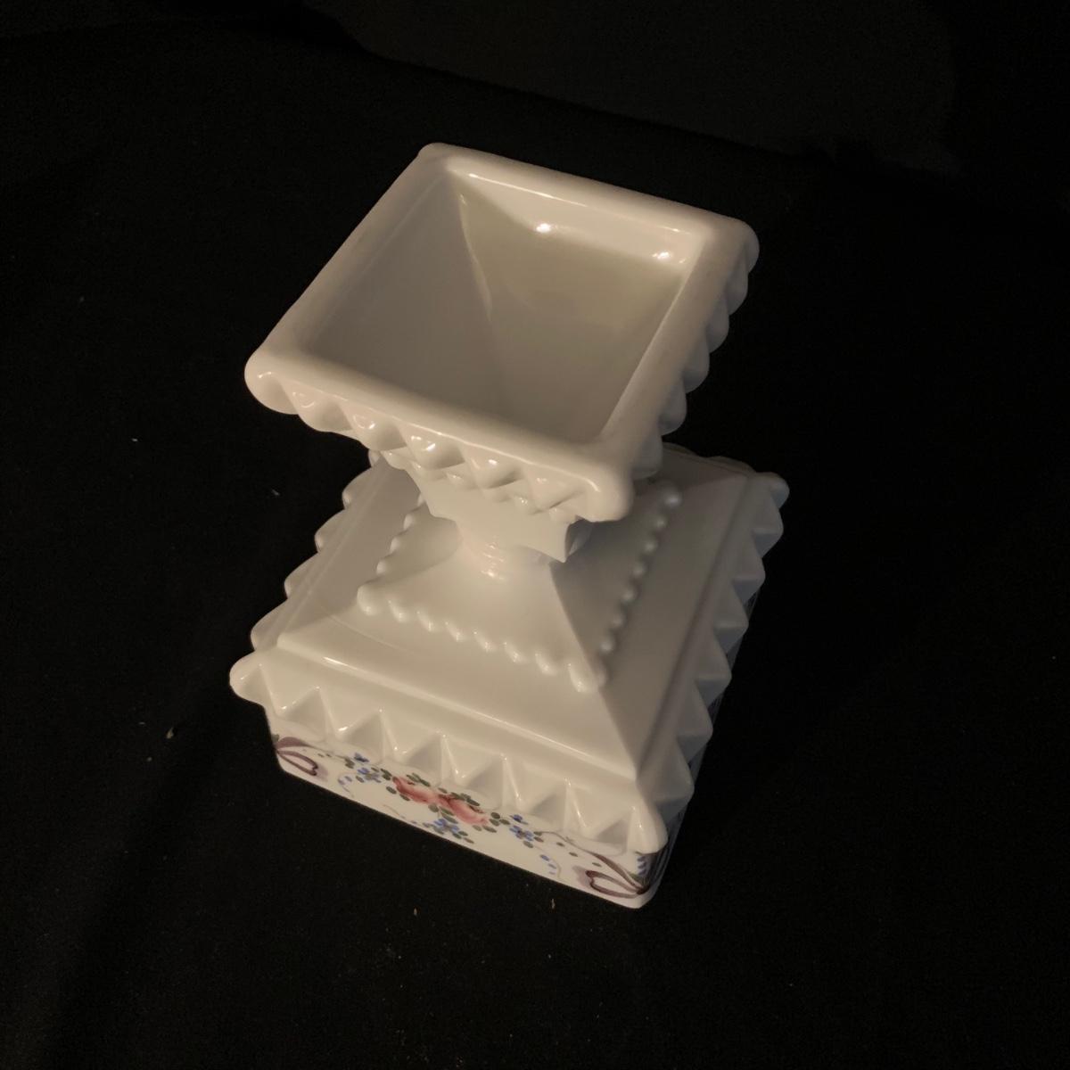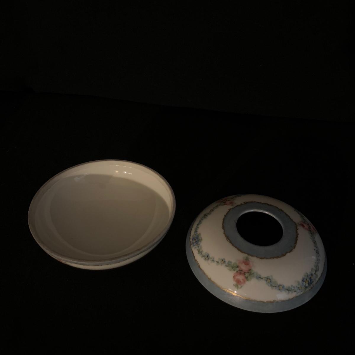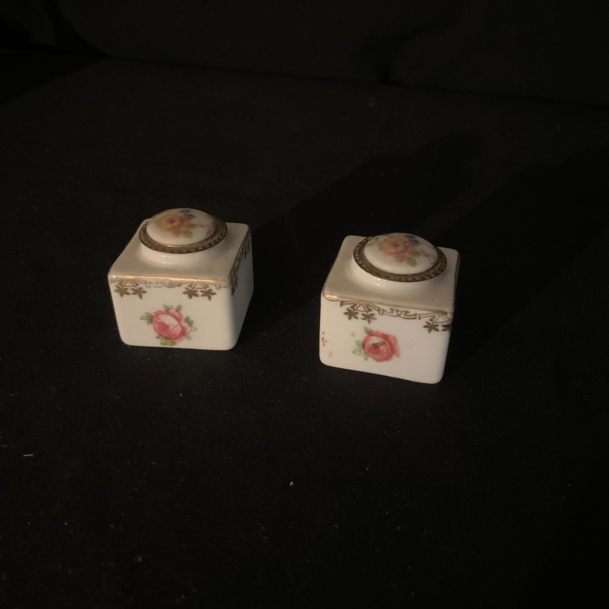Included in this lot is a ceramic stand with matching top, one bowl with lid, and what appears to be a quill and ink holder. The pieces all appear to be ceramic. The stand with matching top measures about 10" x 6". Shipping available.