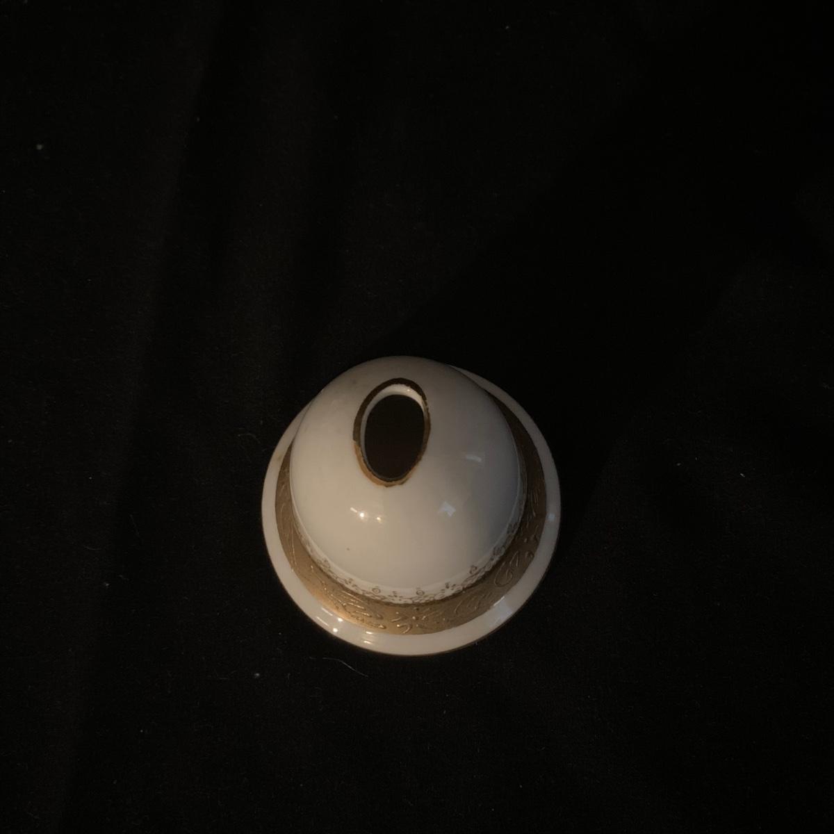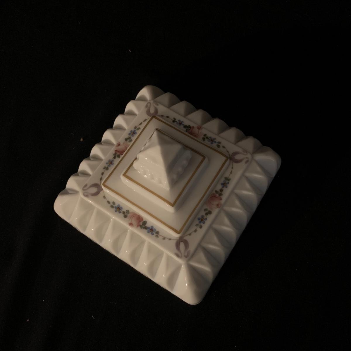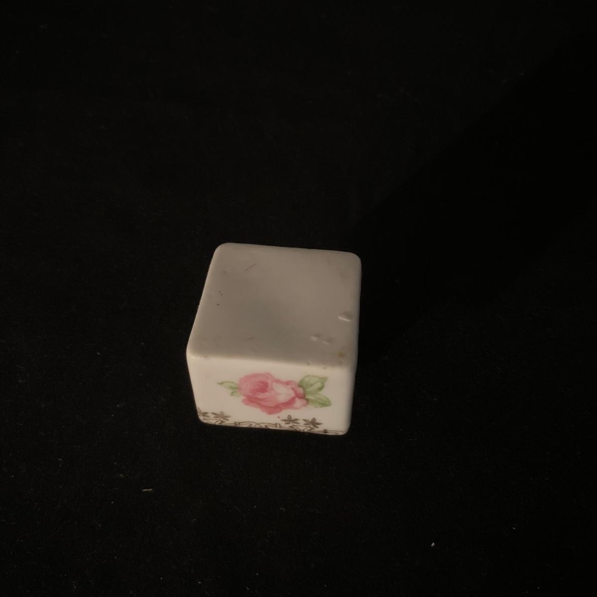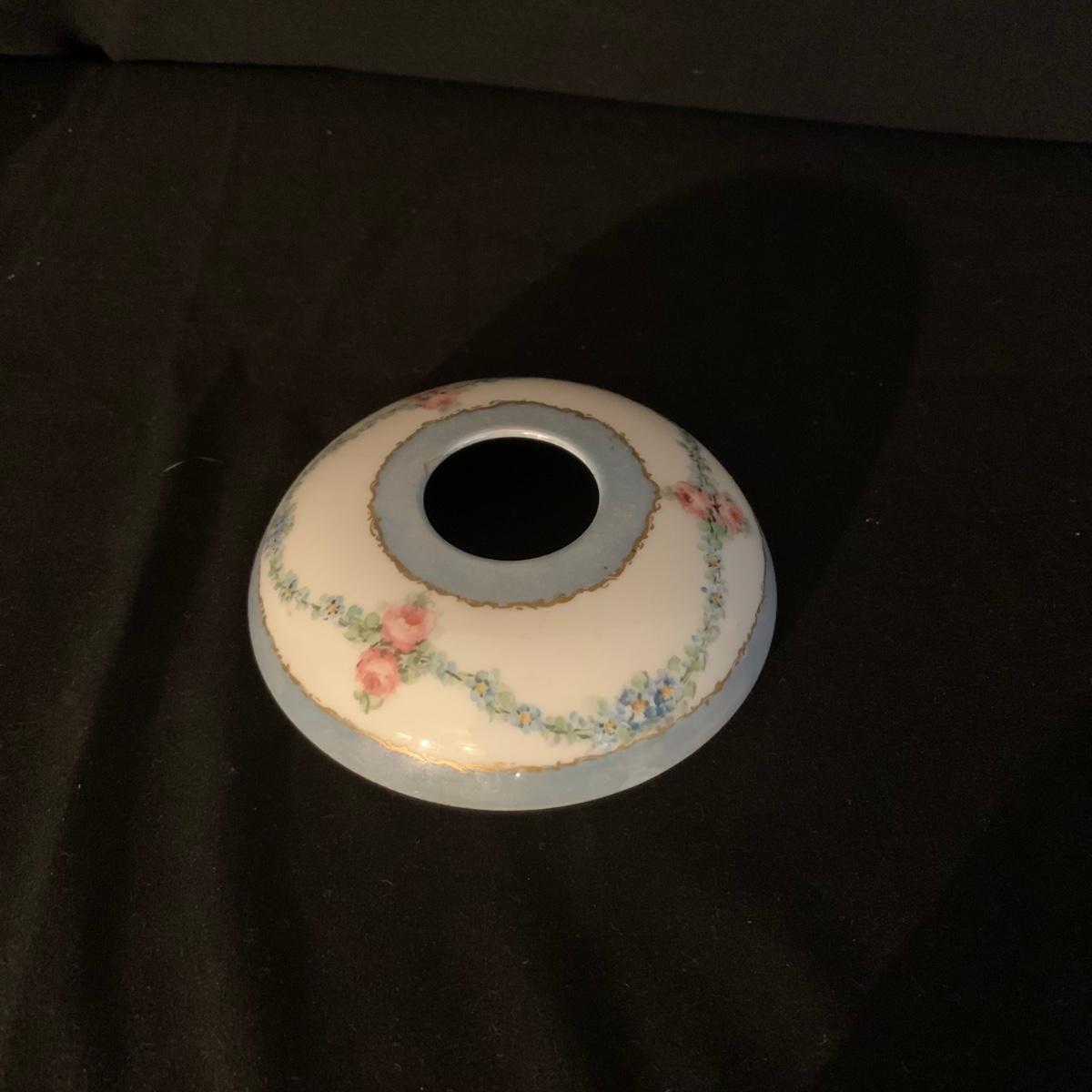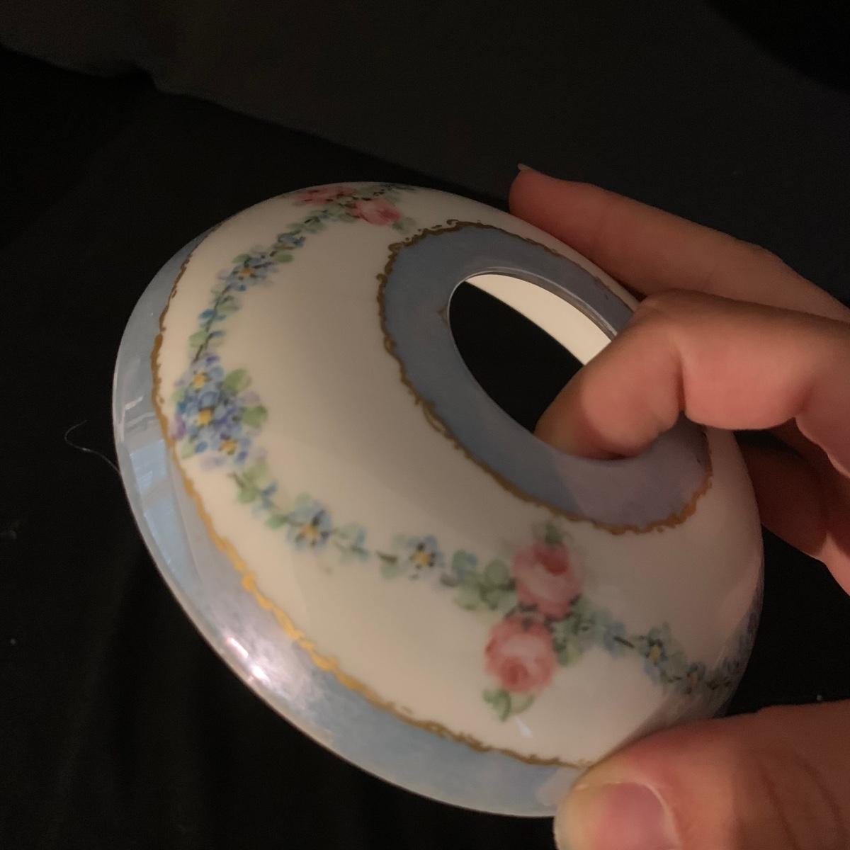 Included in this lot is a ceramic stand with matching top, one bowl with lid, and what appears to be a quill and ink holder. The pieces all appear to be ceramic. The stand with matching top measures about 10" x 6". Shipping available.