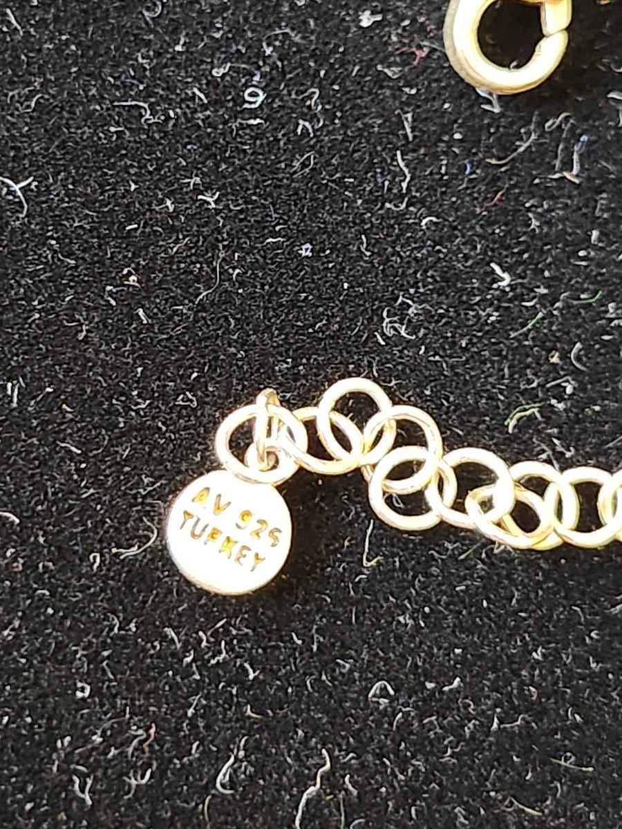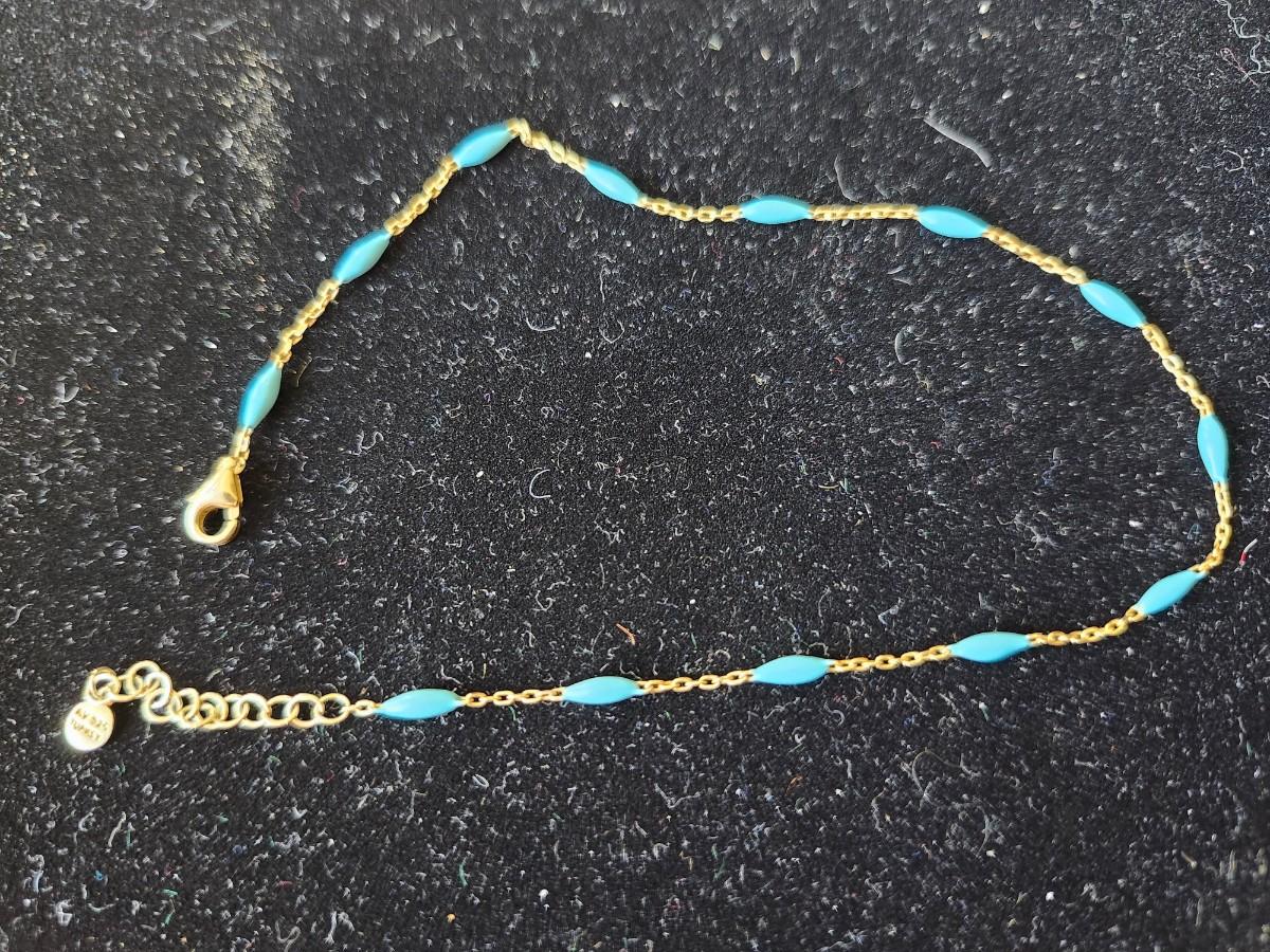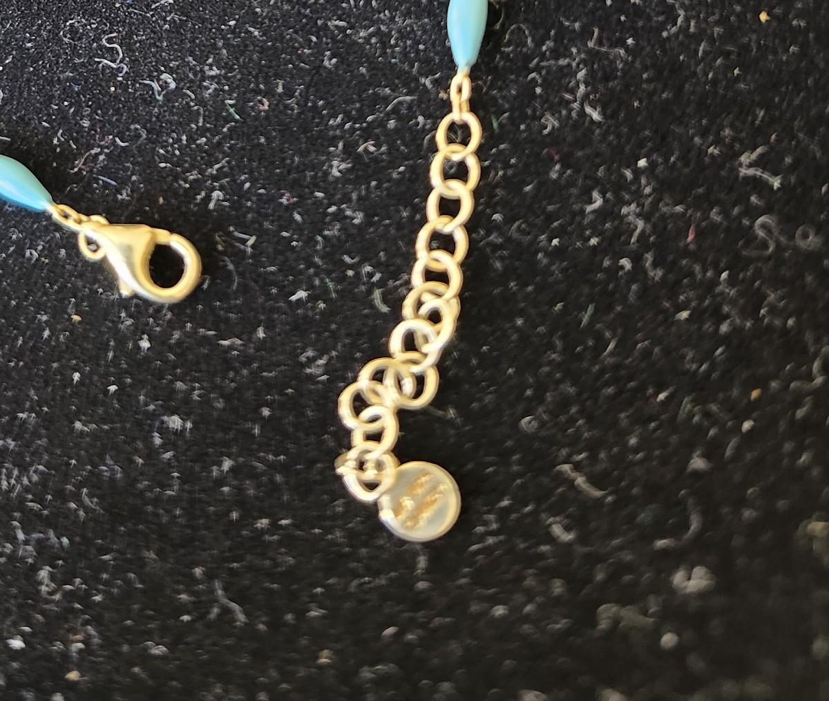 the chains between the beads tests at 10L gold. The beads are probably turquoise. The catch is marked