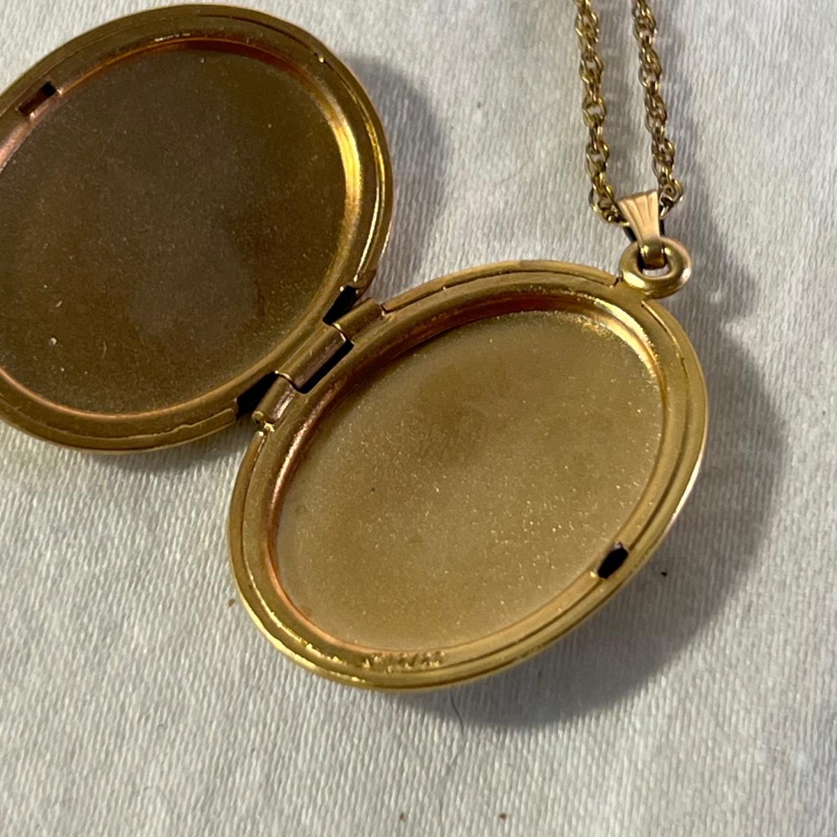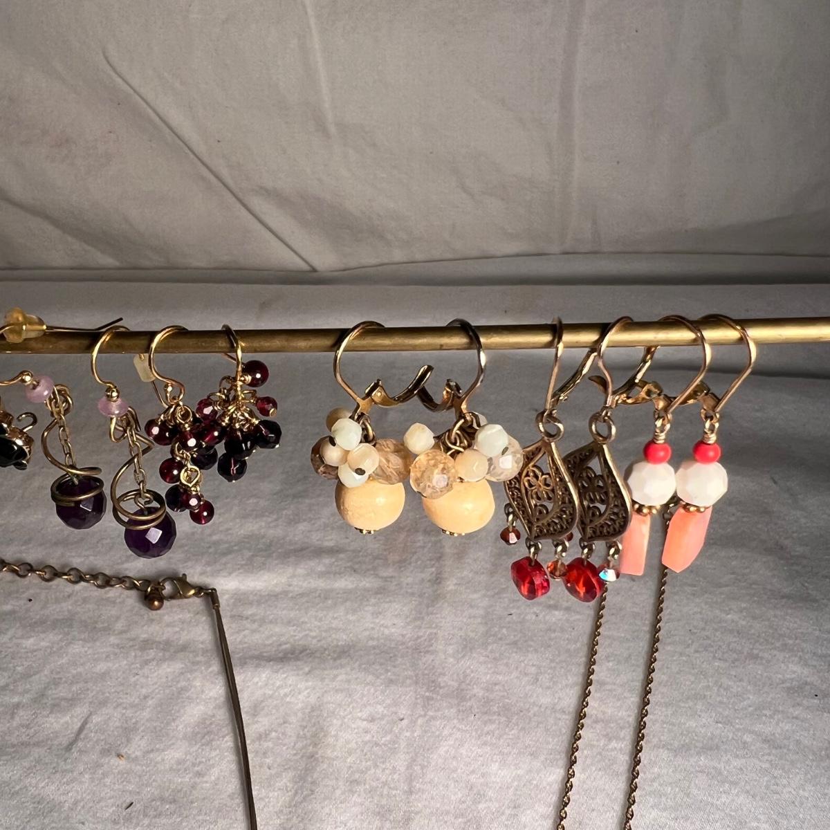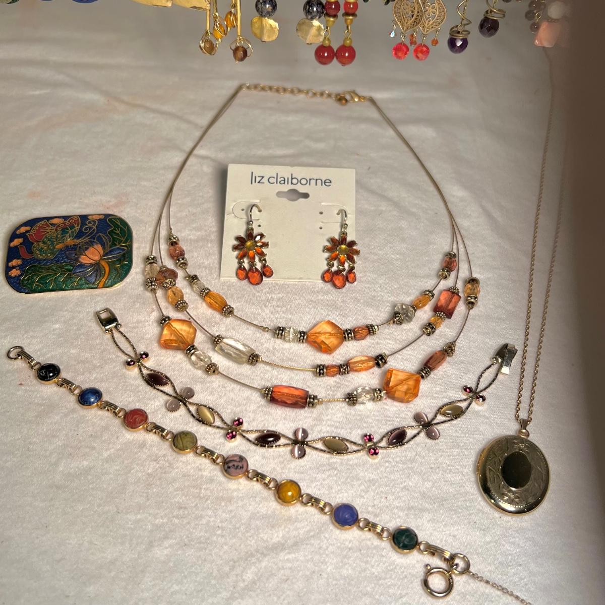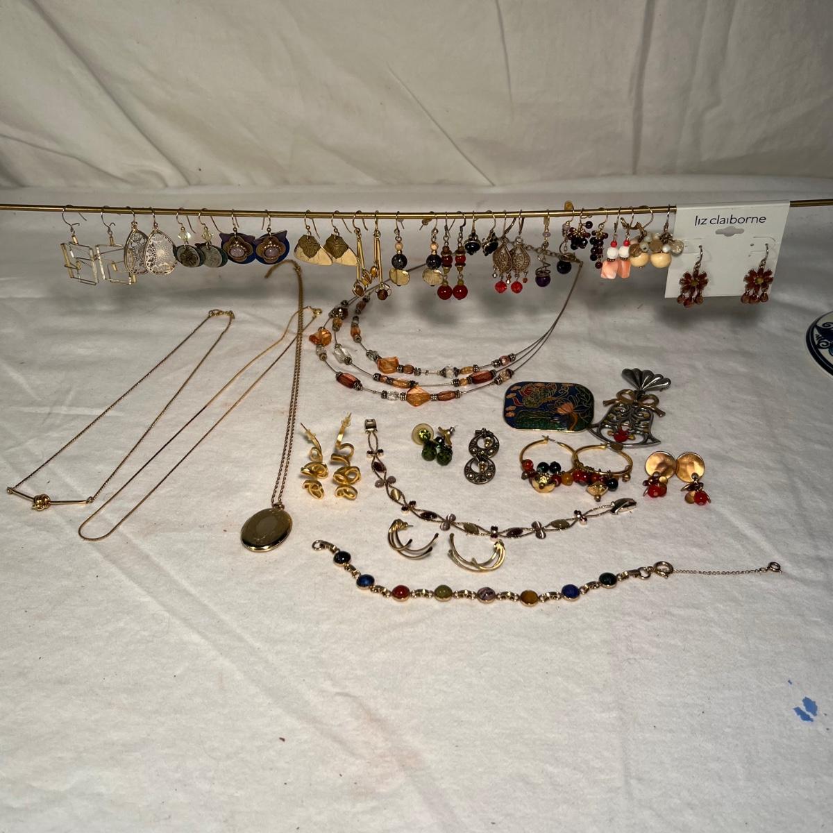 The locket measures 21” long and is gold plated. Two gold colored chains and a three strand beaded necklace also included. Two delicate bracelets have stones and beads plus there are 30 plus earrings for pierced ears and two brooches. Please see photos for all markings found.