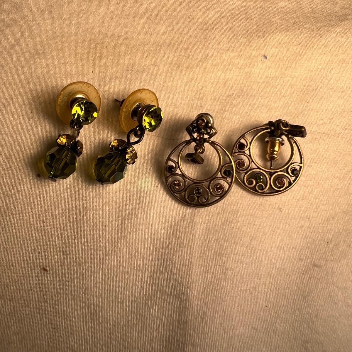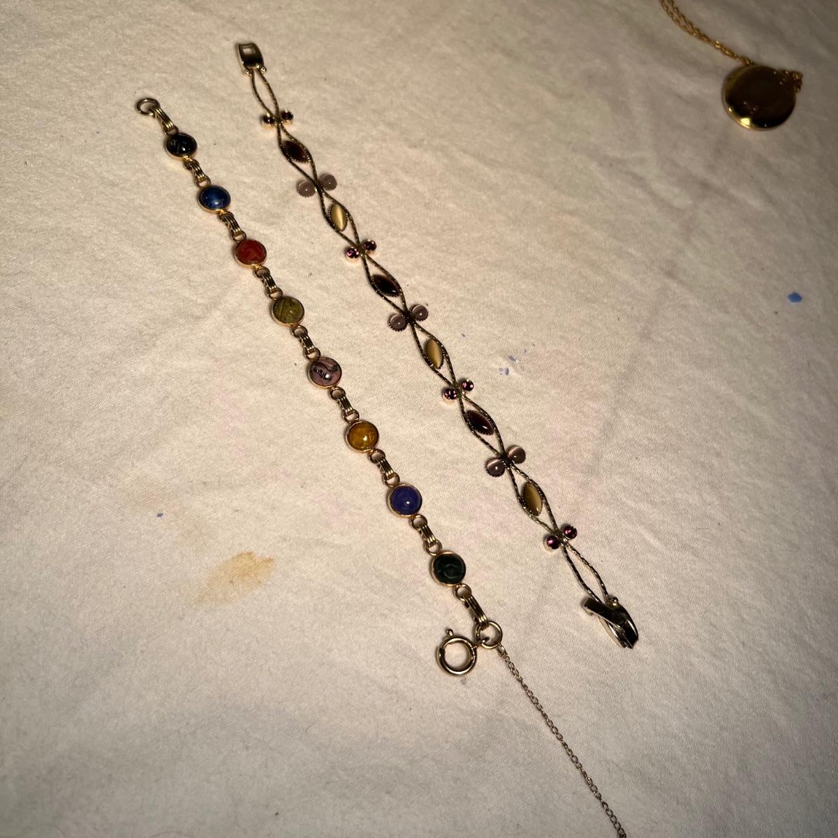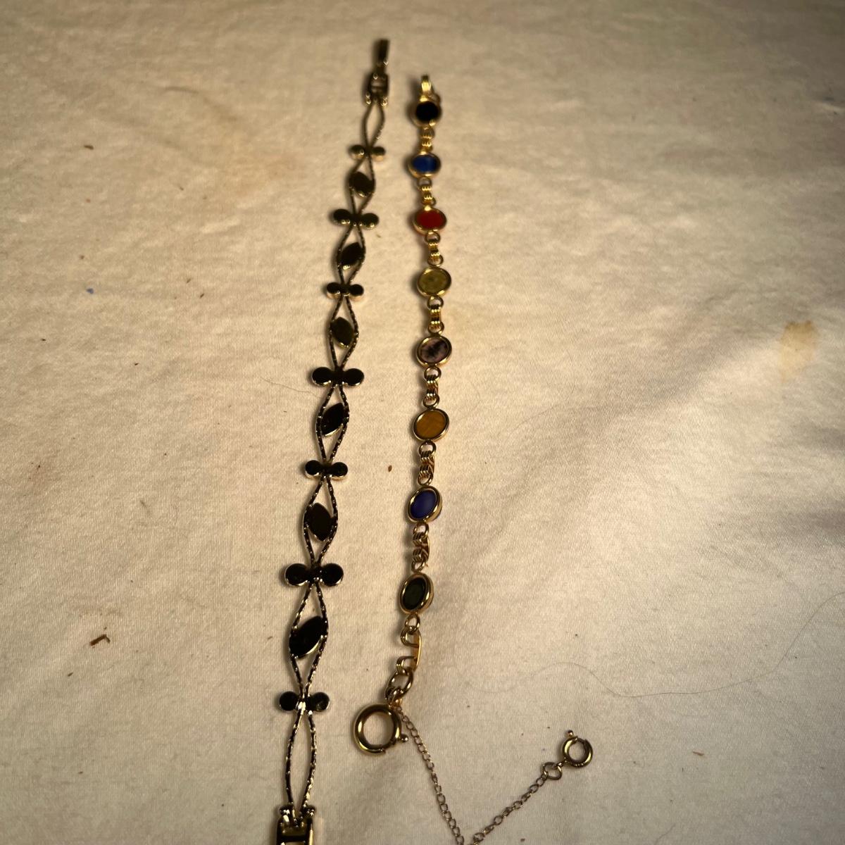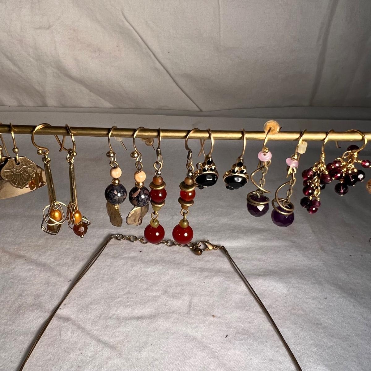 The locket measures 21” long and is gold plated. Two gold colored chains and a three strand beaded necklace also included. Two delicate bracelets have stones and beads plus there are 30 plus earrings for pierced ears and two brooches. Please see photos for all markings found.