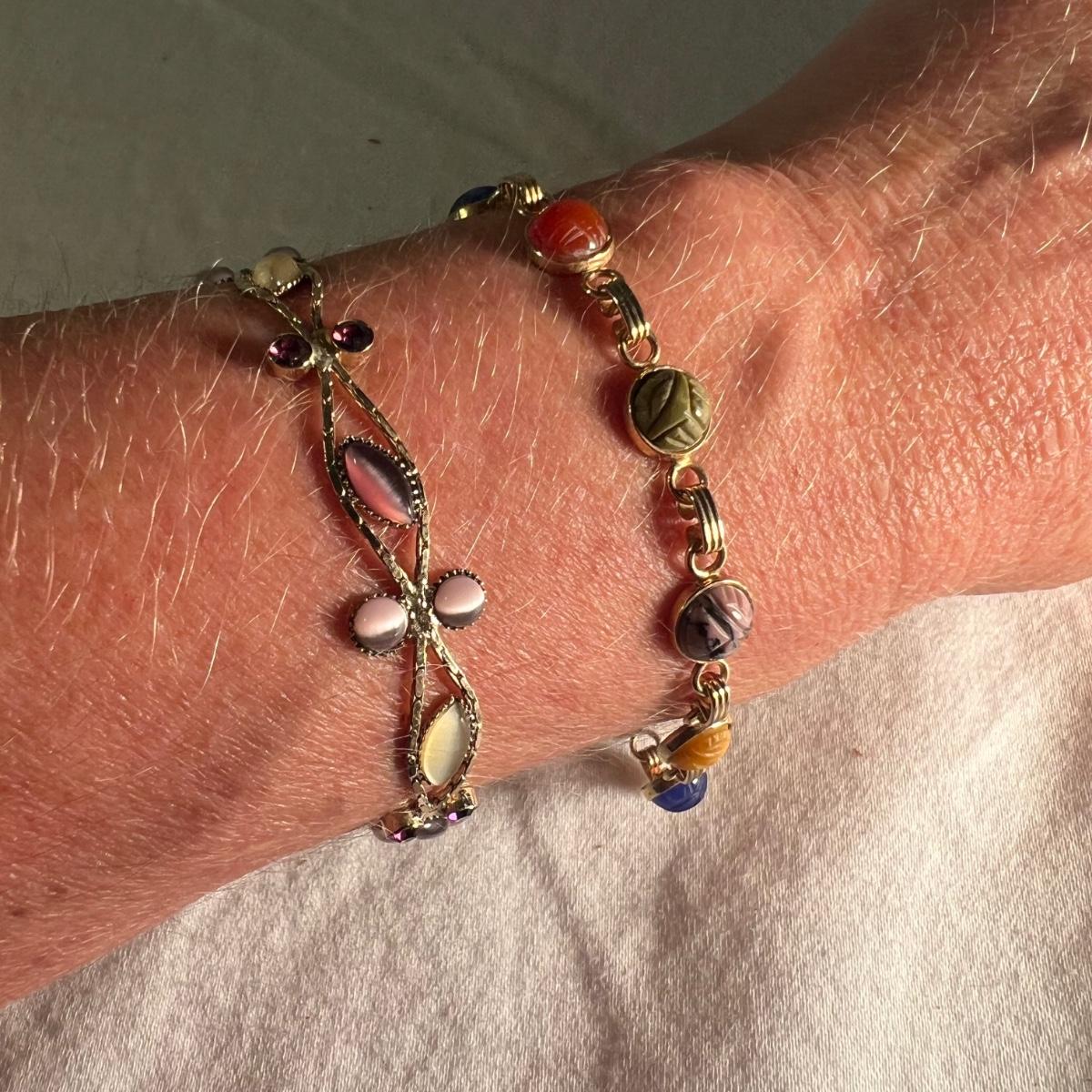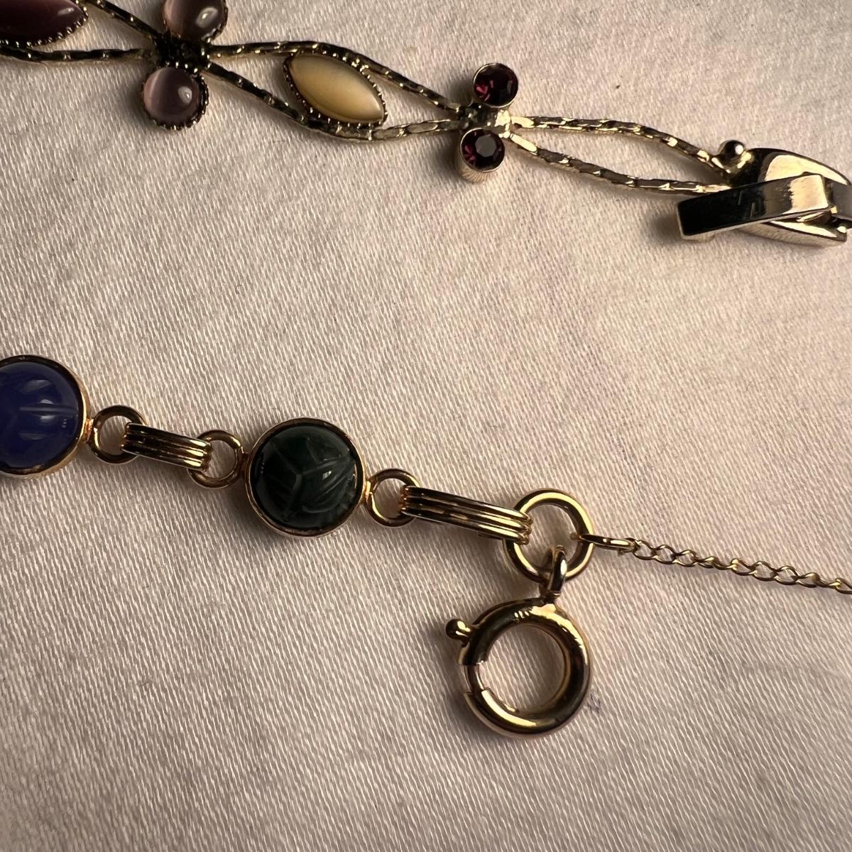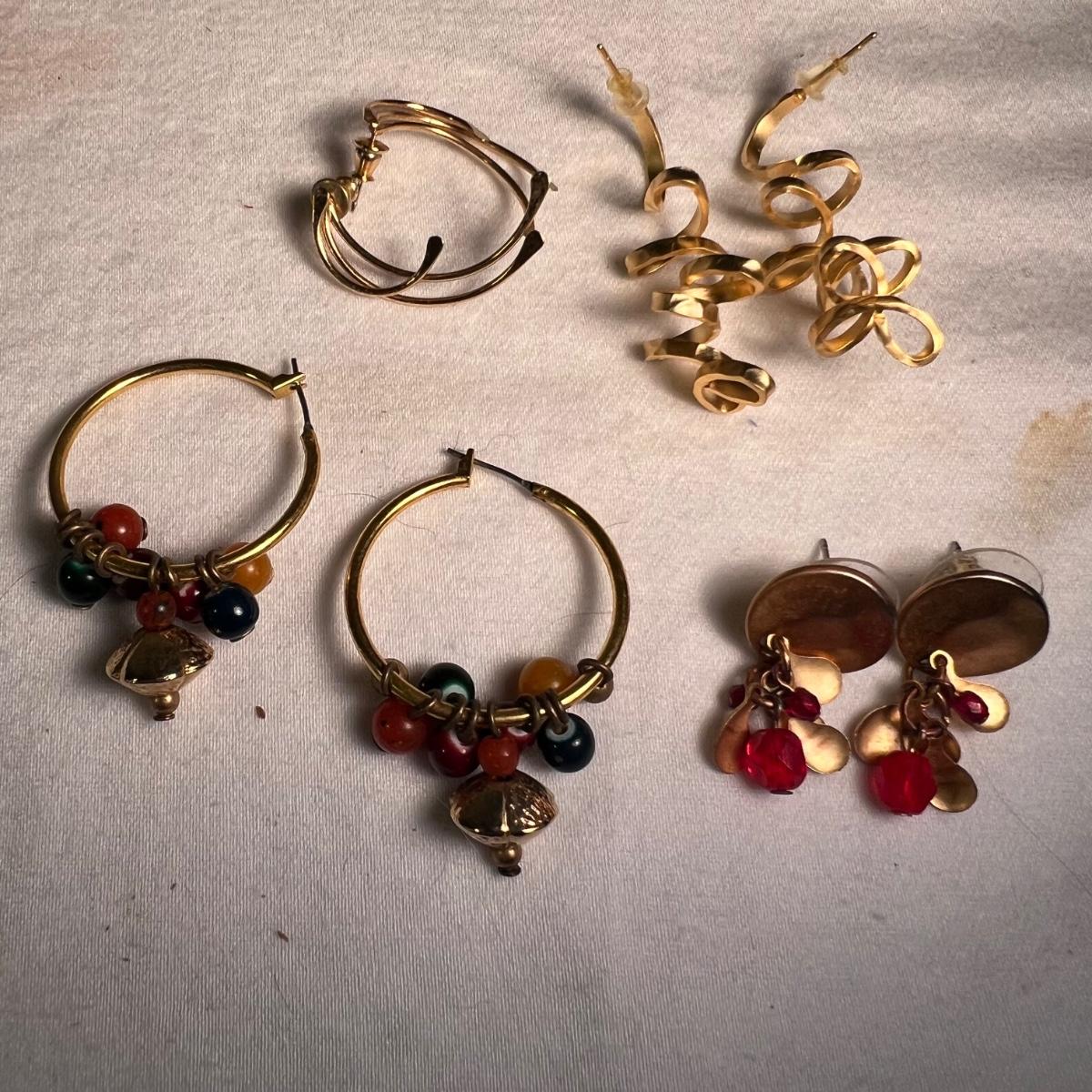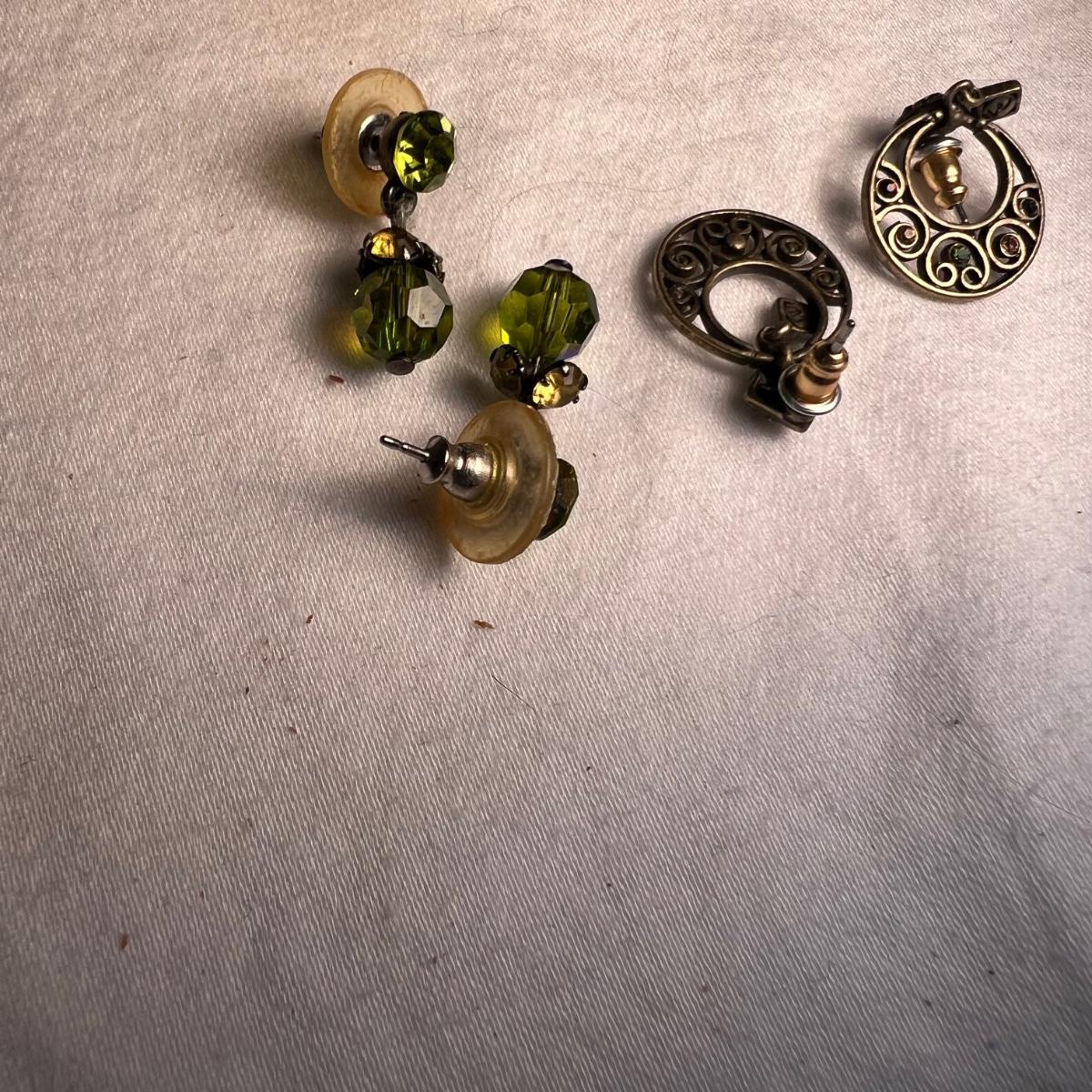 The locket measures 21” long and is gold plated. Two gold colored chains and a three strand beaded necklace also included. Two delicate bracelets have stones and beads plus there are 30 plus earrings for pierced ears and two brooches. Please see photos for all markings found.