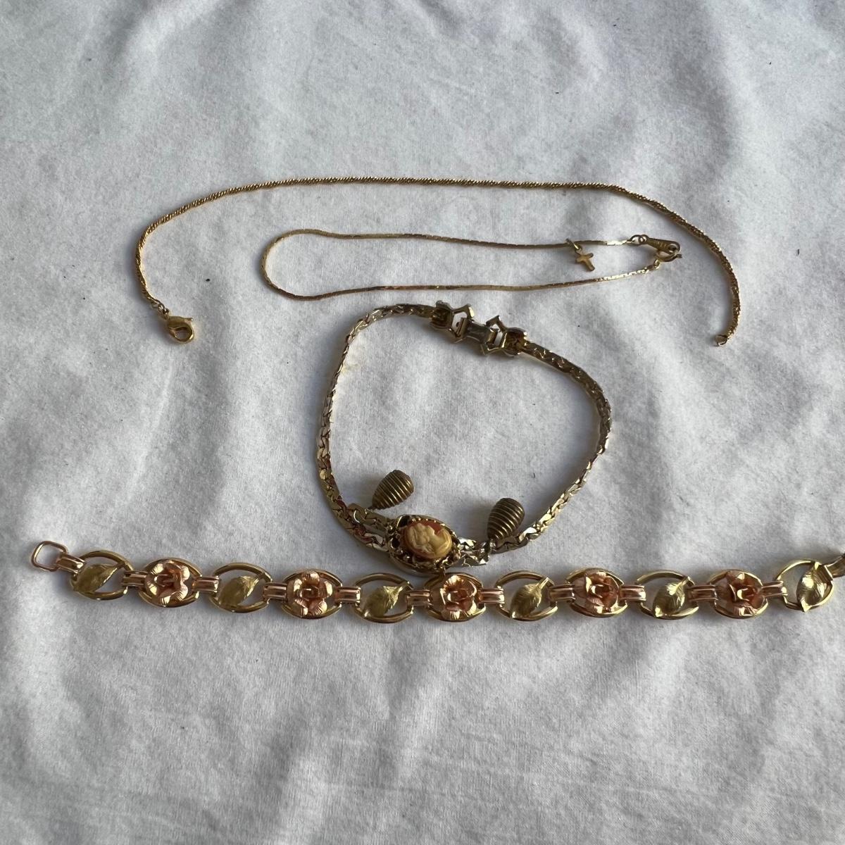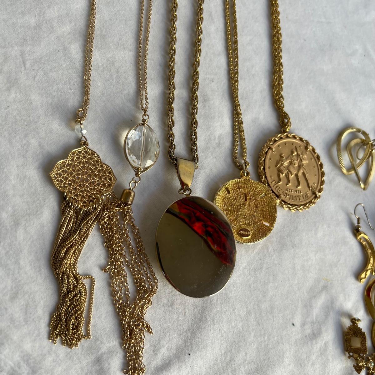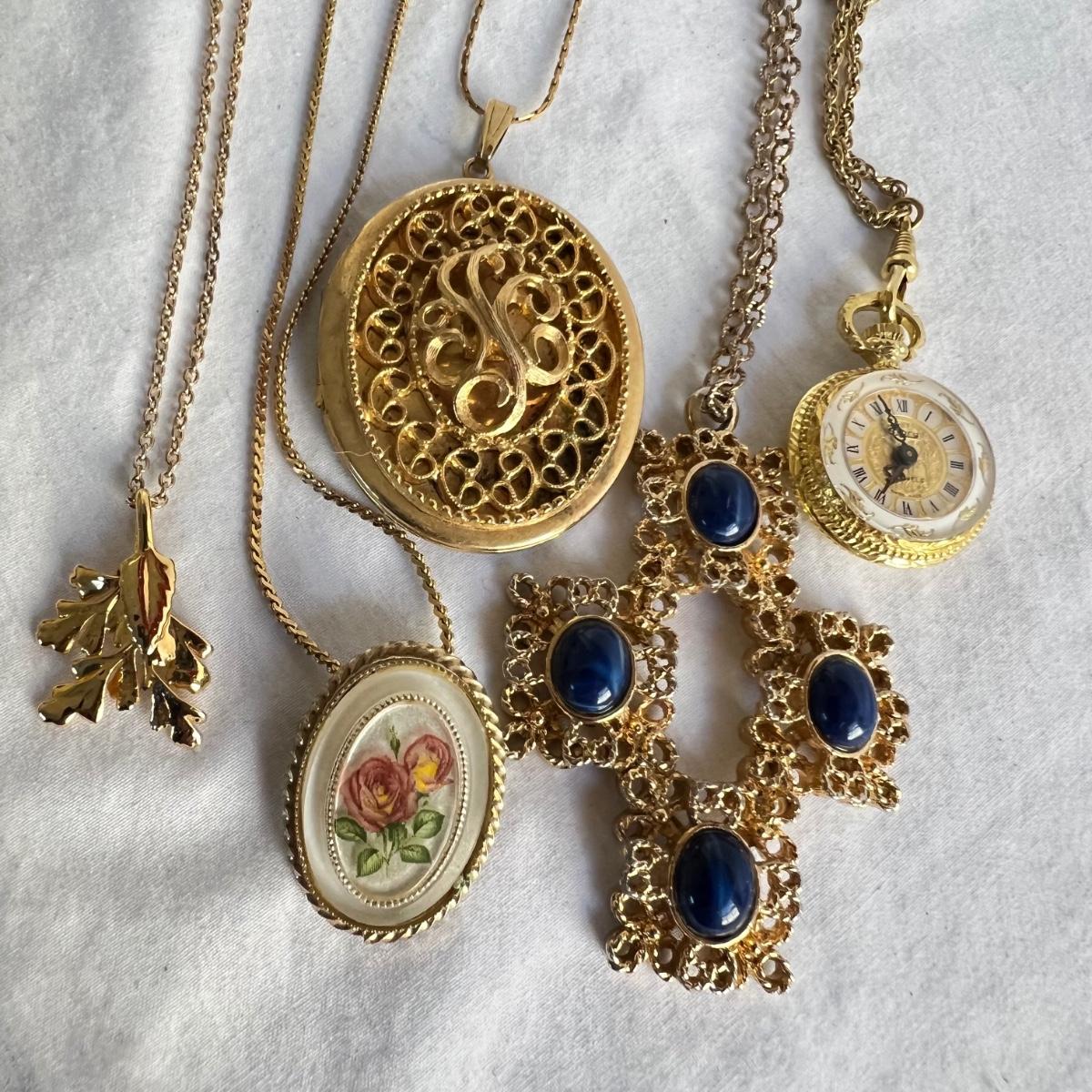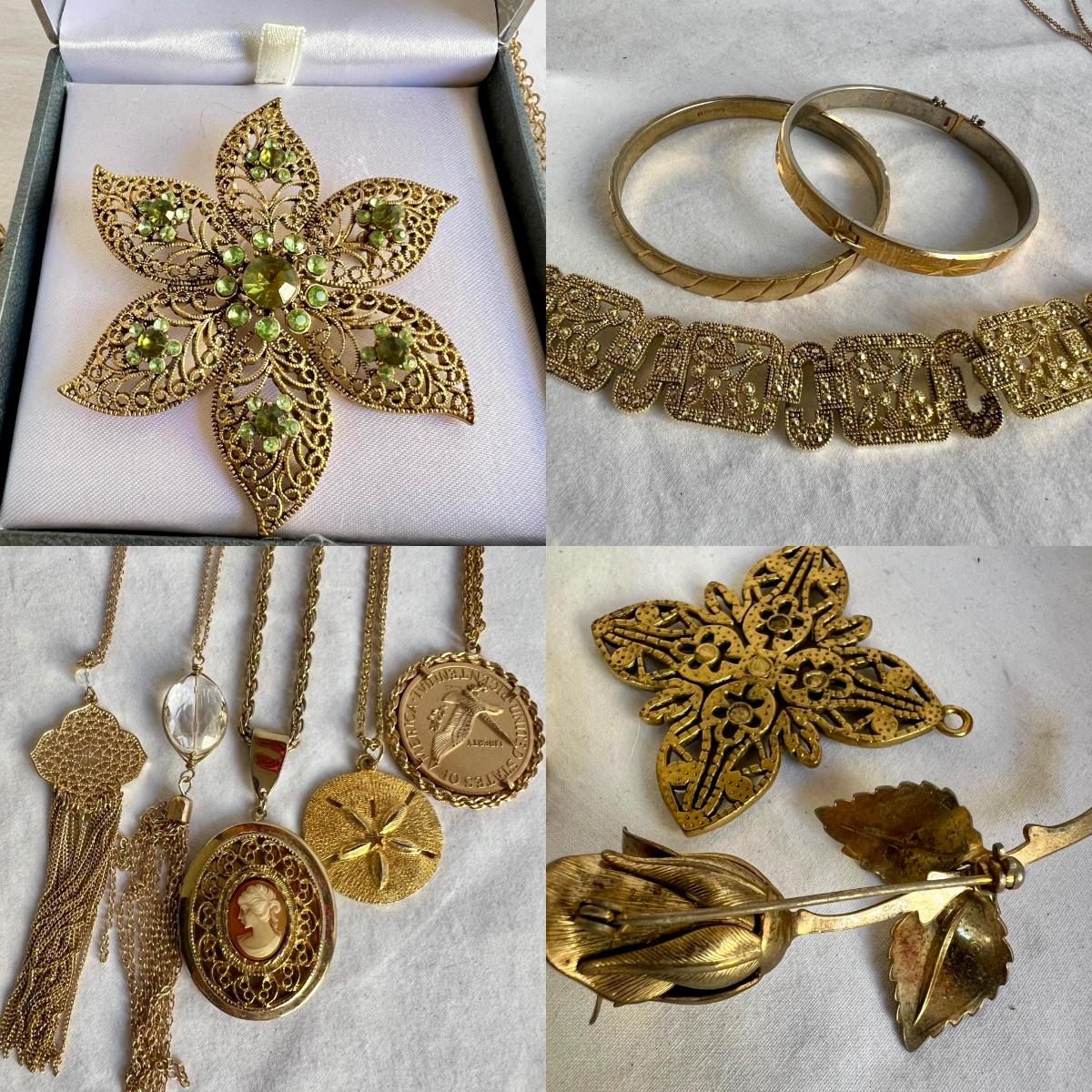 Over 40 items includes earrings (for pierced ears), necklaces, bracelets and brooches. Pieces have a vintage gold toned color. See images for full inventory. Watch on chain has not been tested. All sales are final, no refunds so please bid accordingly.