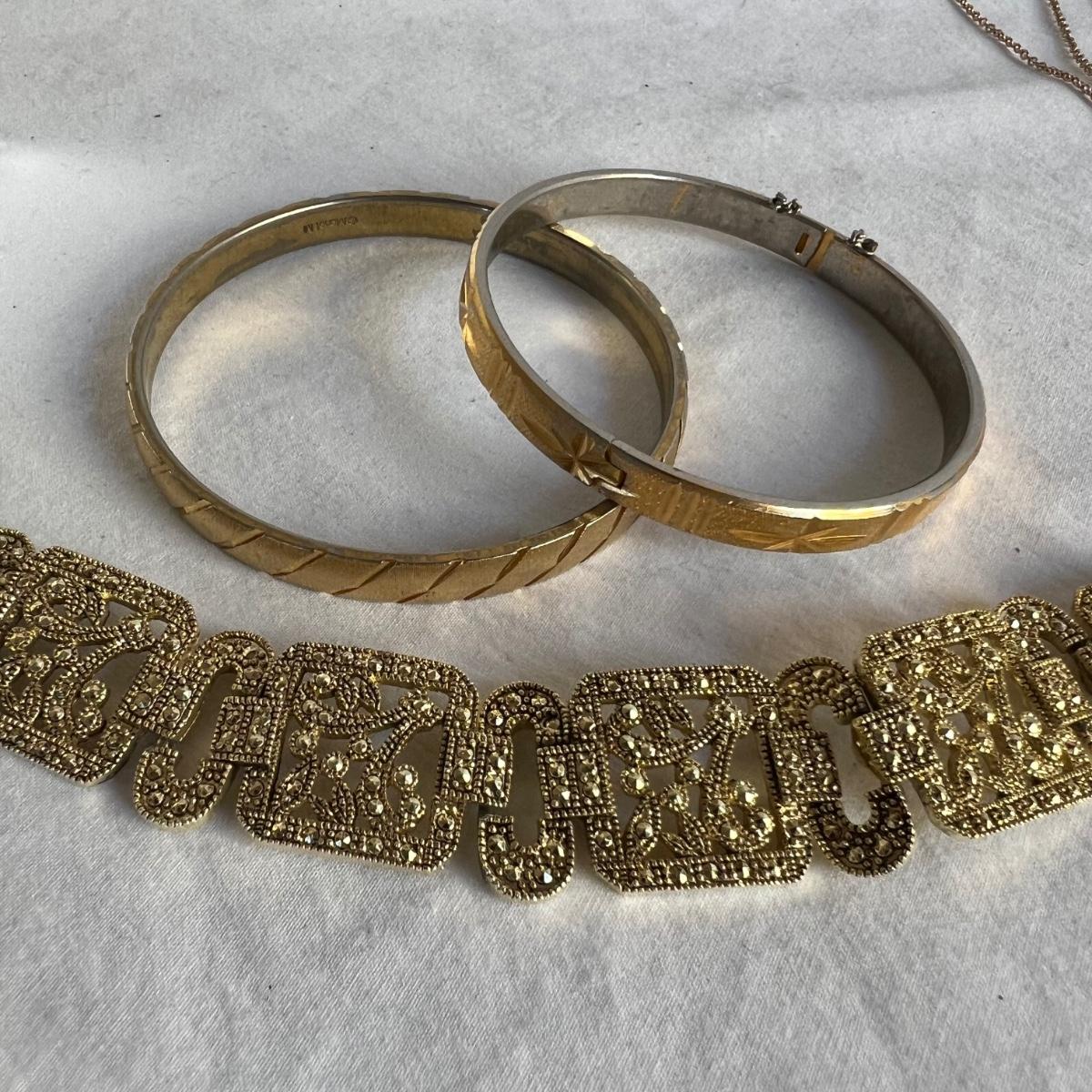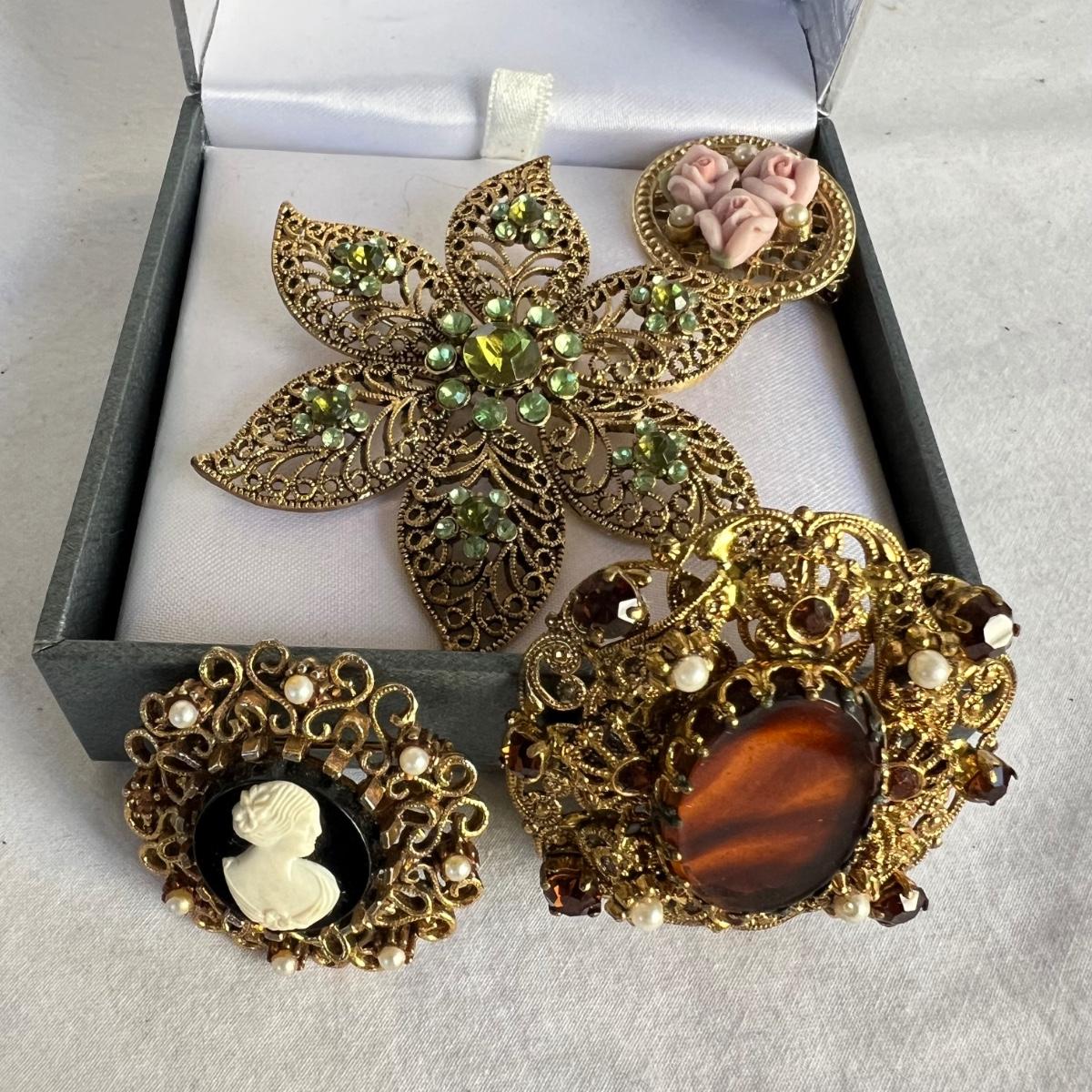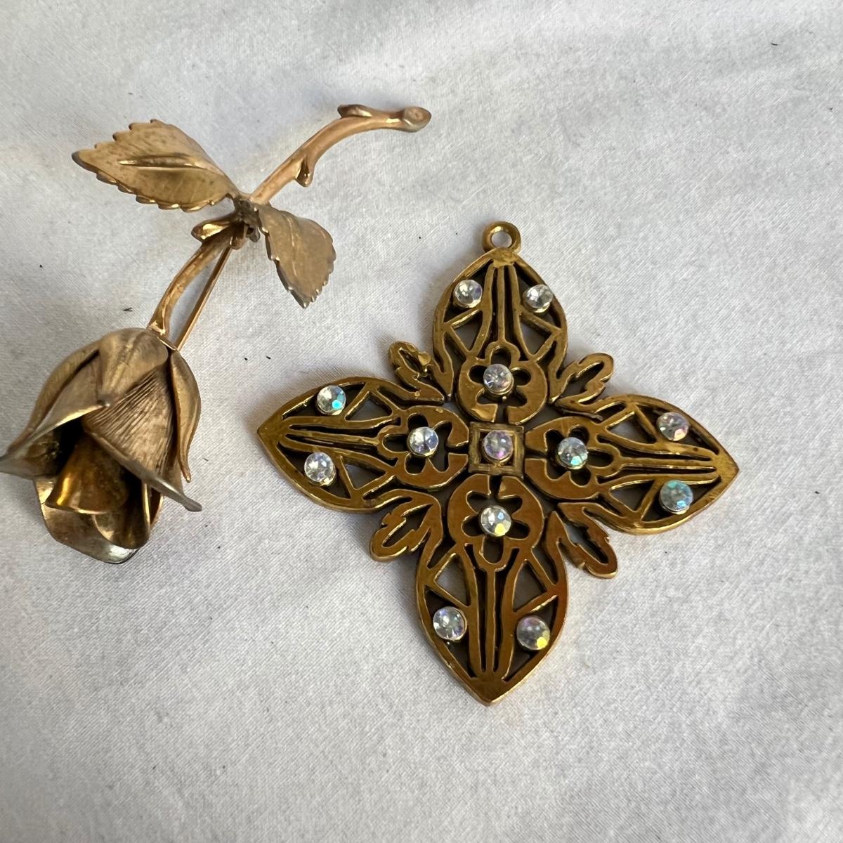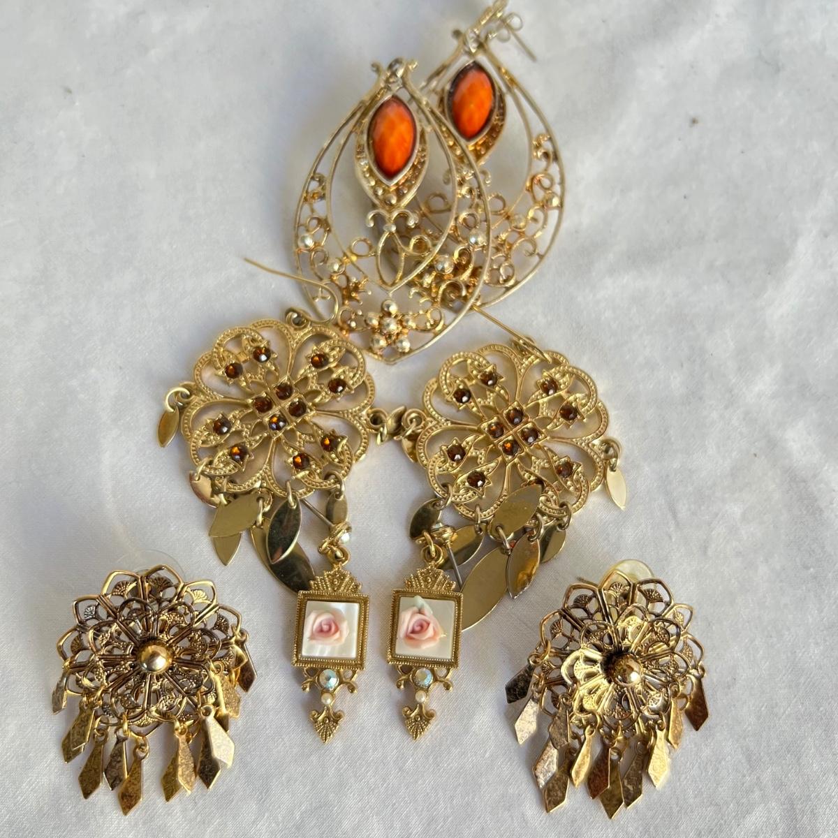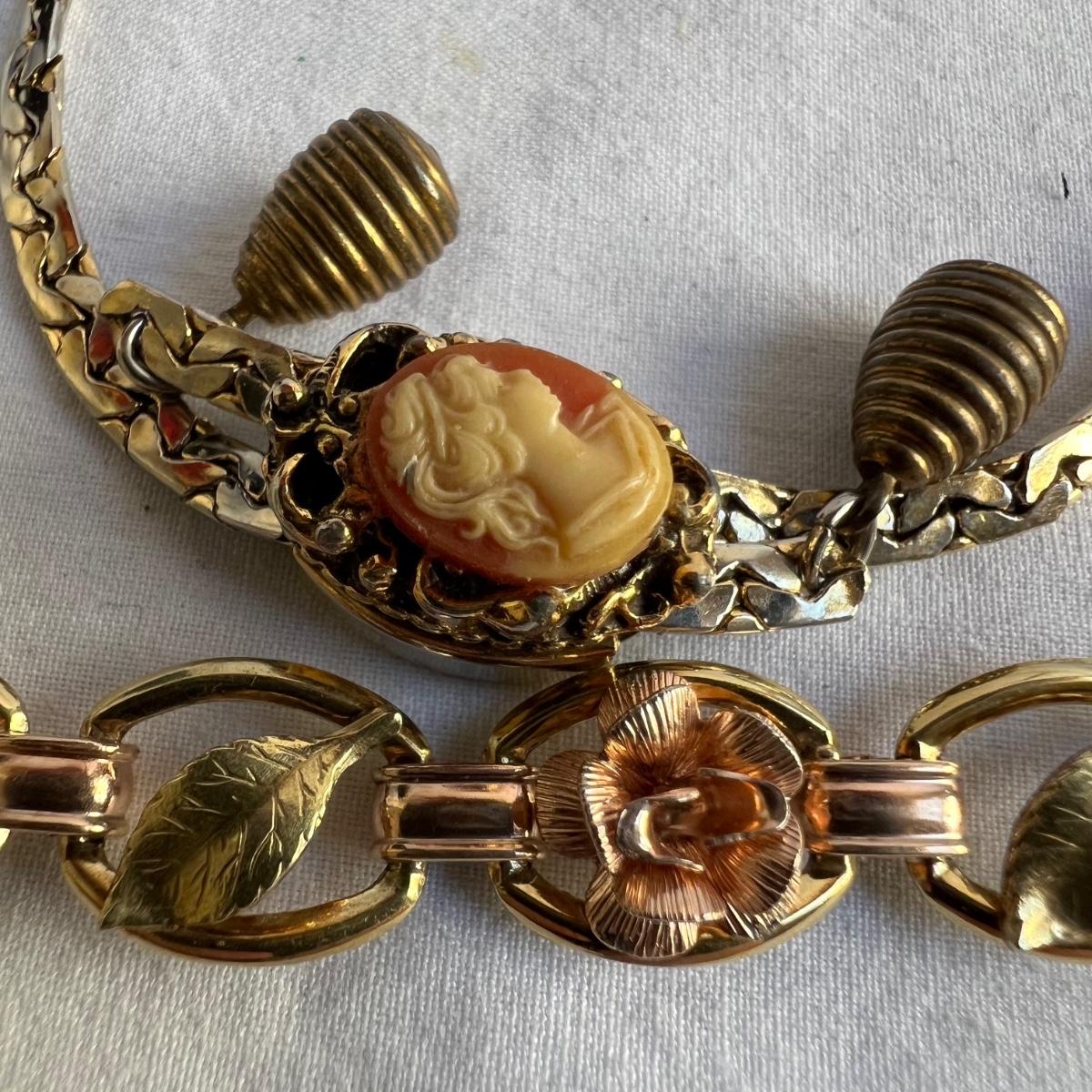 Over 40 items includes earrings (for pierced ears), necklaces, bracelets and brooches. Pieces have a vintage gold toned color. See images for full inventory. Watch on chain has not been tested. All sales are final, no refunds so please bid accordingly.