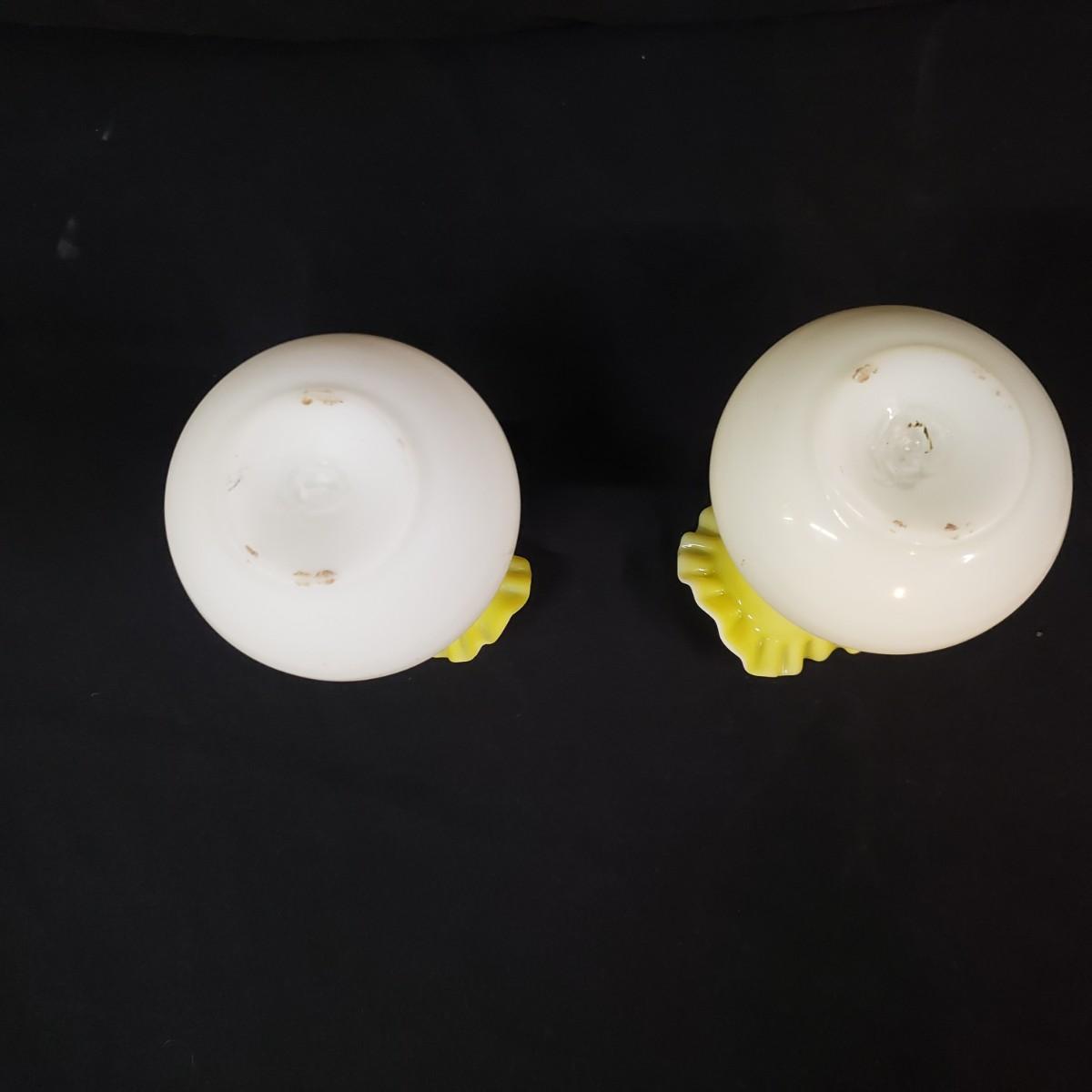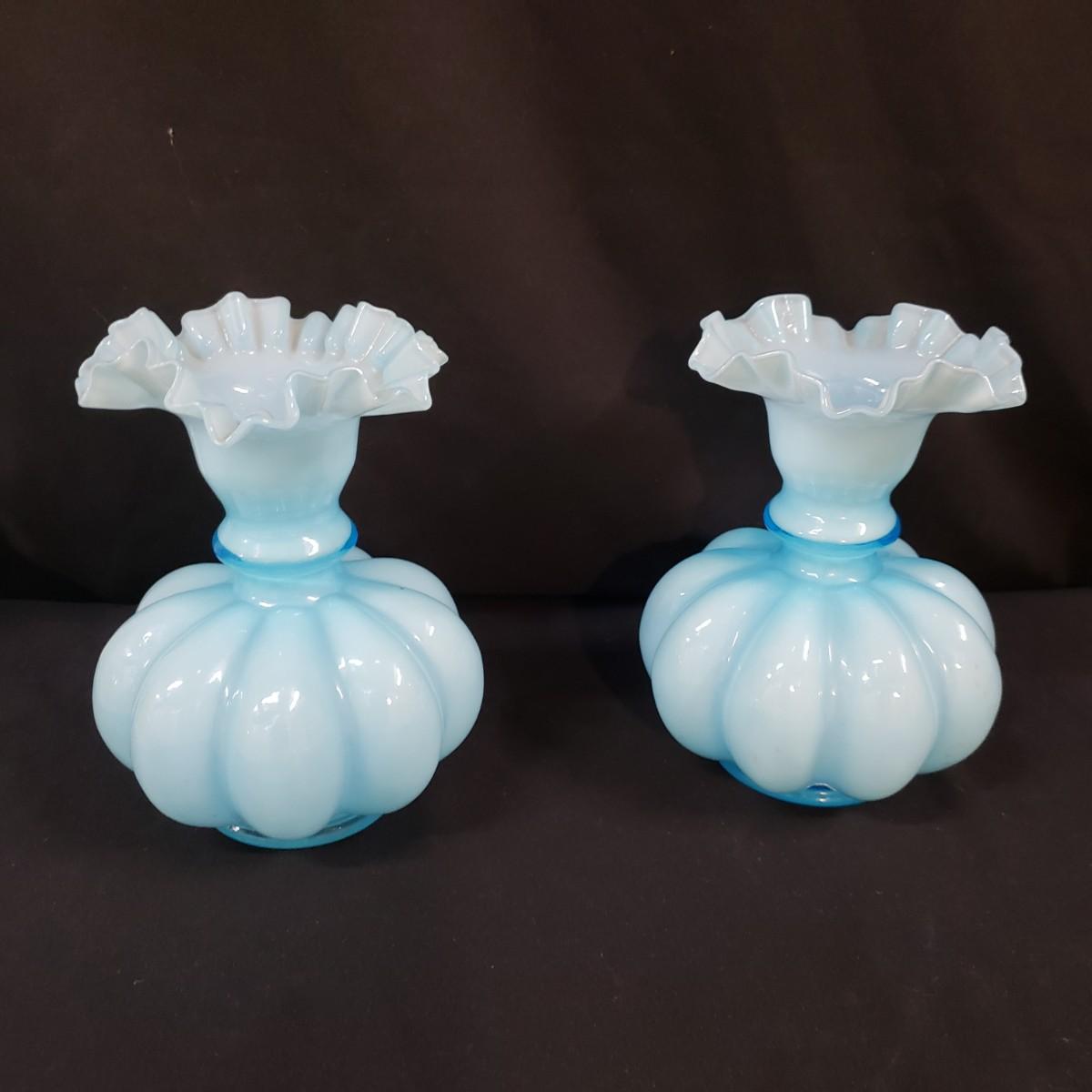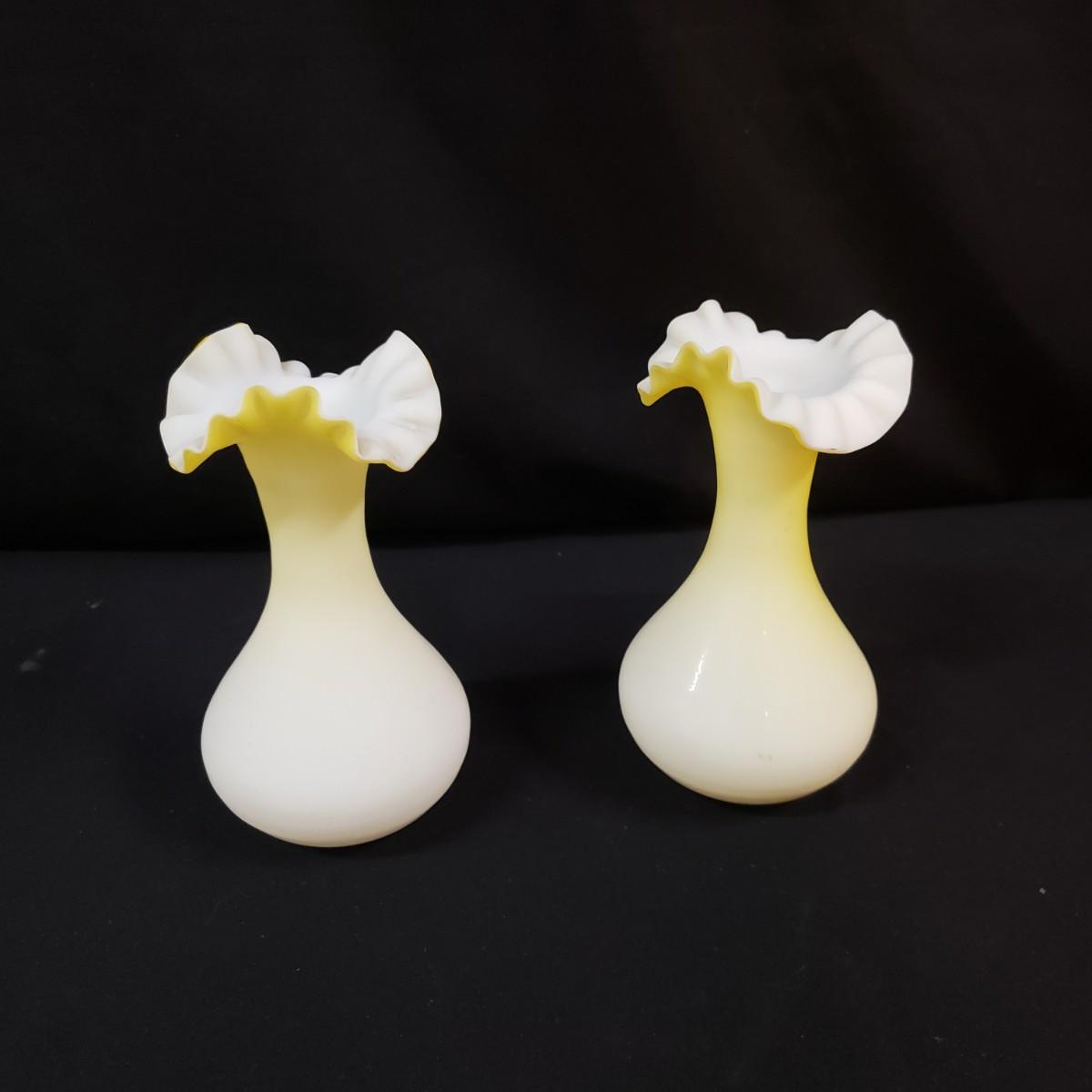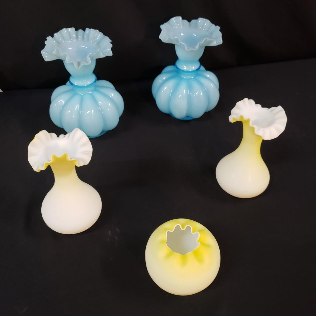 These 4 glass vases may be Fenton but we cannot make any guarantees; all have a ruffled edge around their rim. The 2 blue vases measure 6"x8", the 2 taller white and yellow vases measure 4"x7" and the small white and yellow rose bowl vase measures 4"x4". They all appear to be in good condition with no chips or coloring.