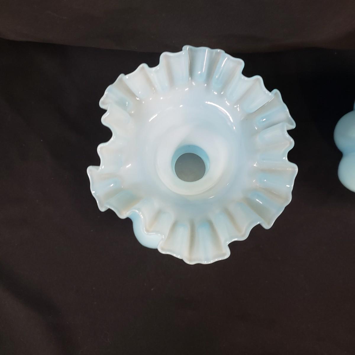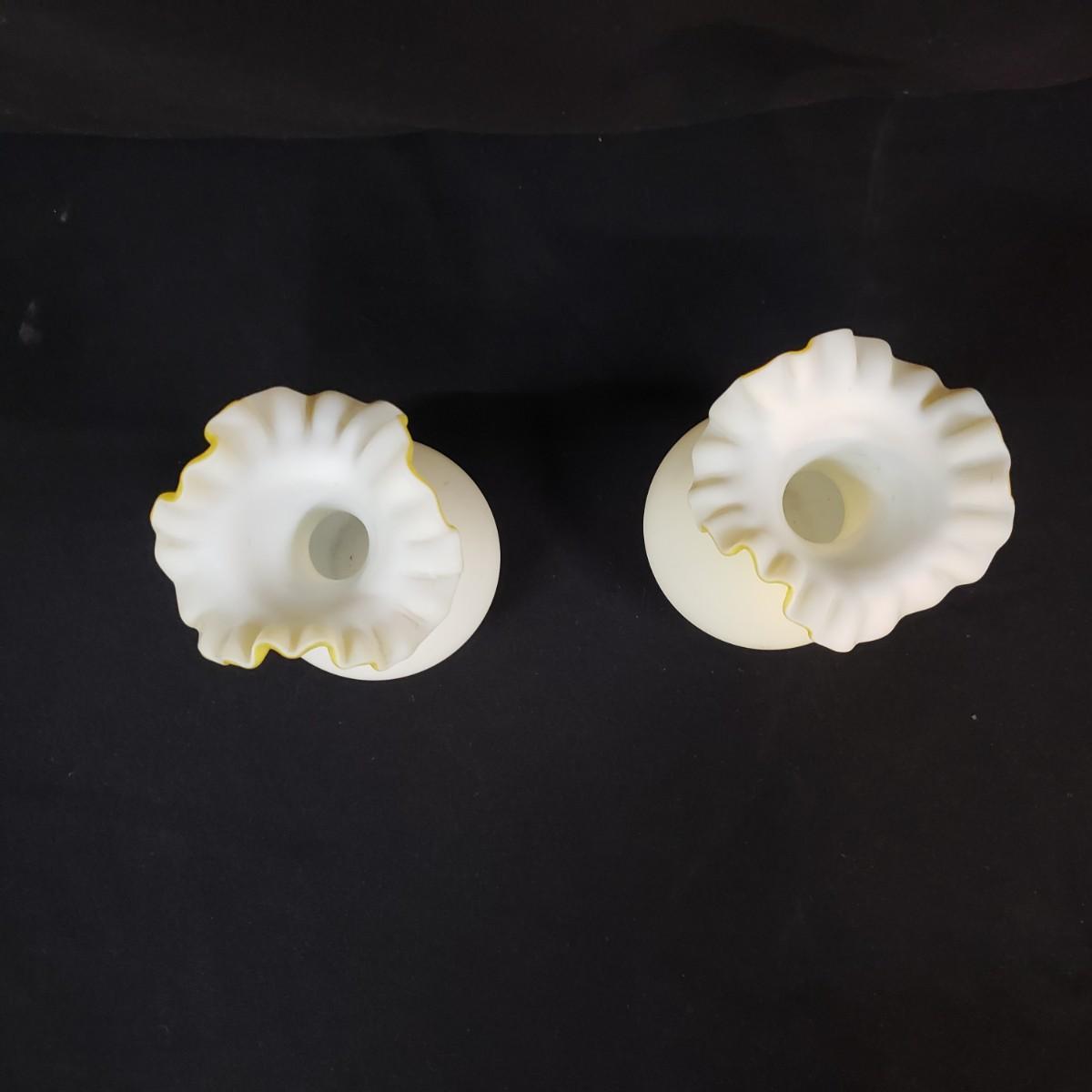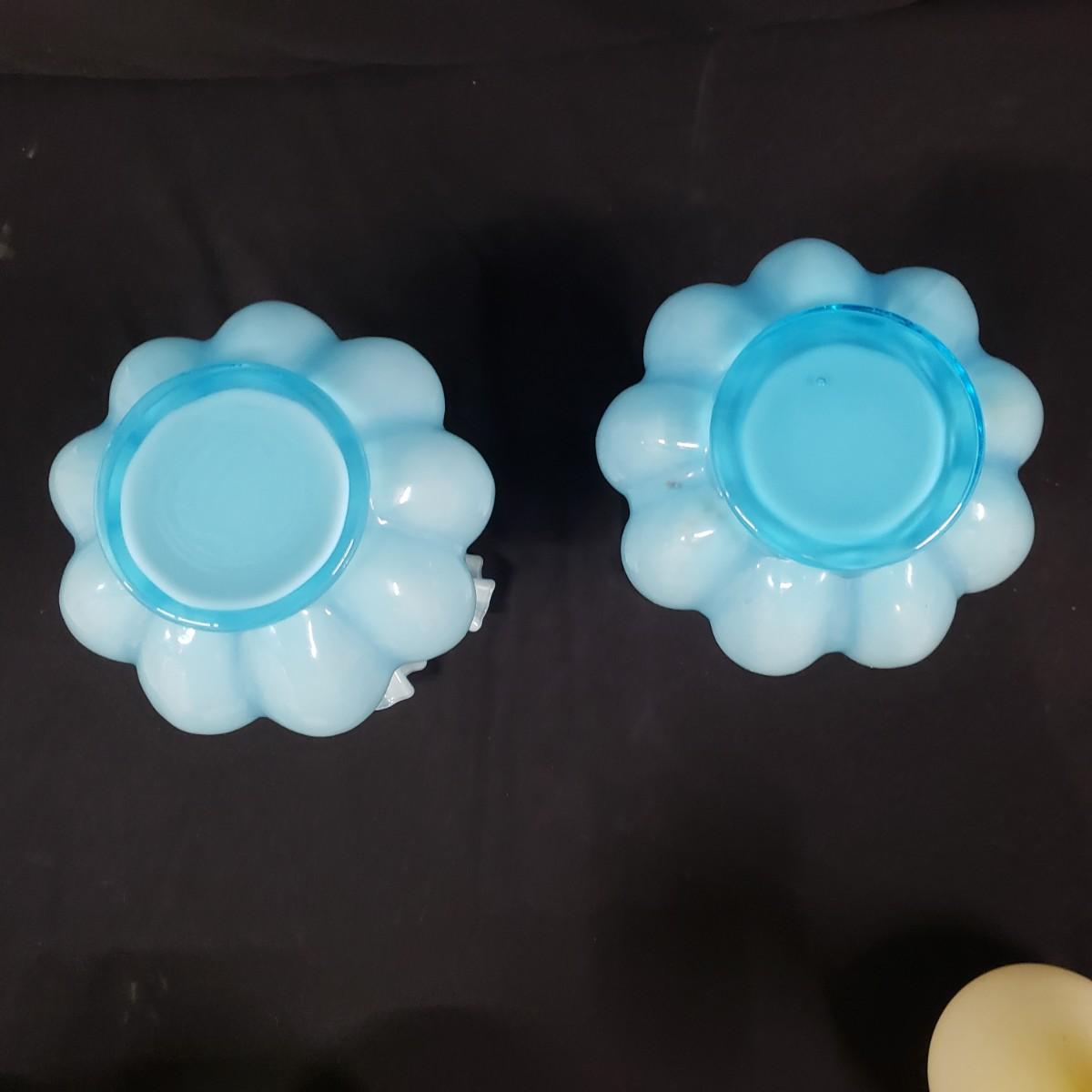 These 4 glass vases may be Fenton but we cannot make any guarantees; all have a ruffled edge around their rim. The 2 blue vases measure 6"x8", the 2 taller white and yellow vases measure 4"x7" and the small white and yellow rose bowl vase measures 4"x4". They all appear to be in good condition with no chips or coloring.