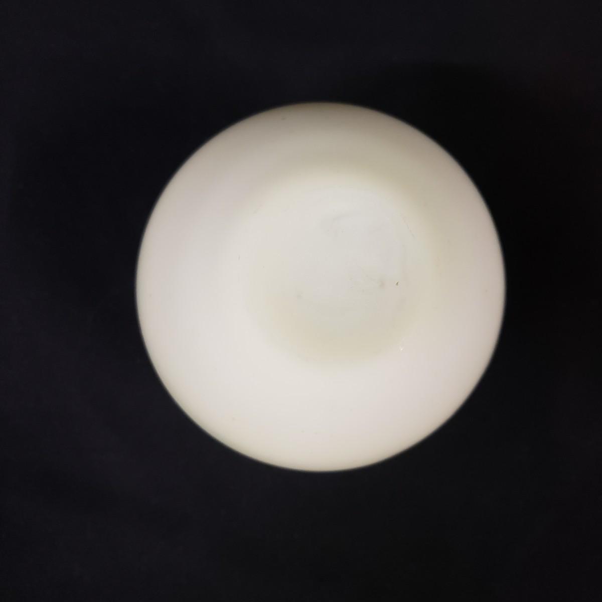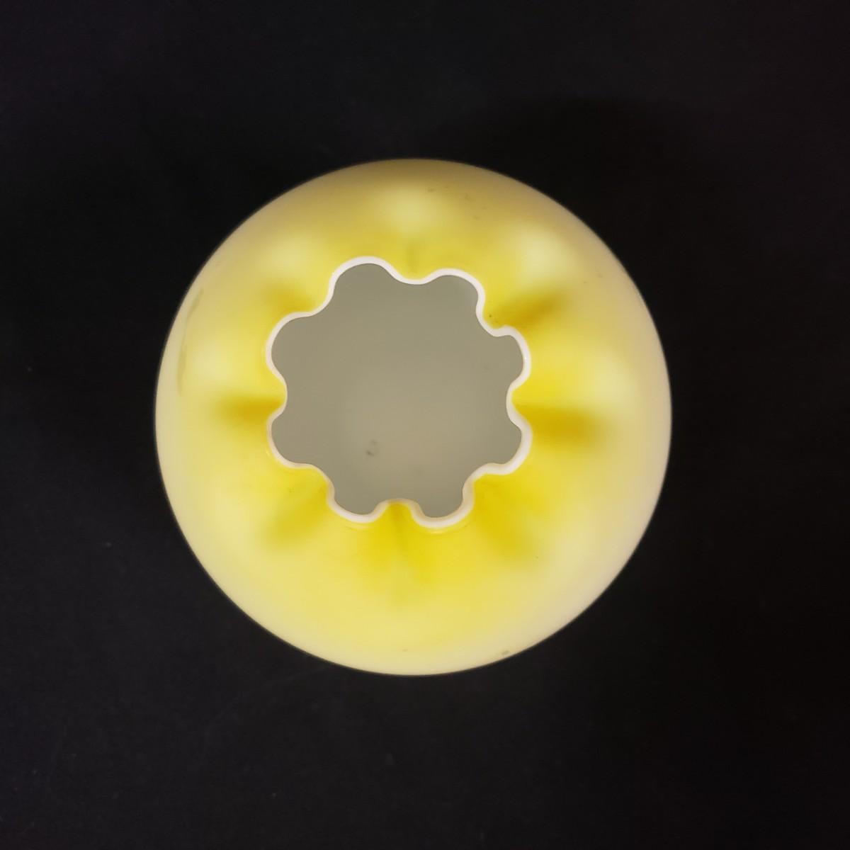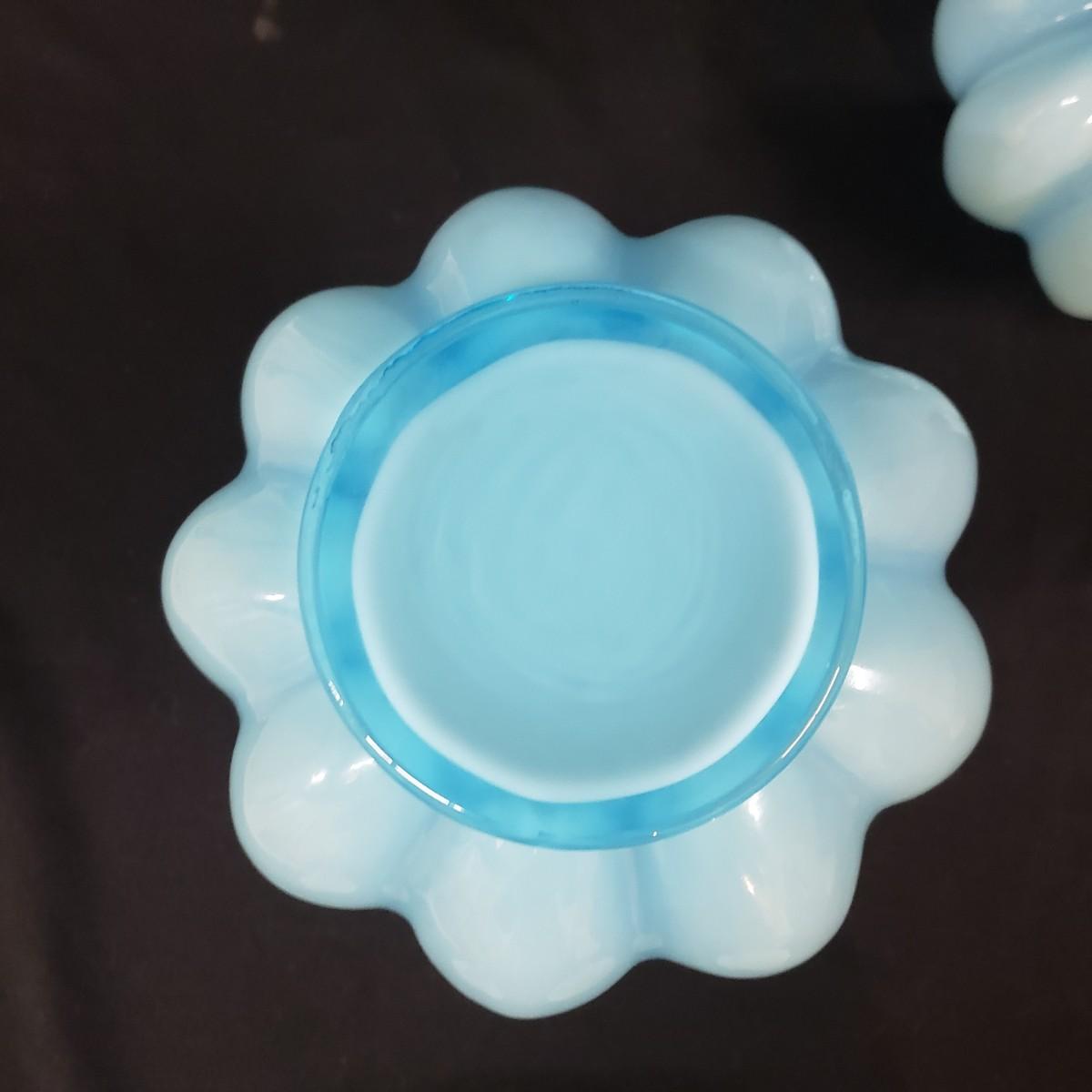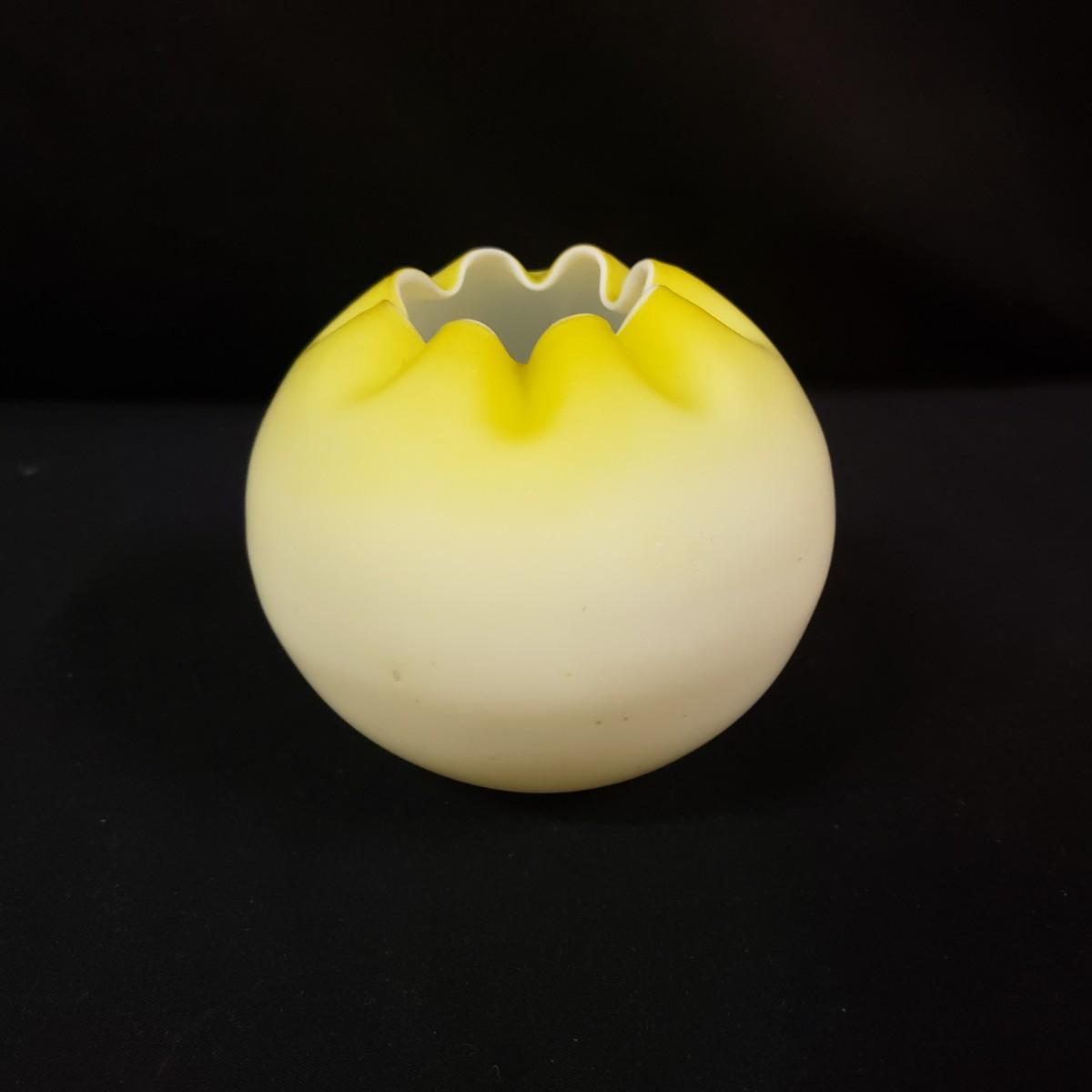 These 4 glass vases may be Fenton but we cannot make any guarantees; all have a ruffled edge around their rim. The 2 blue vases measure 6"x8", the 2 taller white and yellow vases measure 4"x7" and the small white and yellow rose bowl vase measures 4"x4". They all appear to be in good condition with no chips or coloring.