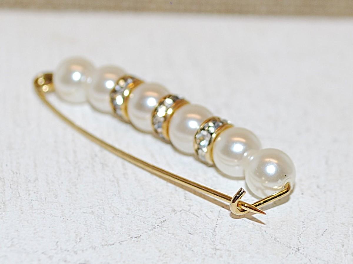 Delicate "Pearls & Diamonds" BROOCH (1¾") with 6 Faux Pearls and 3 Rows of 6 Clear Stones on Gold Tone Wire