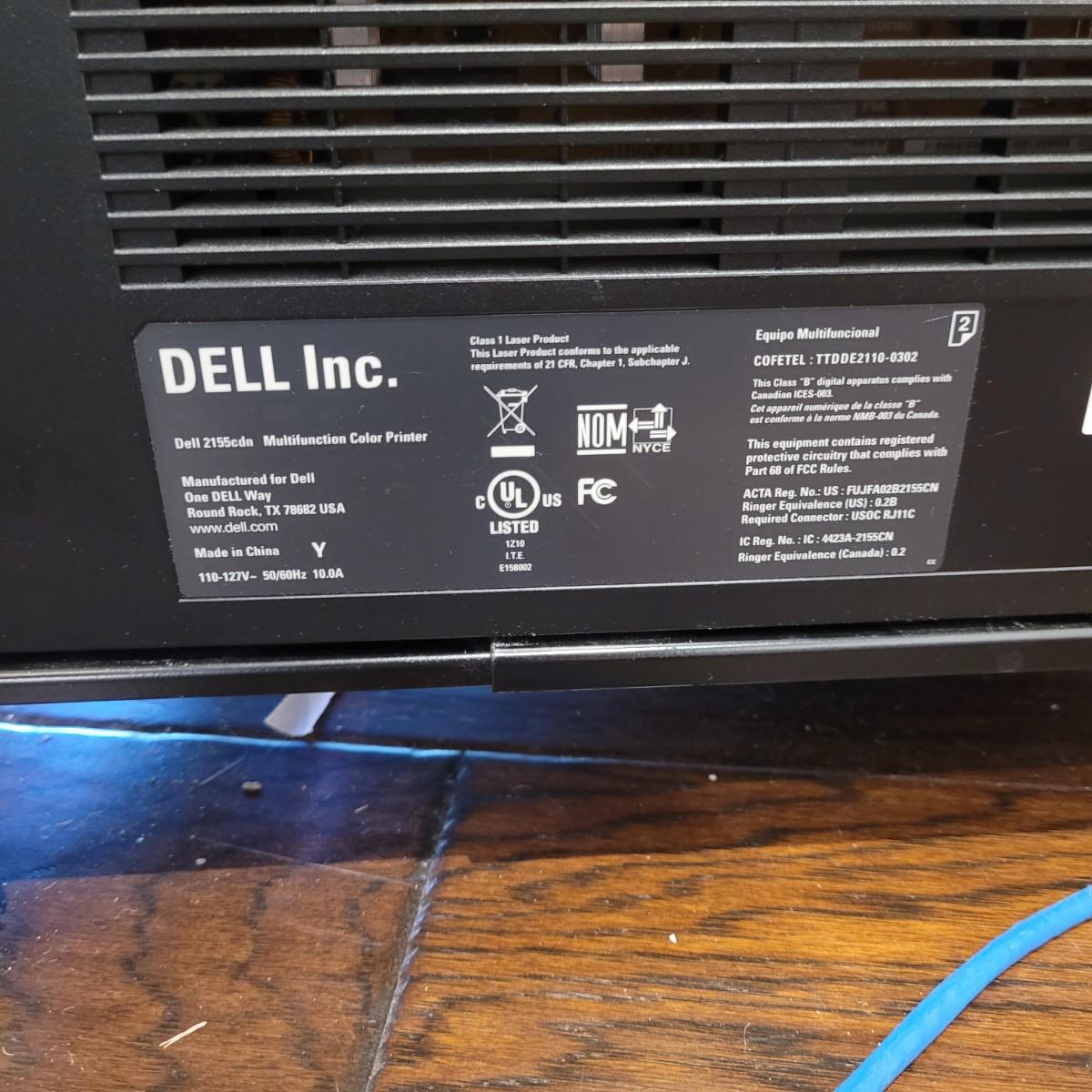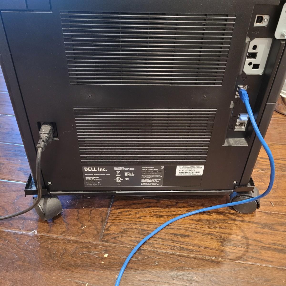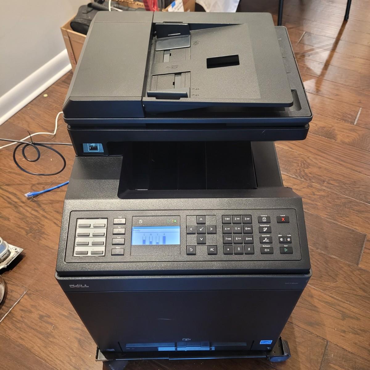 Dell multifunction color laser printer moves with ease on casters. Powers on when plugged in. Measures approximately 16.5" x 20.5" x 26". Local pick up only.