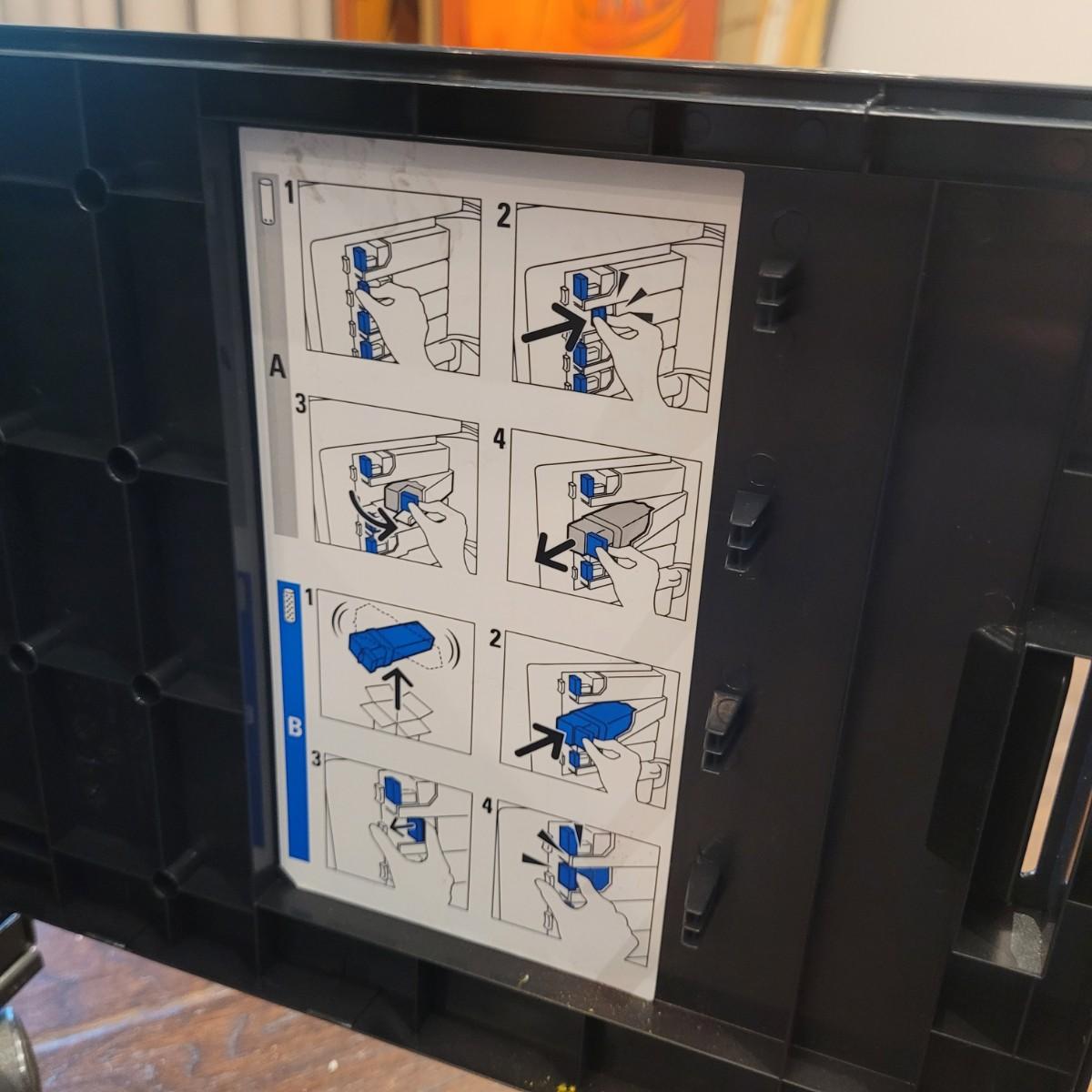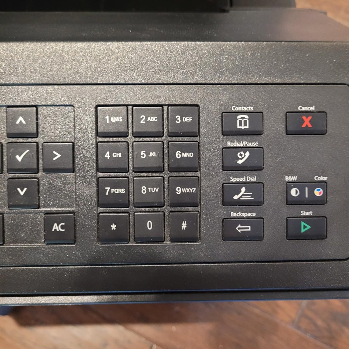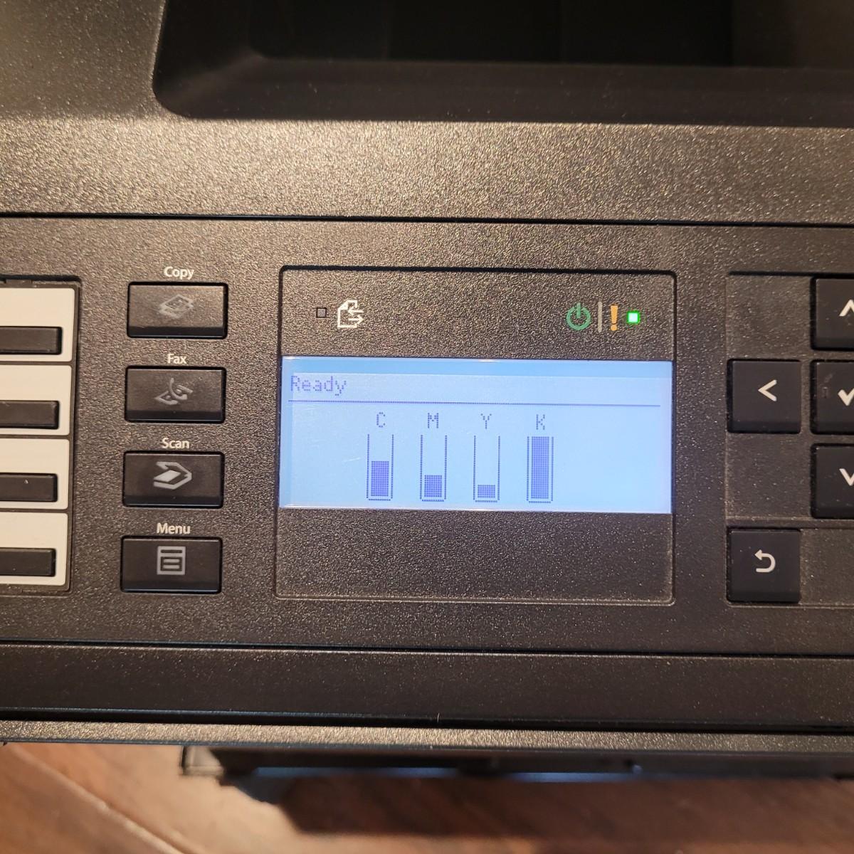 Dell multifunction color laser printer moves with ease on casters. Powers on when plugged in. Measures approximately 16.5" x 20.5" x 26". Local pick up only.