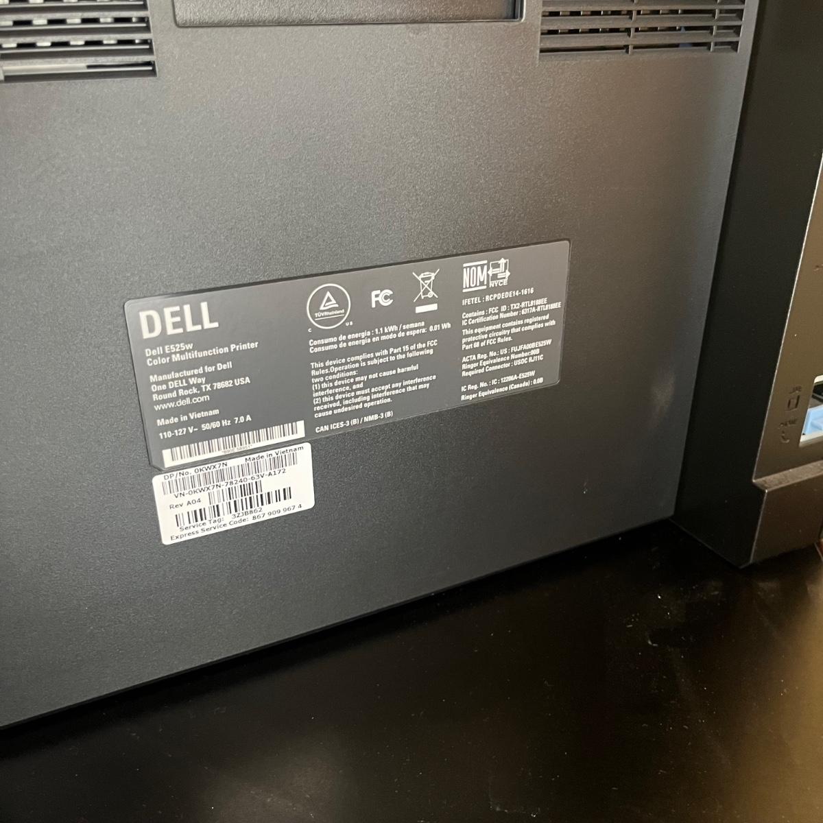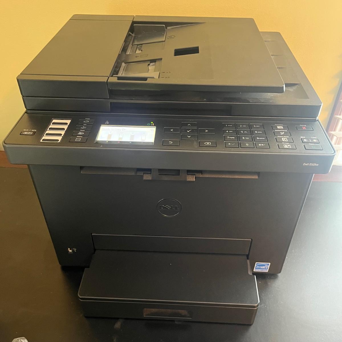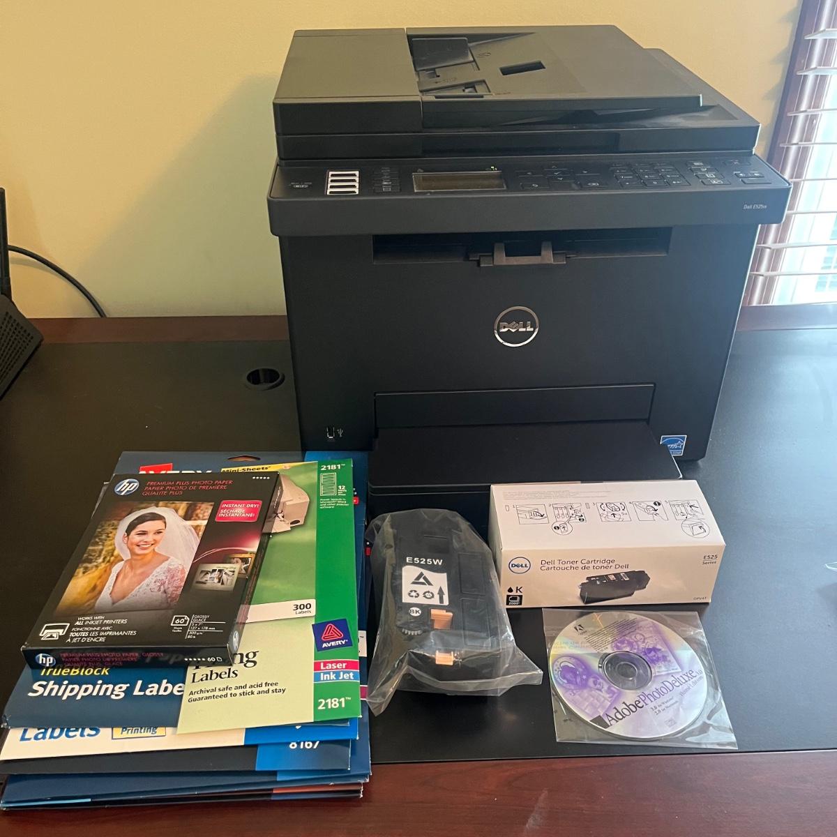 Lot includes a Dell all in one color laser printer with toner cartridges and specialty paper. Printer powered on when plugged in. Printer measures 16” x 17” x 15”H.