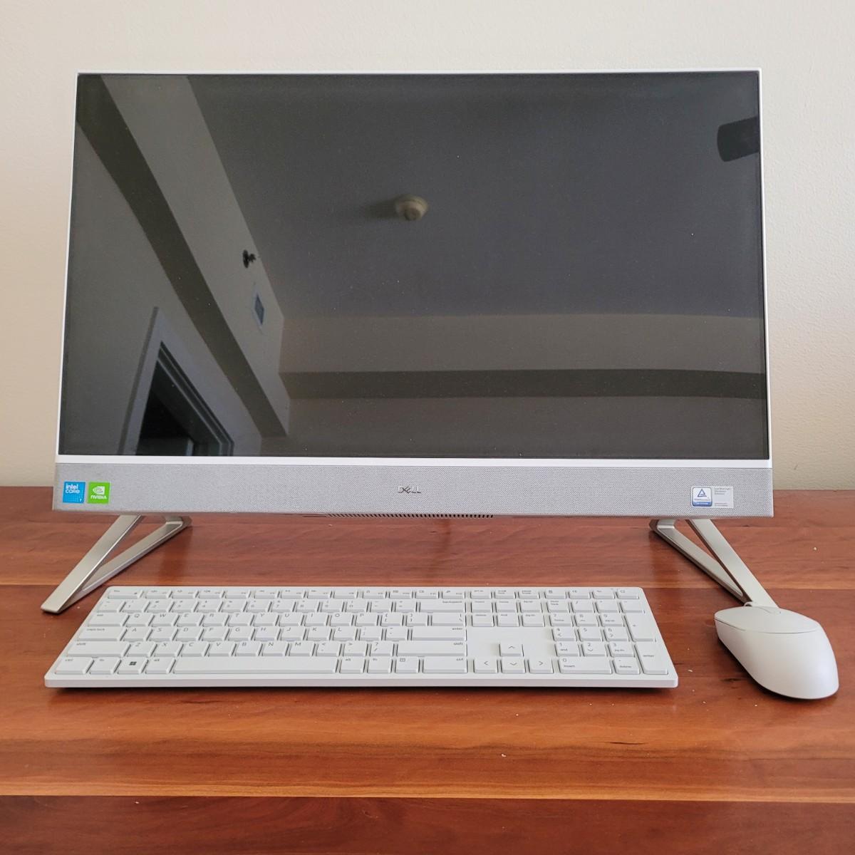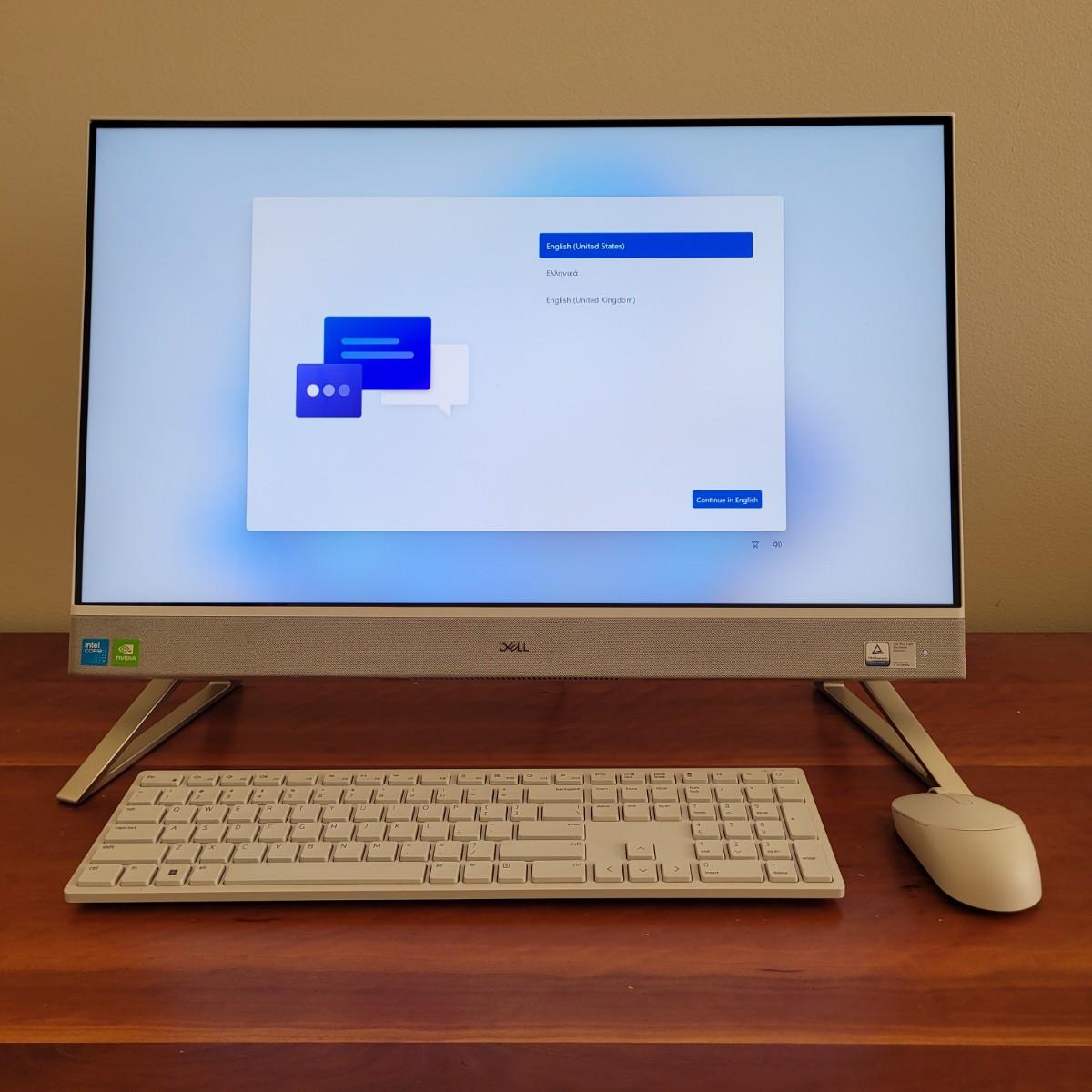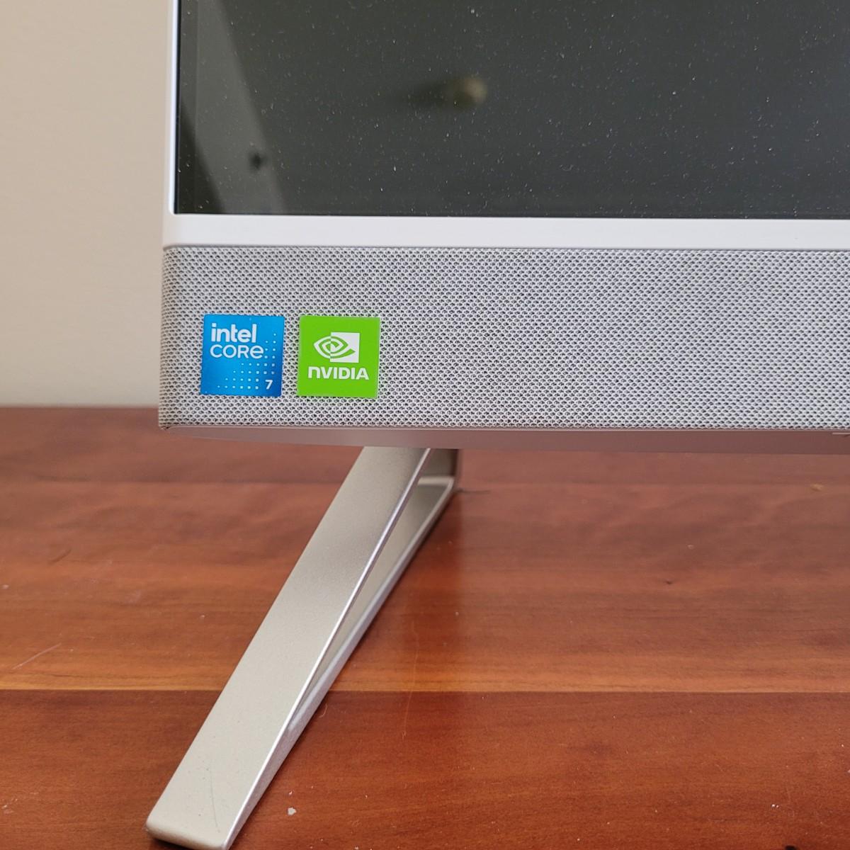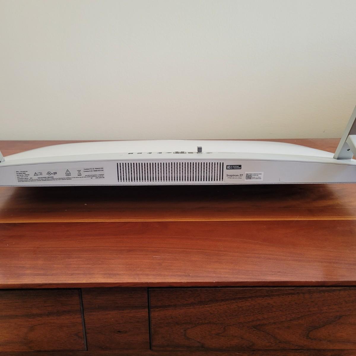 This lot includes a Dell Inspiron 7730 All-In-One desktop PC with a wireless keyboard and mouse. This PC runs on Windows 11 and features an Intel core 7 processor and dedicated NVIDIA graphics card. The screen is a 27" touchscreen and has dual Dolby 5w speakers. The device's hard drive is wiped and the computer powered on when plugged in. Power cord, wireless keyboard, and mouse are included. The PC measures 24" x 9"(base) x 18"H.