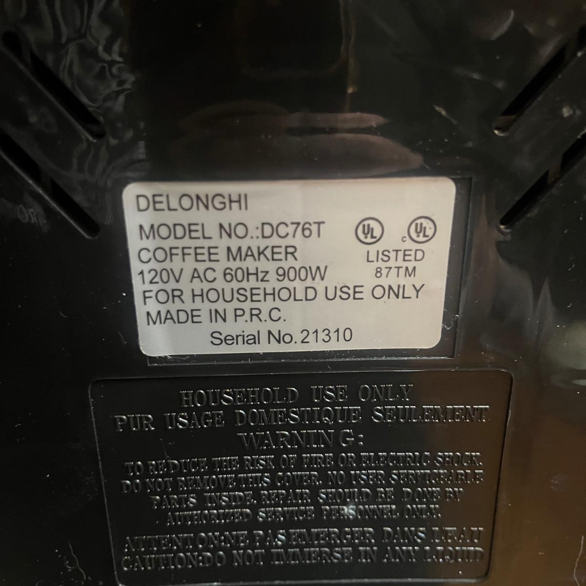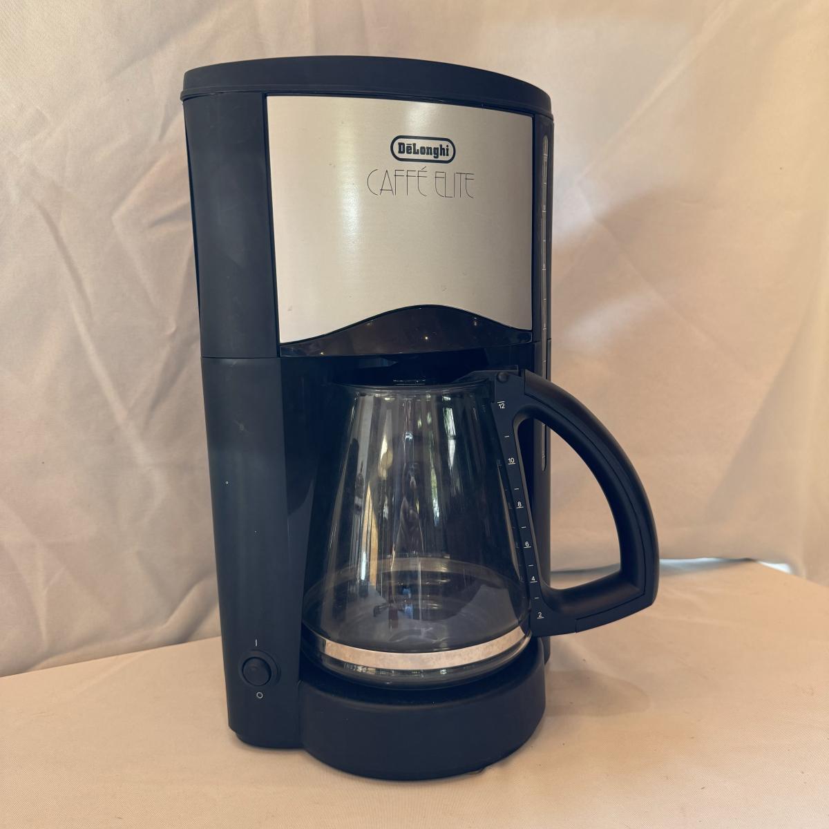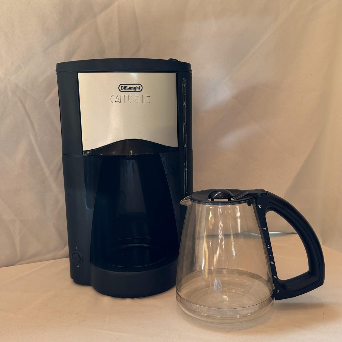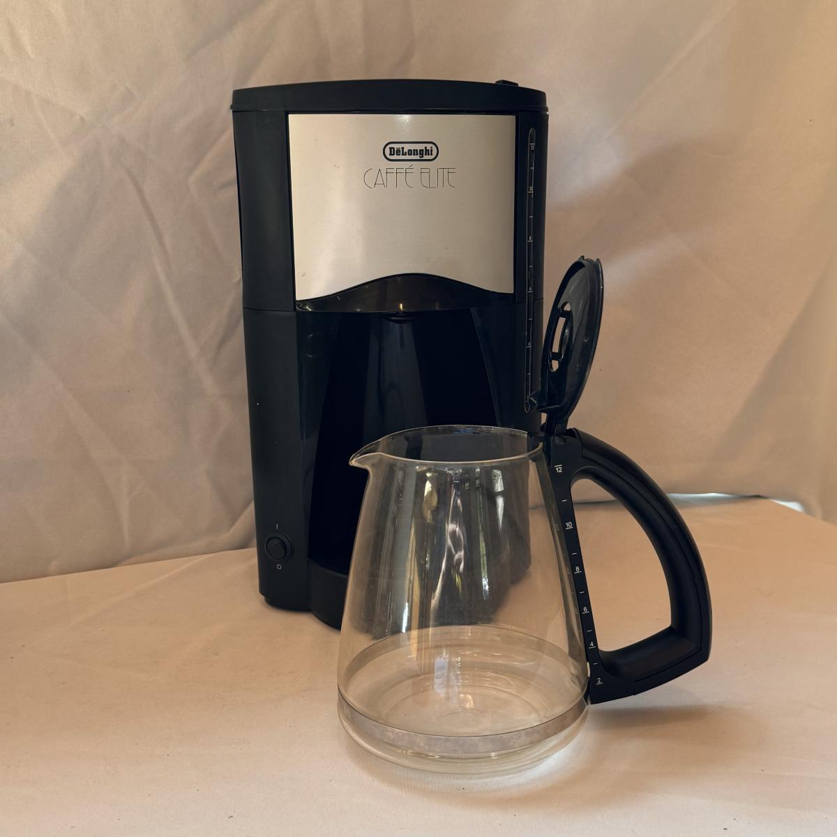This lot includes one DeLonghi Caffe Elite coffee maker, one Mr. Coffee thermal carafe, and one stainless and glass French press. The DeLonghi coffee maker powered on when plugged in. The coffee maker measures 9” x 7.5” x 15”H. Shipping available.