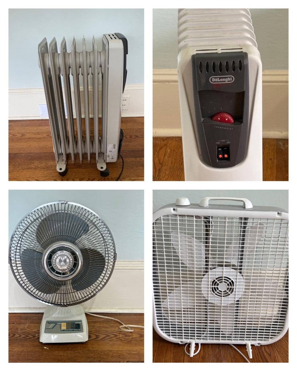 This lot includes a DeLonghi Radiator heater, two Lasko box fans, and a Lasko Advantage oscillating desk fan. The approximate measurements of the radiator heater are 12" x 6" x 25"H. The bigger Lasko fan has approximate measurements of 20" x 5" x 22"H.