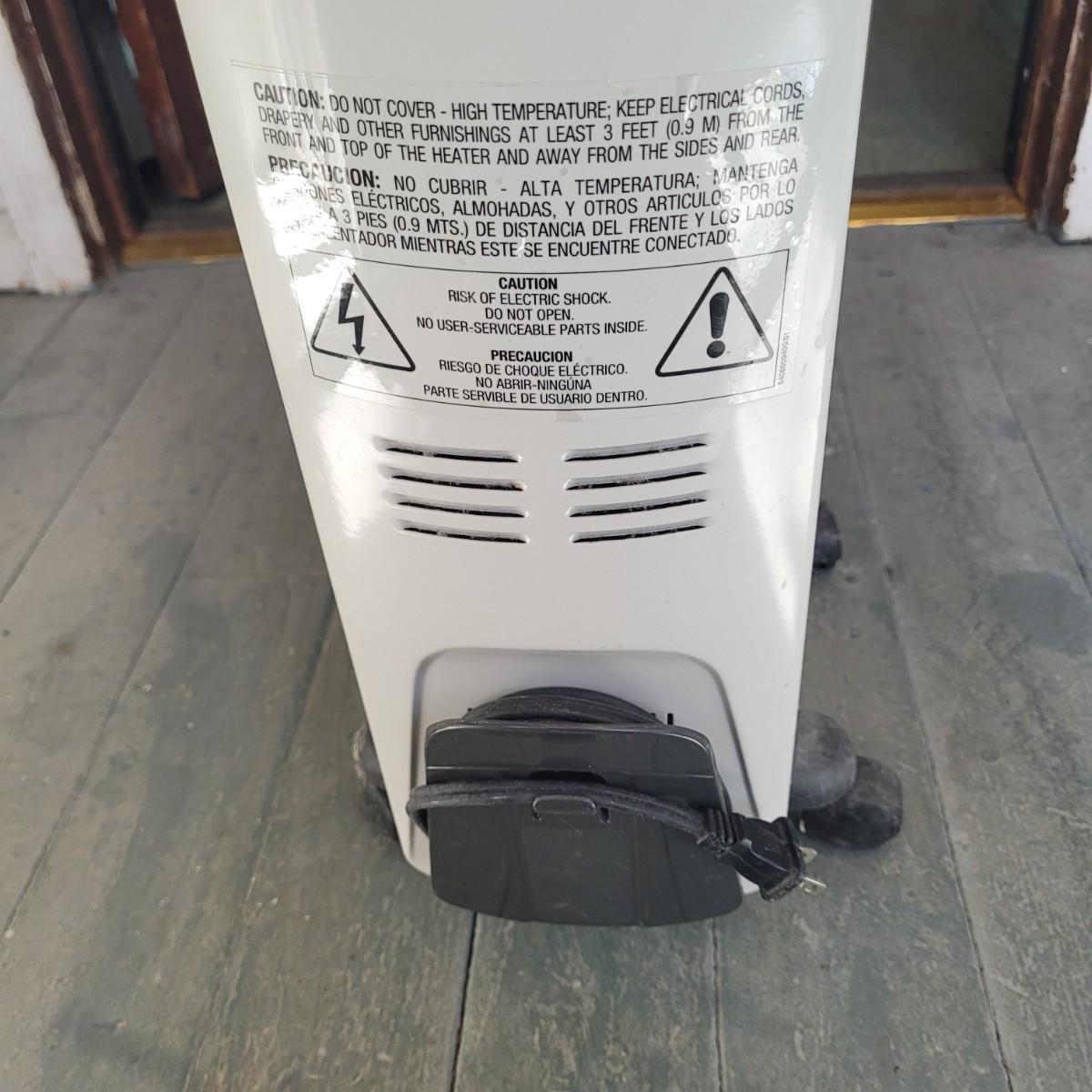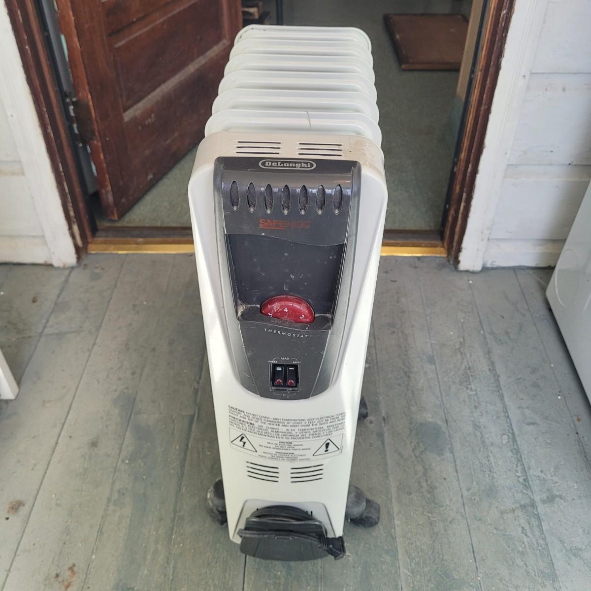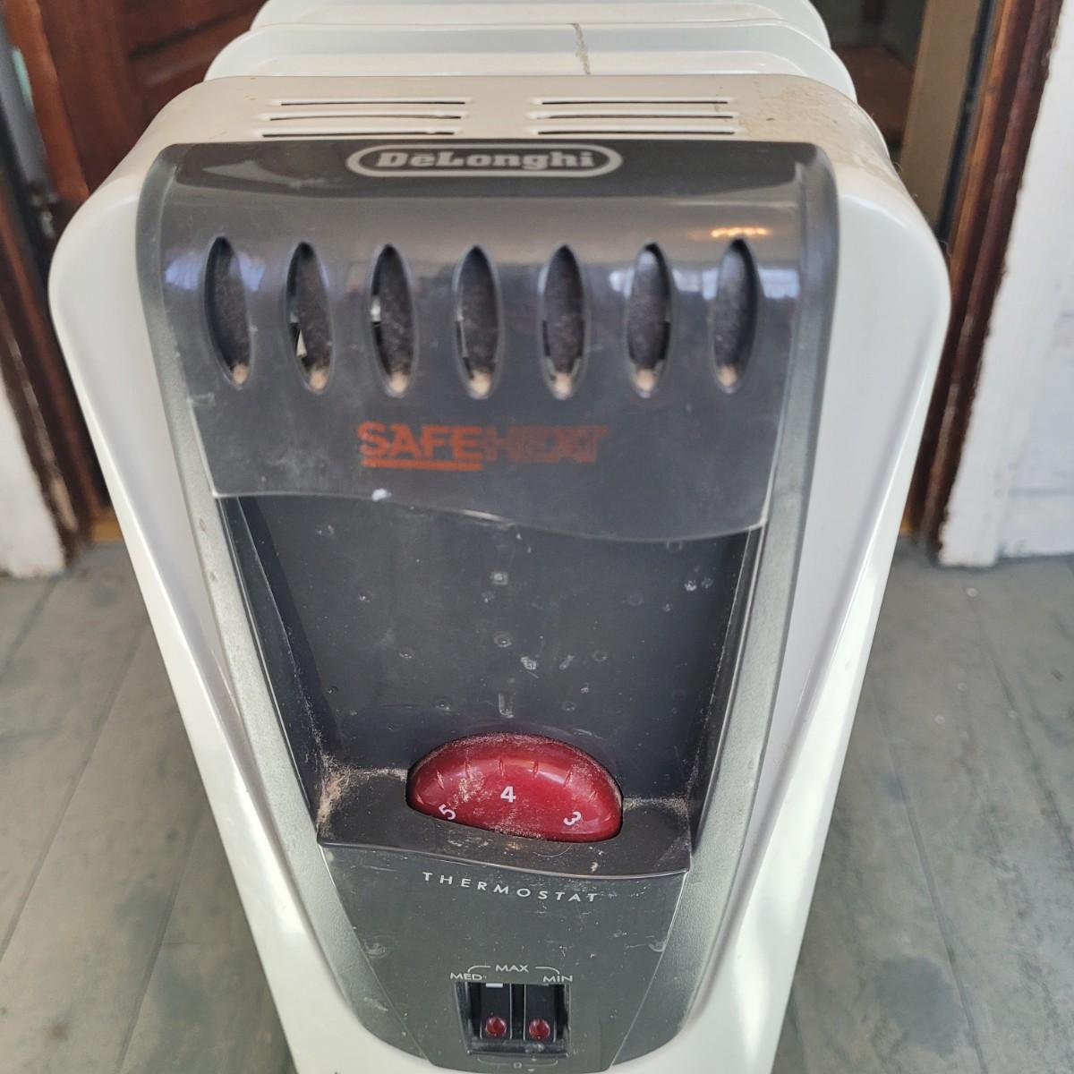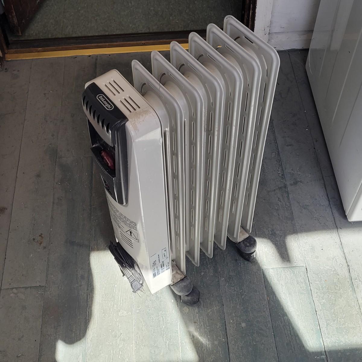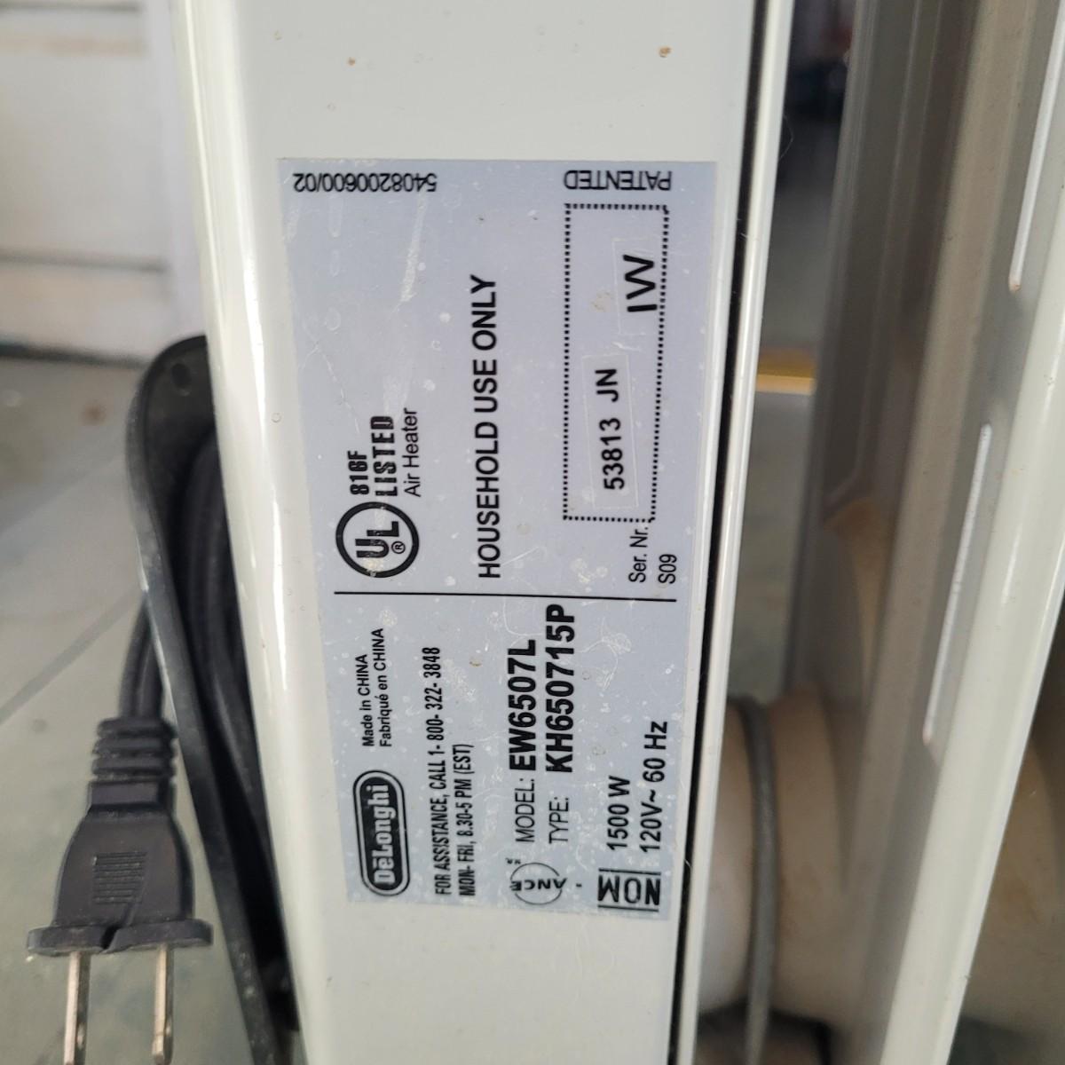 Corded DeLonghi brand convection oil filled radiator heater. Model EW6507L. Powers on when plugged in. Heater measures approximately 7" x 15" x 25"H. Has four fold in wheels for easy moving.