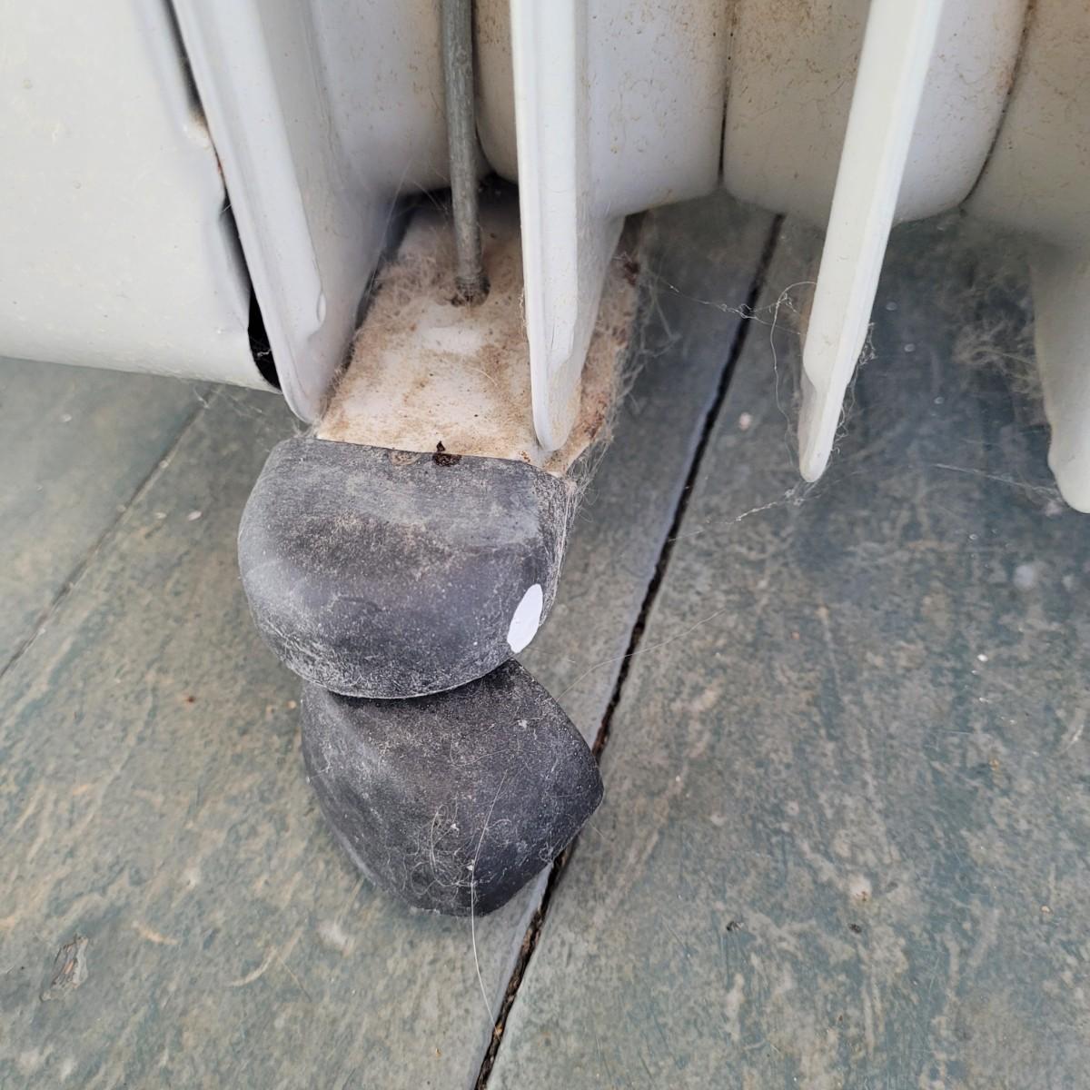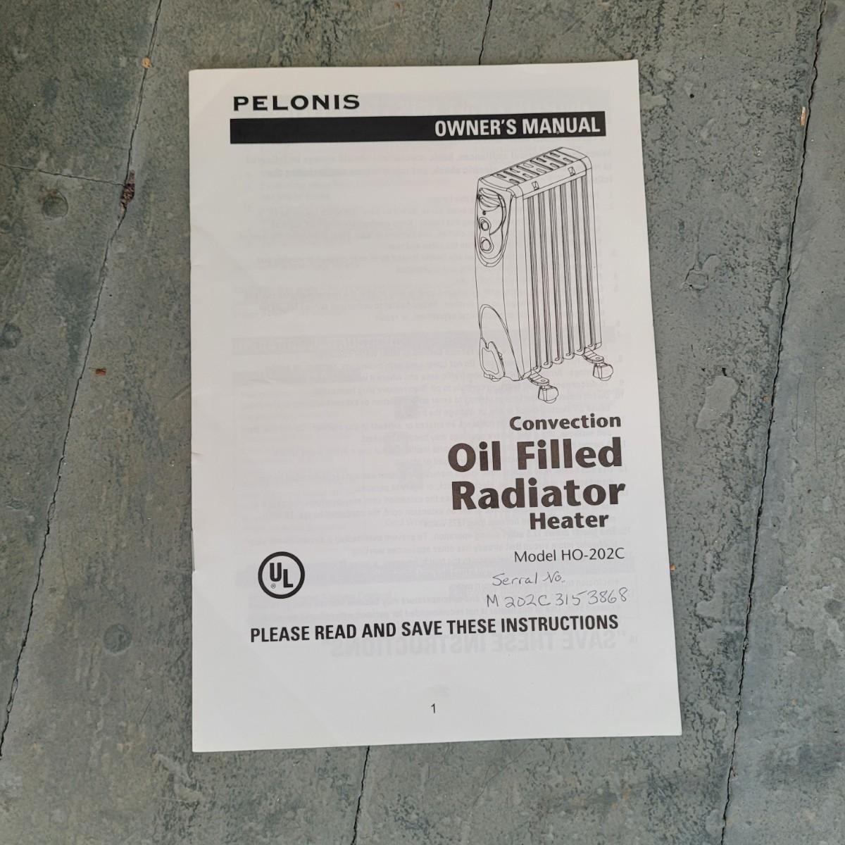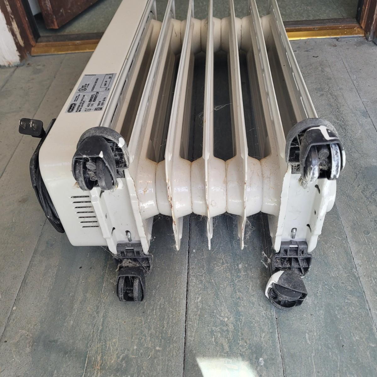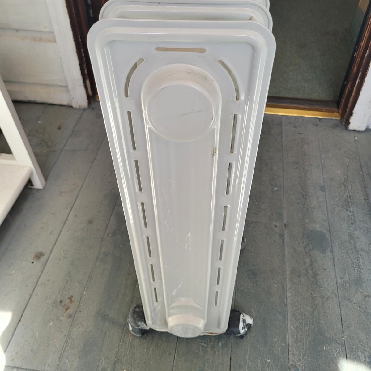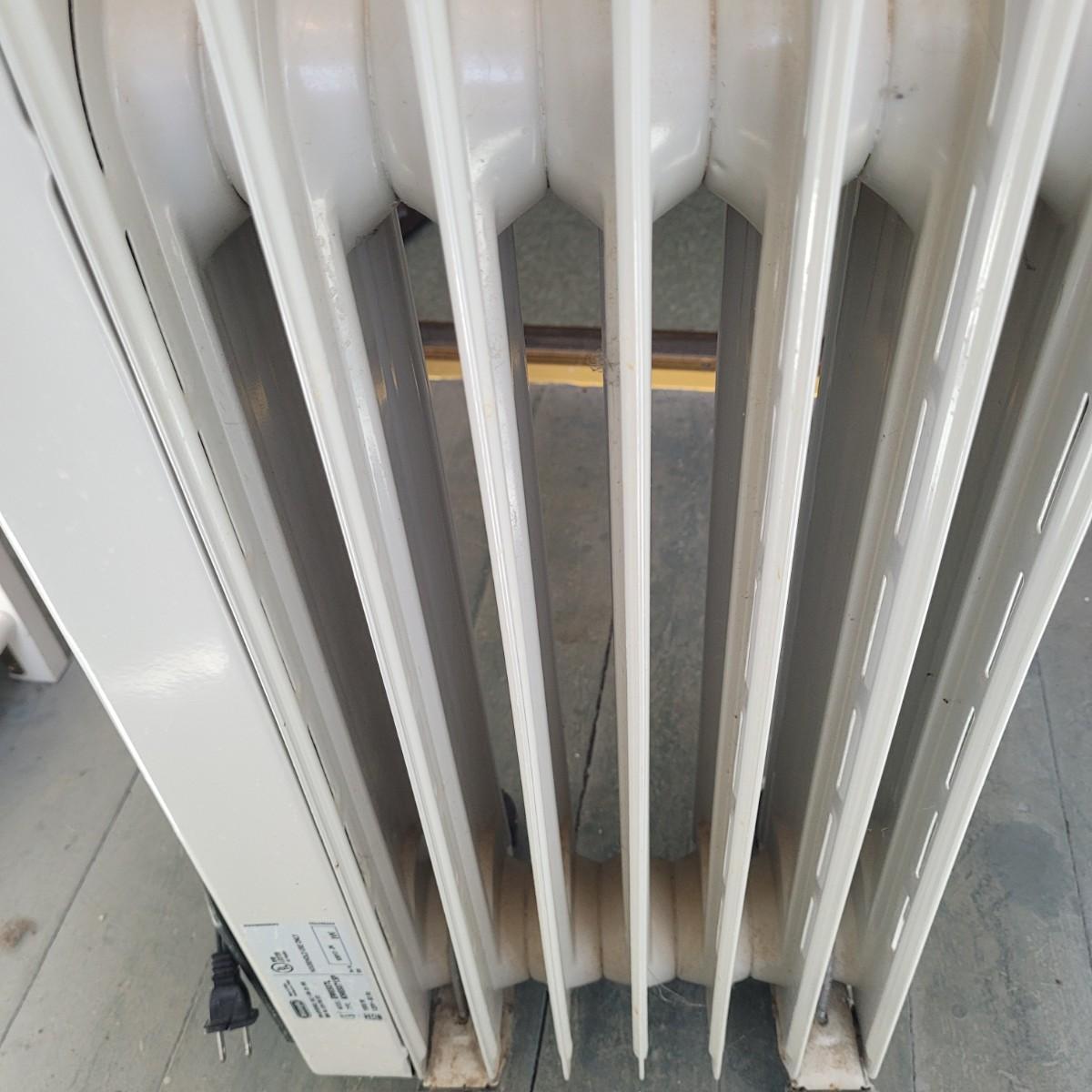 Corded DeLonghi brand convection oil filled radiator heater. Model EW6507L. Powers on when plugged in. Heater measures approximately 7" x 15" x 25"H. Has four fold in wheels for easy moving.