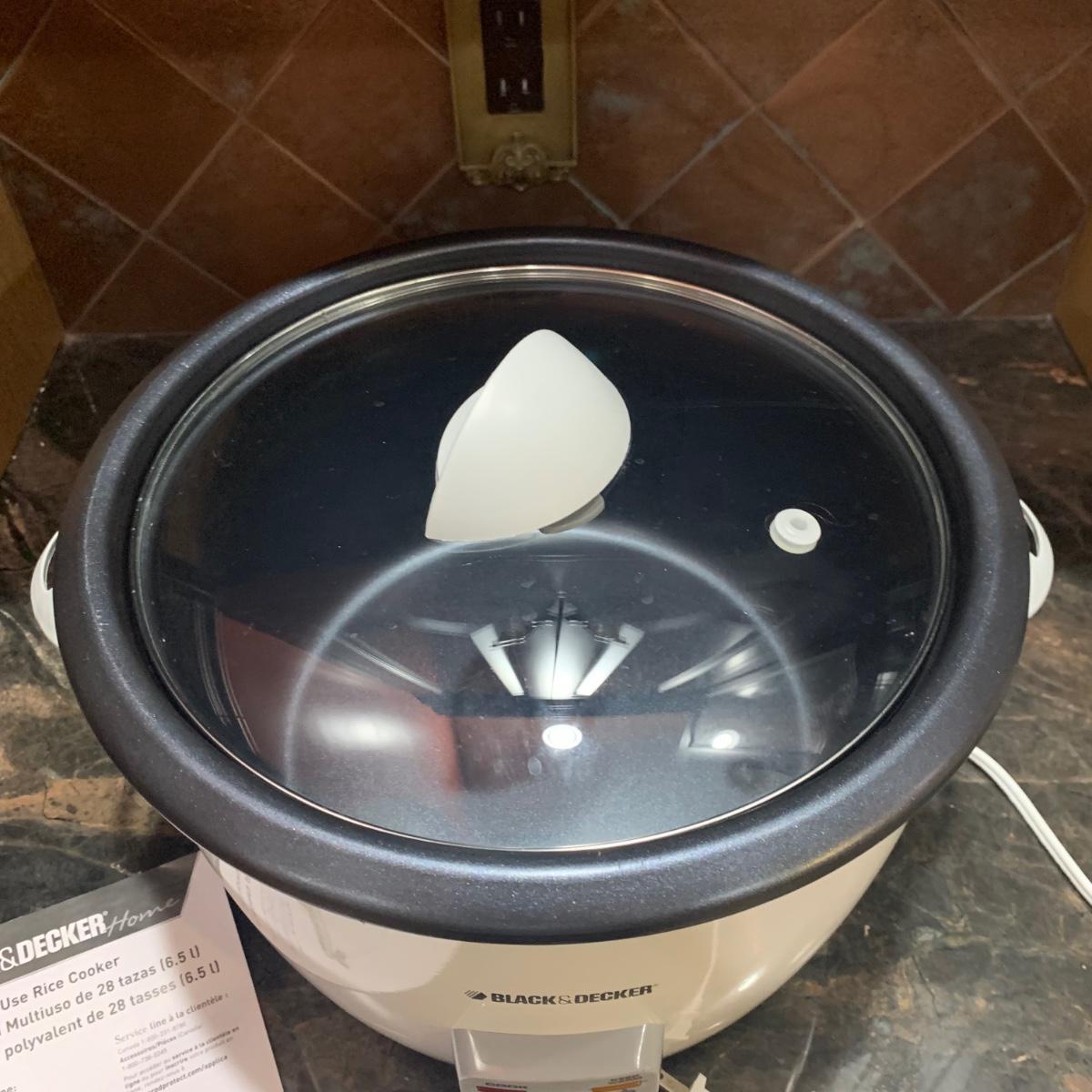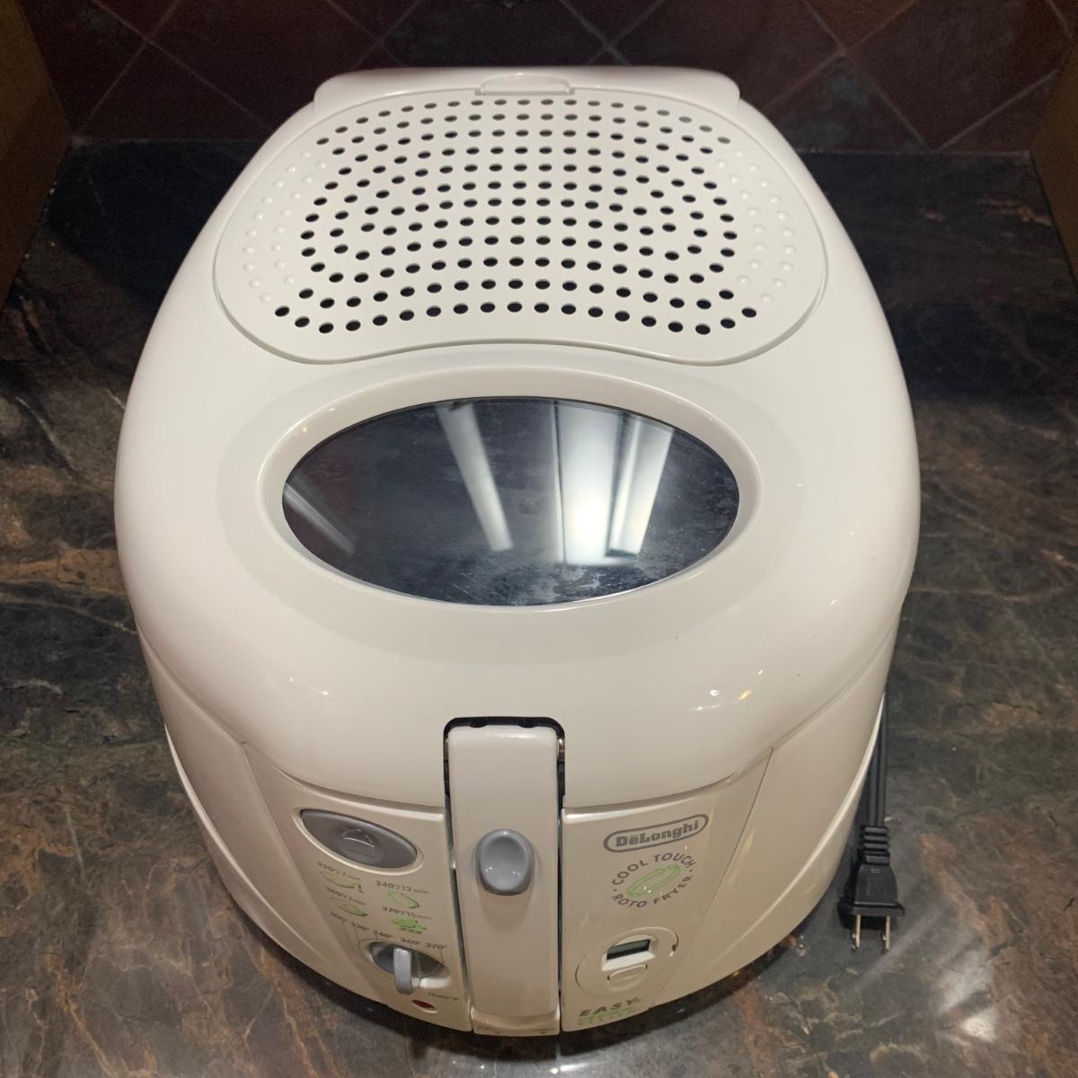 DeLonghi Cool Touch Roto Fryer and Black & Decker 28-Cup Multi-Use Rice Cooker. Both appliances powered on when plugged in. They appear to be very gently used or possibly never used.