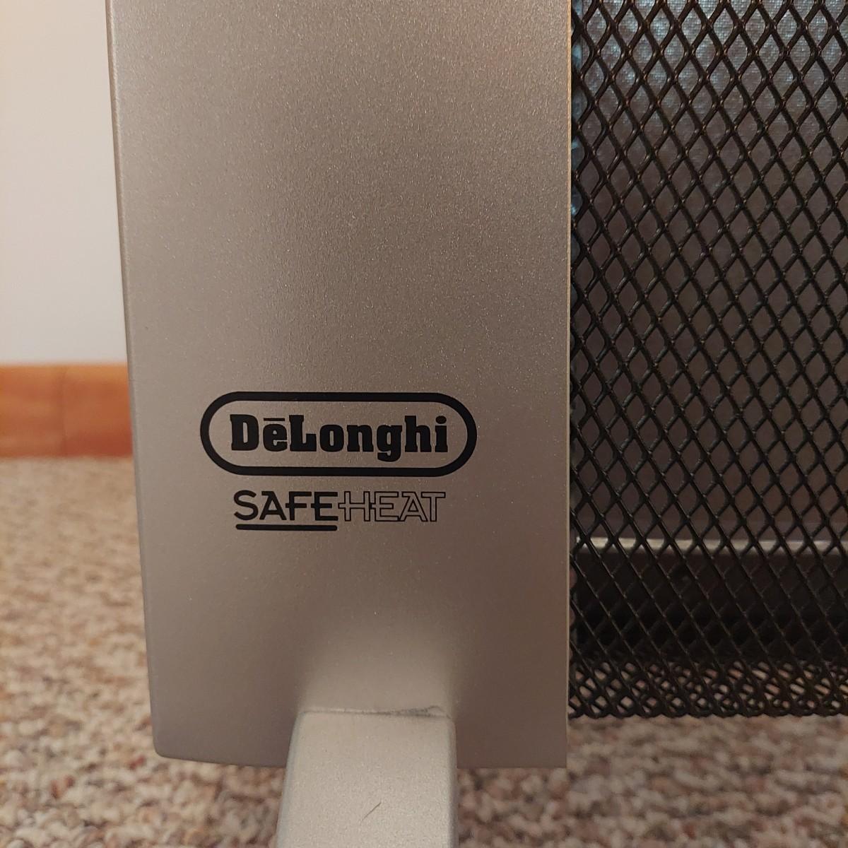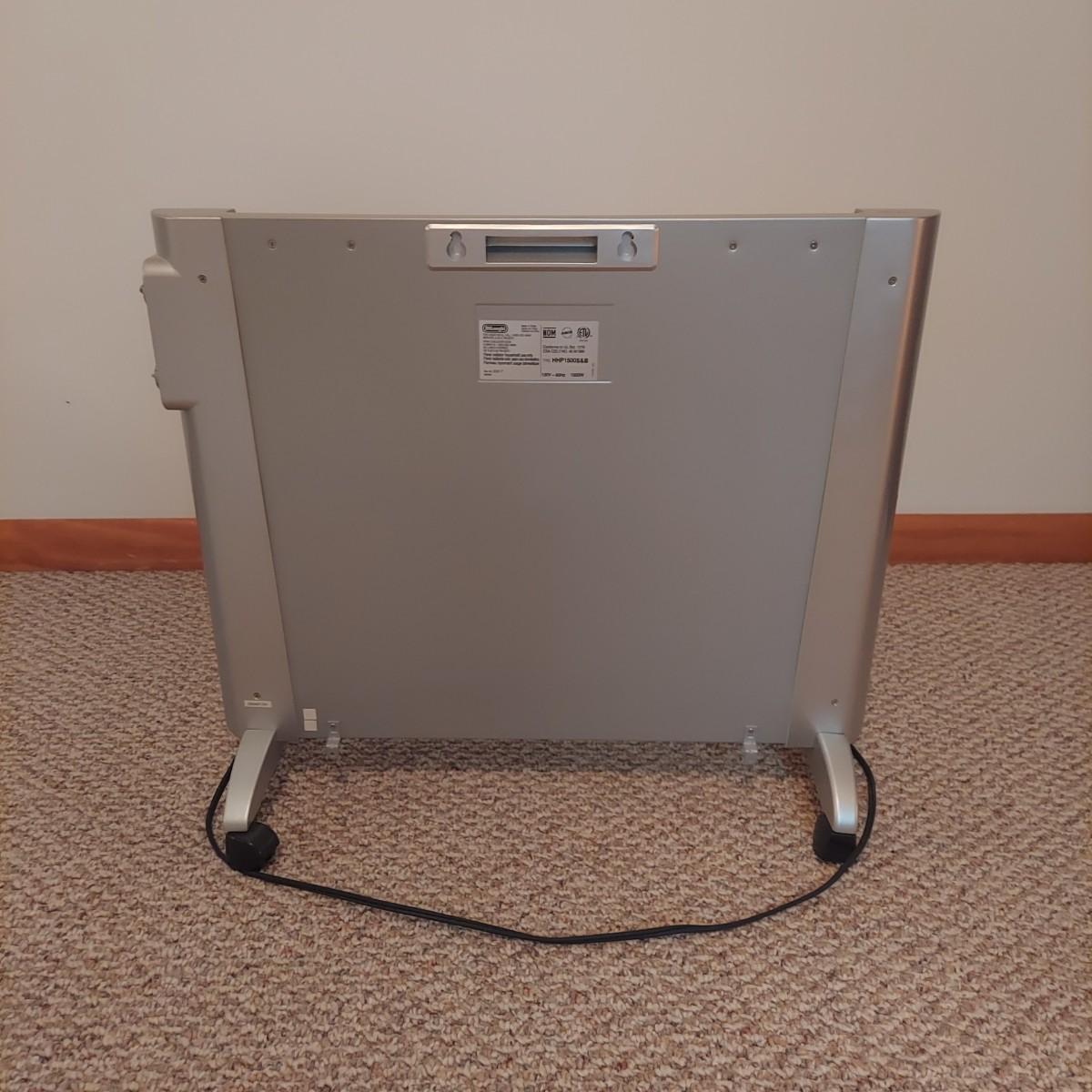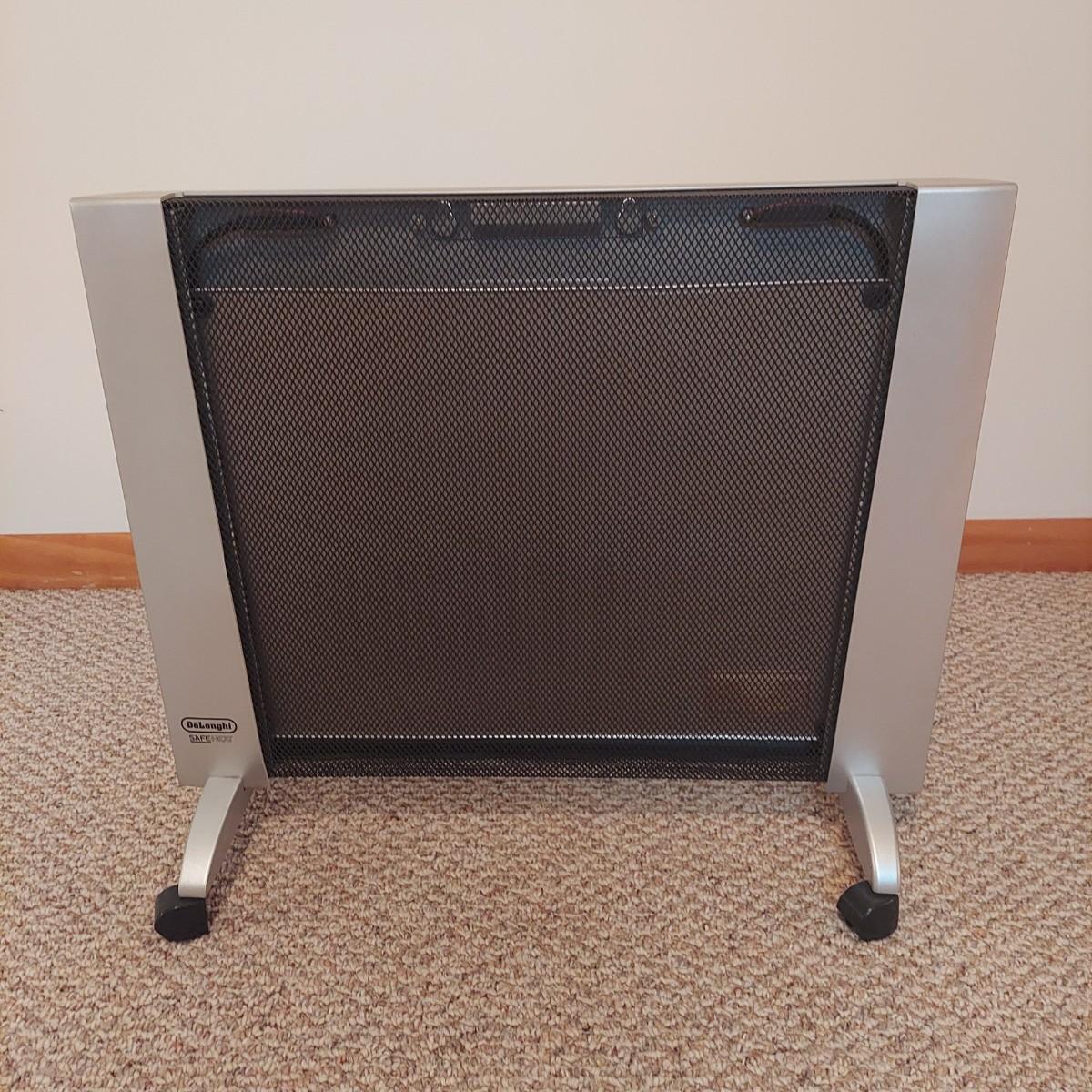 DeLonghi space heater and Cosco folding step stool. Delonghi HHP1500 S&B space heater has Flat Panel Micathermic Heating Element Provides Instant Heat while being totally silent in operation. Stylish flat panel design and lightweight construction make the heater easy to carry from room to room. The space heater plugged in and powered on. It measures approximately 26 x 11 x 23"H. Traditional Cosco folding step stool is also included. There is some wear on stool. Please see photos. It measures approximately 17.5 x 22 x 35"H. Local Pickup Only.