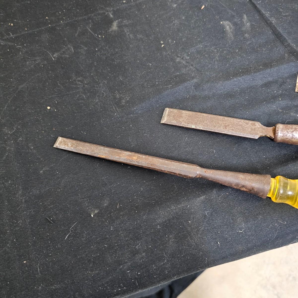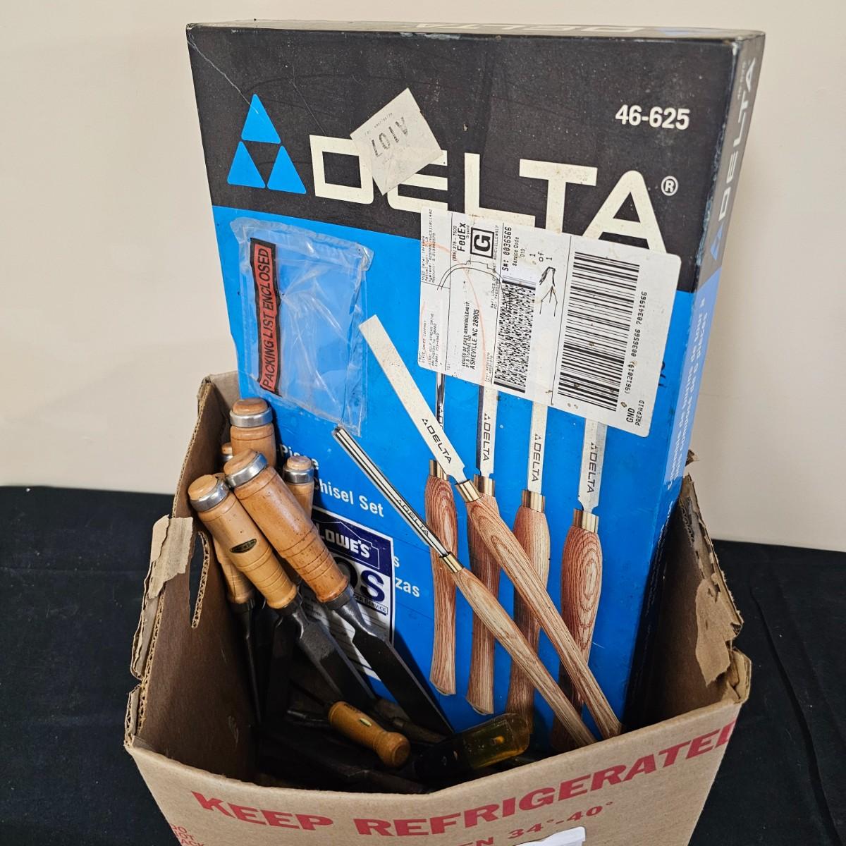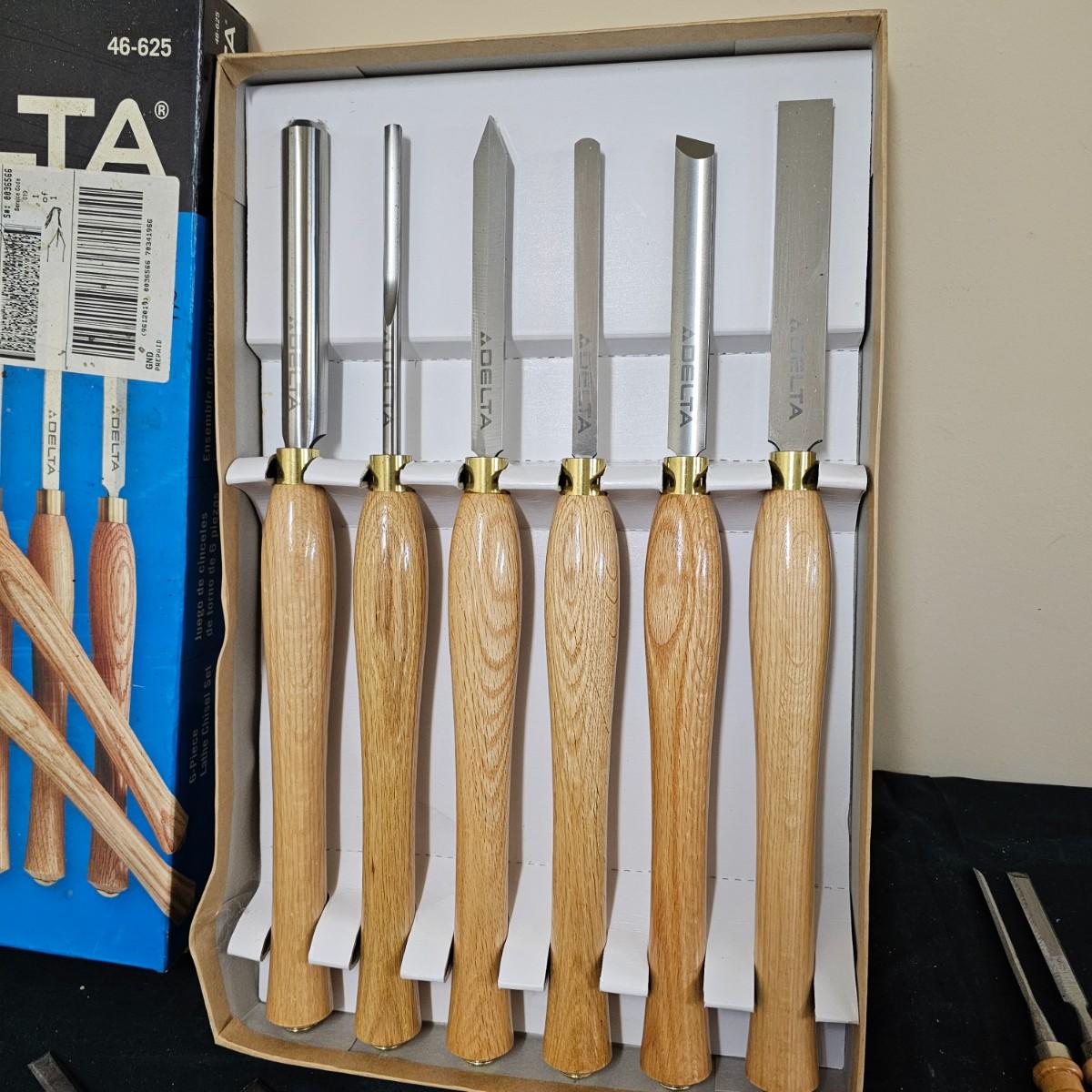 Six piece set of new Delta lathe chisels in original box. Chisels average 18" to 19" in length. Also another smaller set of lathe chisels plus multiple other general chisels and handles. See photos for details. Shipping available.