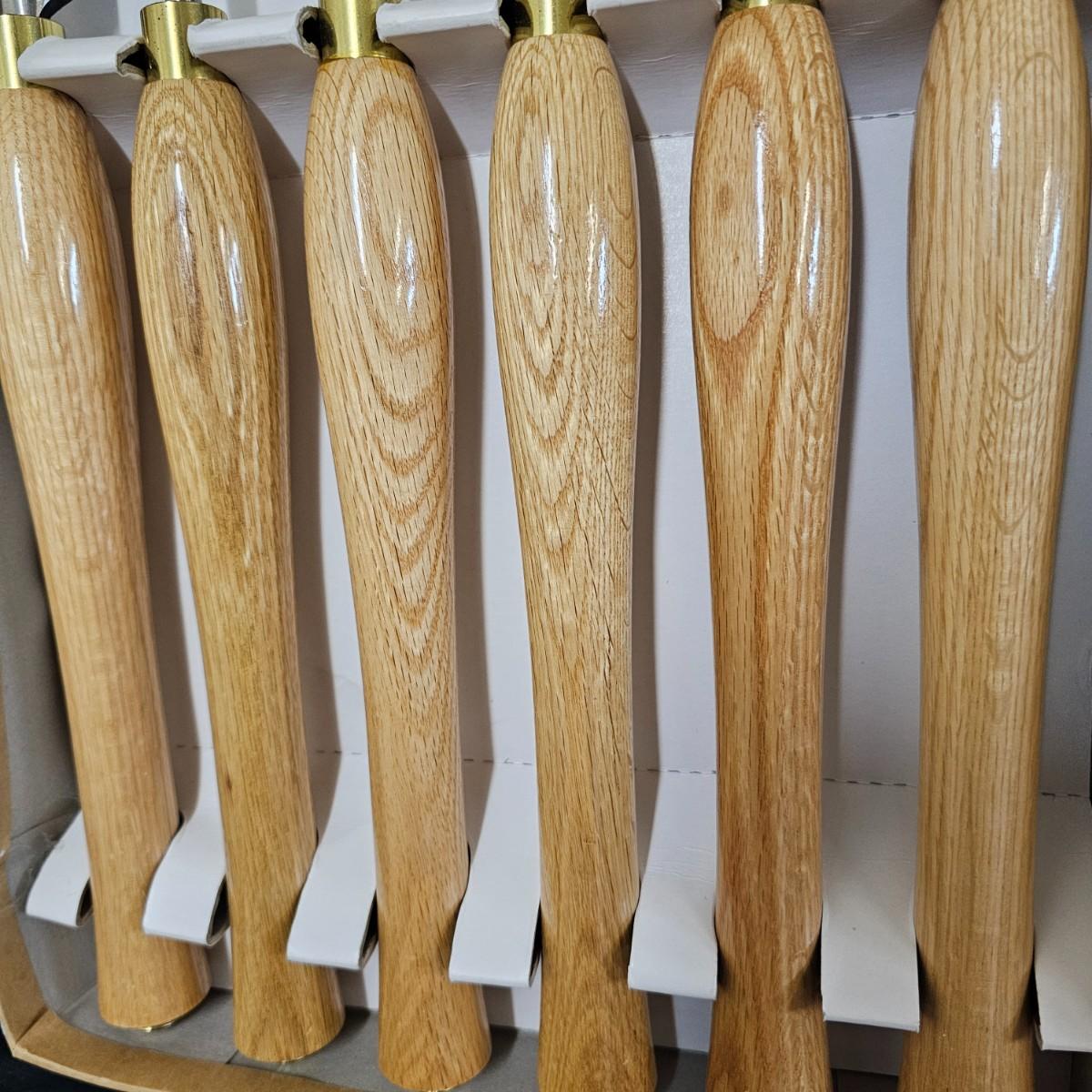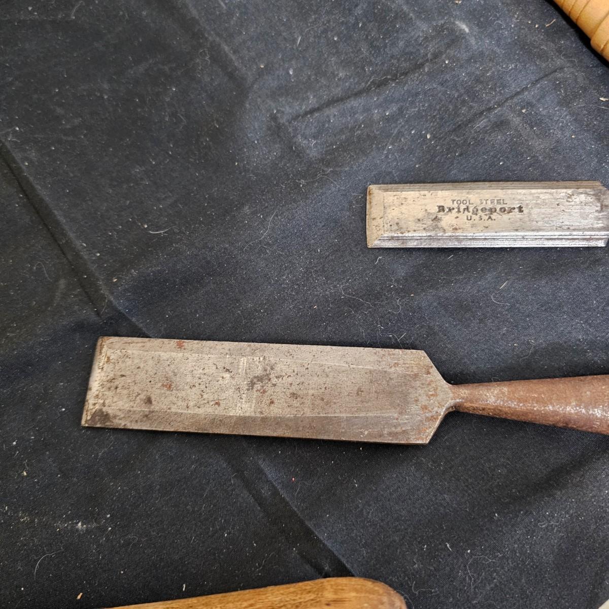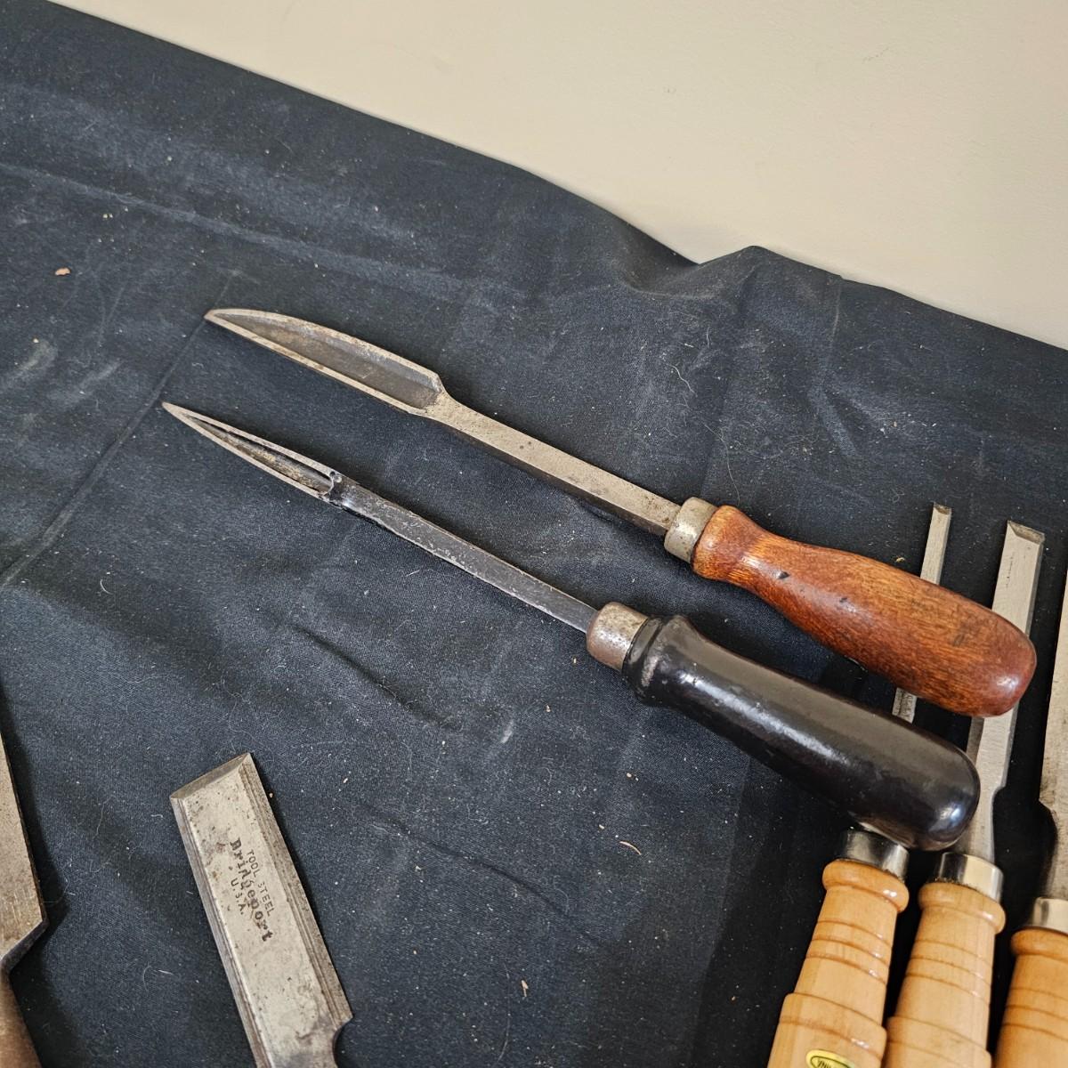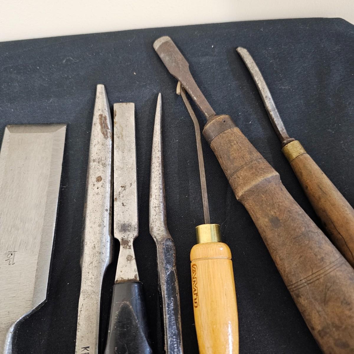 Six piece set of new Delta lathe chisels in original box. Chisels average 18" to 19" in length. Also another smaller set of lathe chisels plus multiple other general chisels and handles. See photos for details. Shipping available.